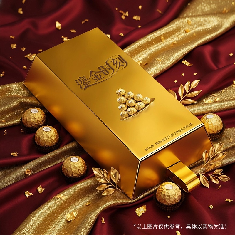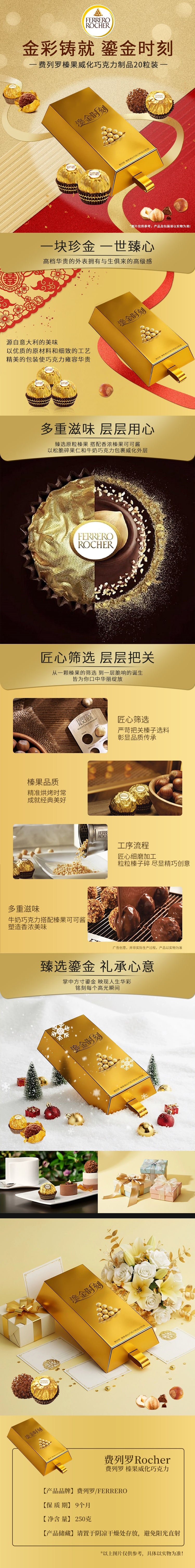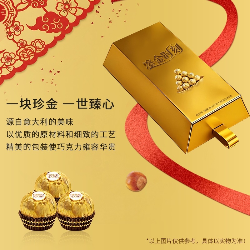 外层榛果碎+威化层+软巧克力+整颗榛子的四重结构;使用意大利皮埃蒙特大区及土耳其的优质榛子;金箔纸独立包裹既保鲜又显奢华