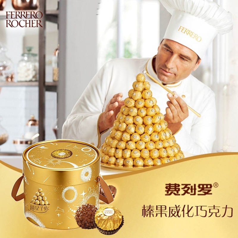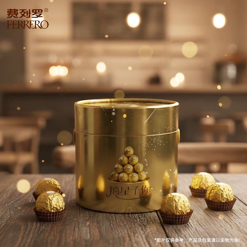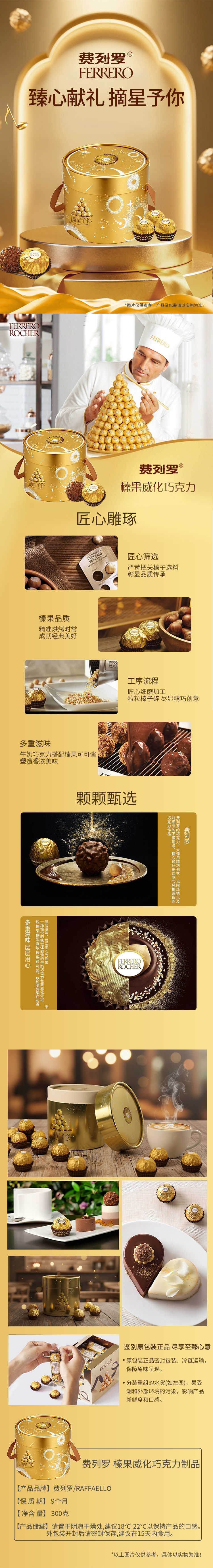 外层榛果碎+威化层+软巧克力+整颗榛子的四重结构;使用意大利皮埃蒙特大区及土耳其的优质榛子;金箔纸独立包裹既保鲜又显奢华