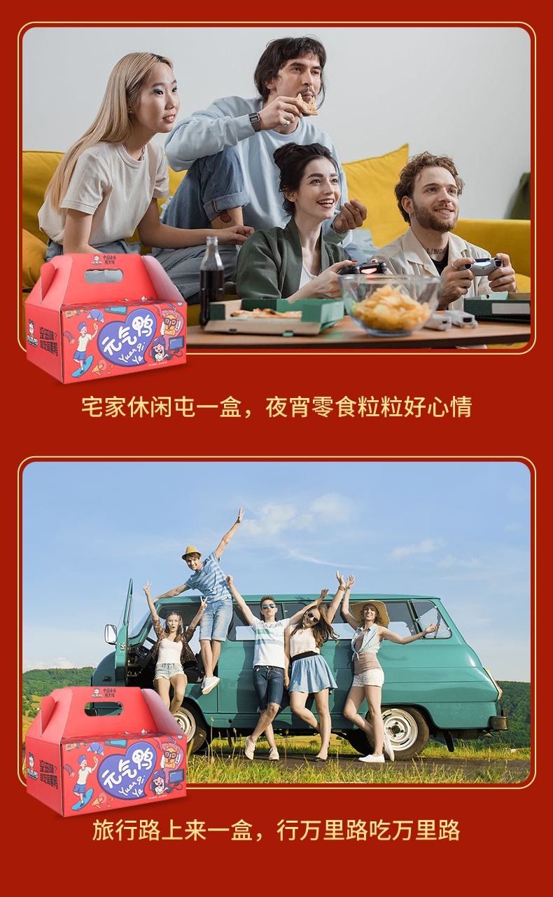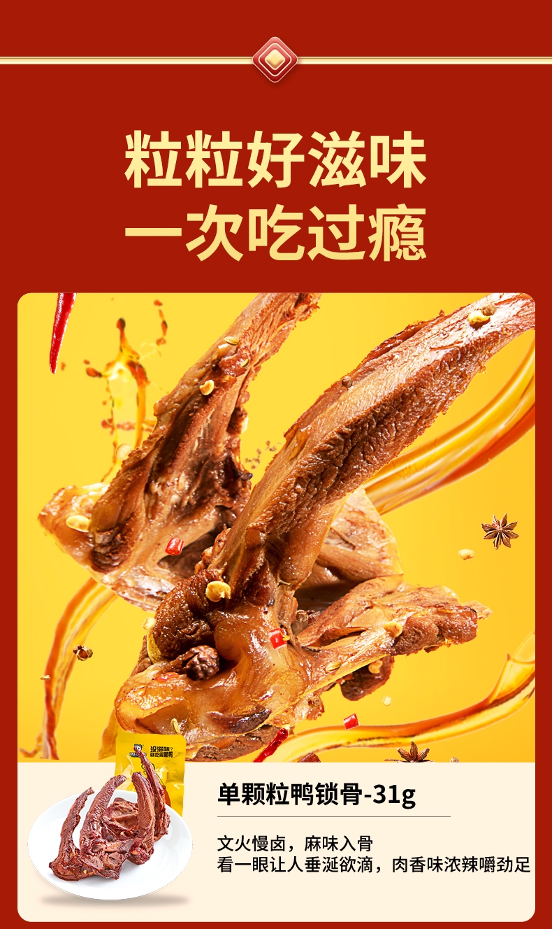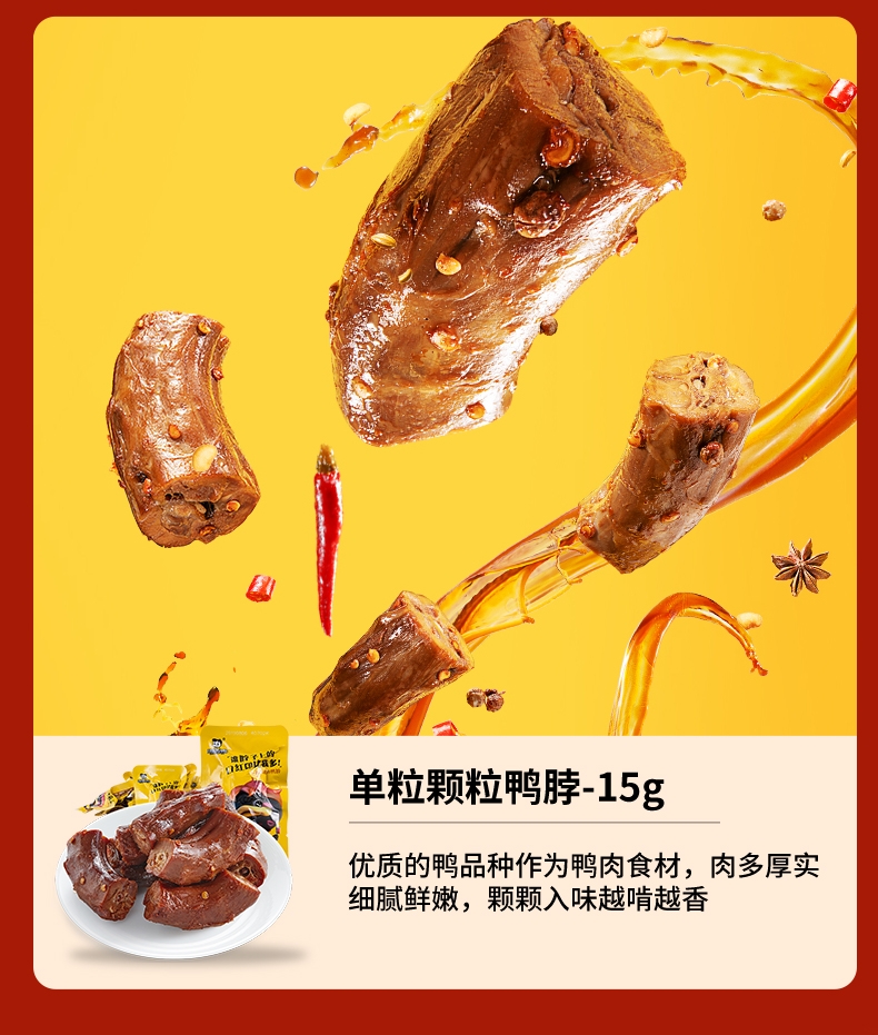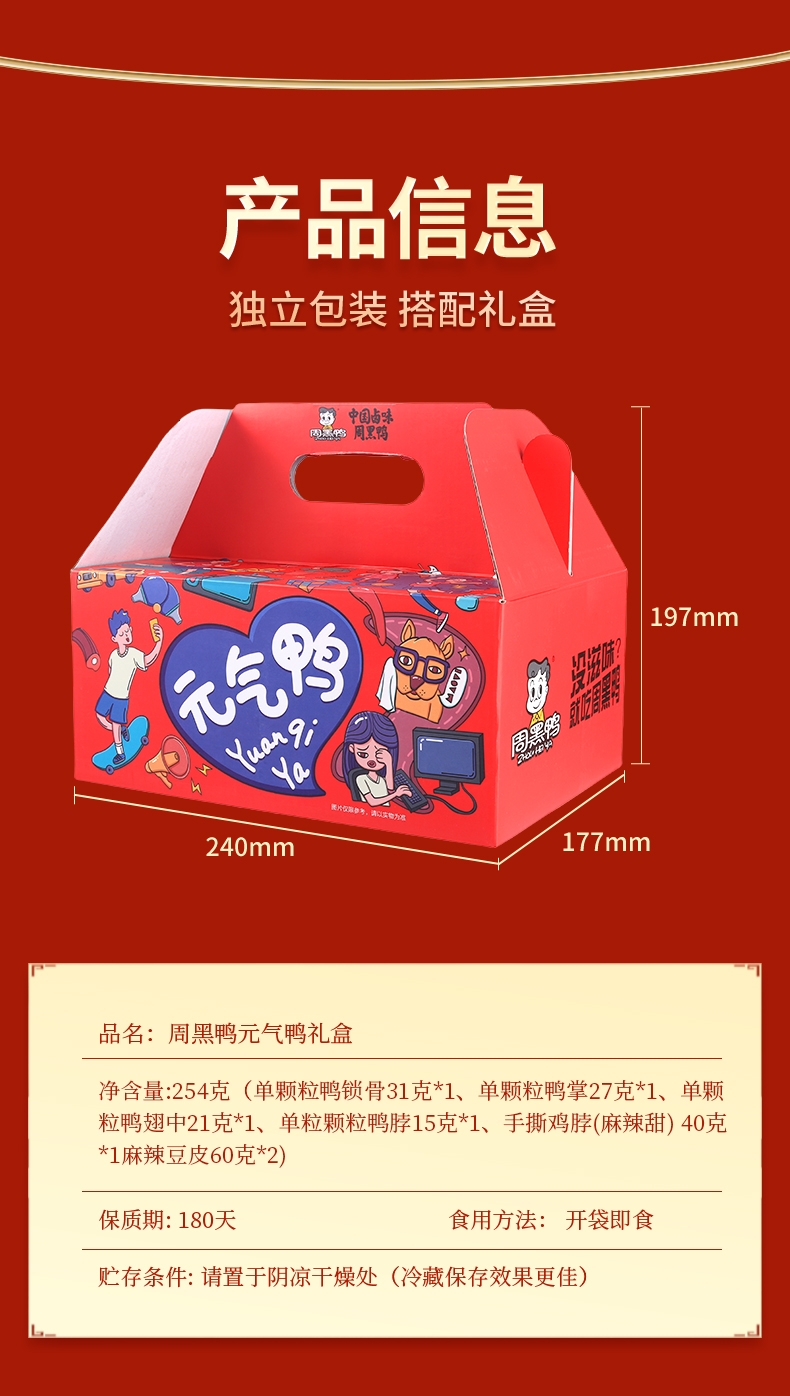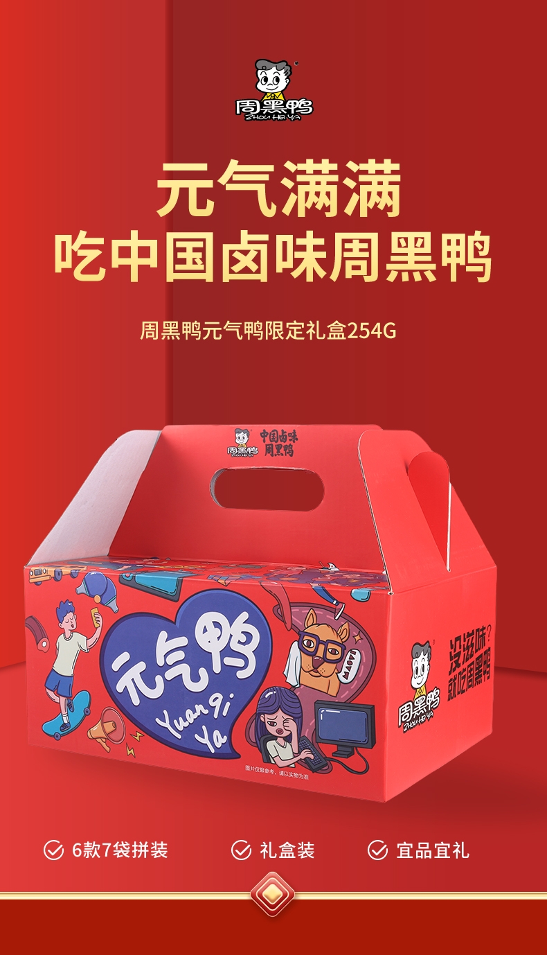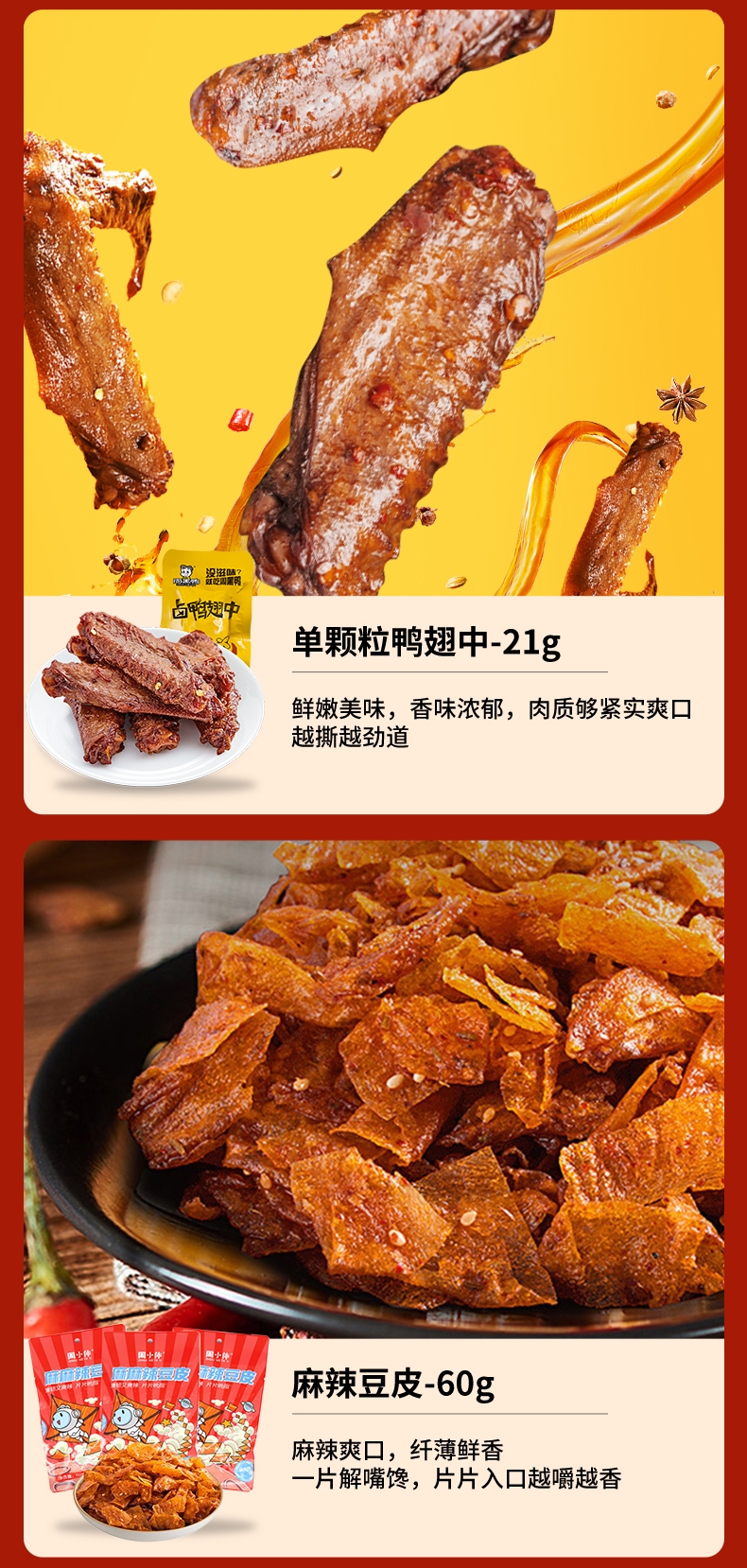 配置清单:周黑鸭卤鸭锁骨31g*1 周黑鸭卤鸭掌27g*1 周黑鸭卤鸭翅中21g*1 周小伴麻辣豆皮60g*2 周黑鸭手撕鸡脖40g*1 周黑鸭卤鸭脖15g*1