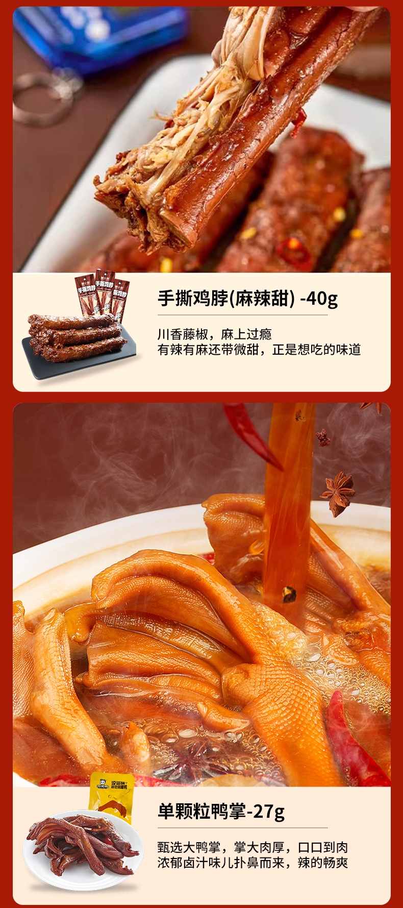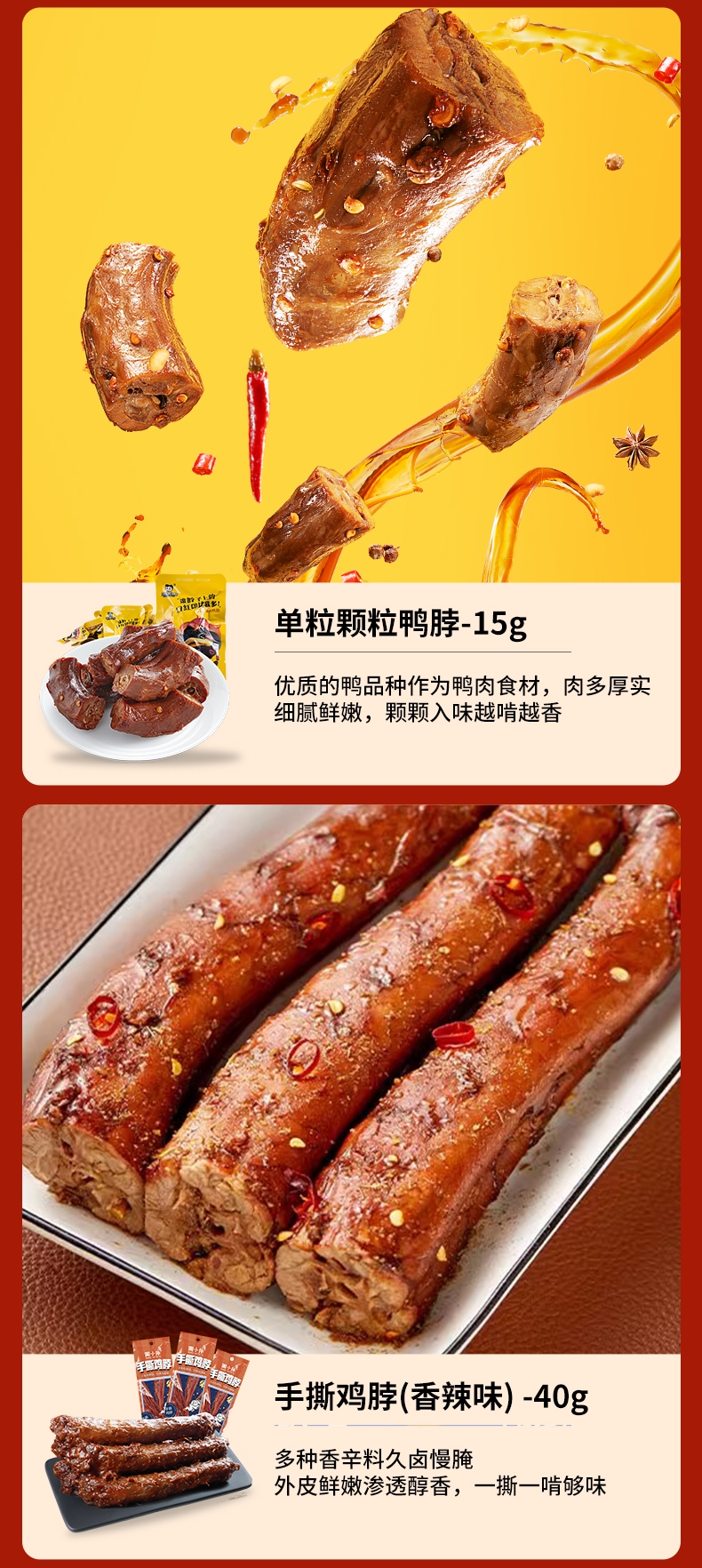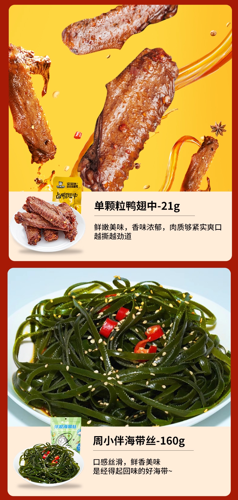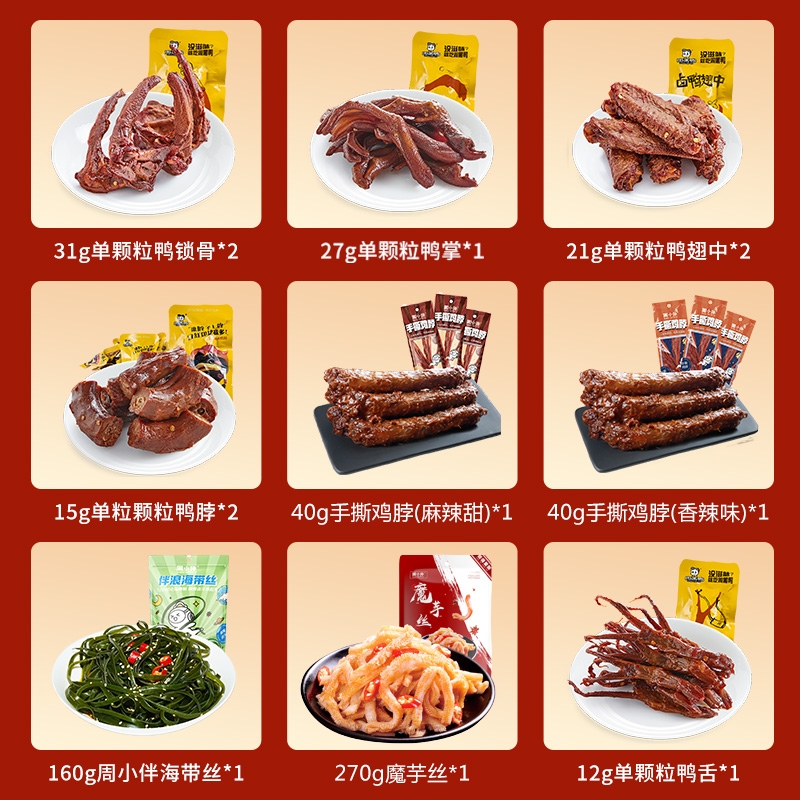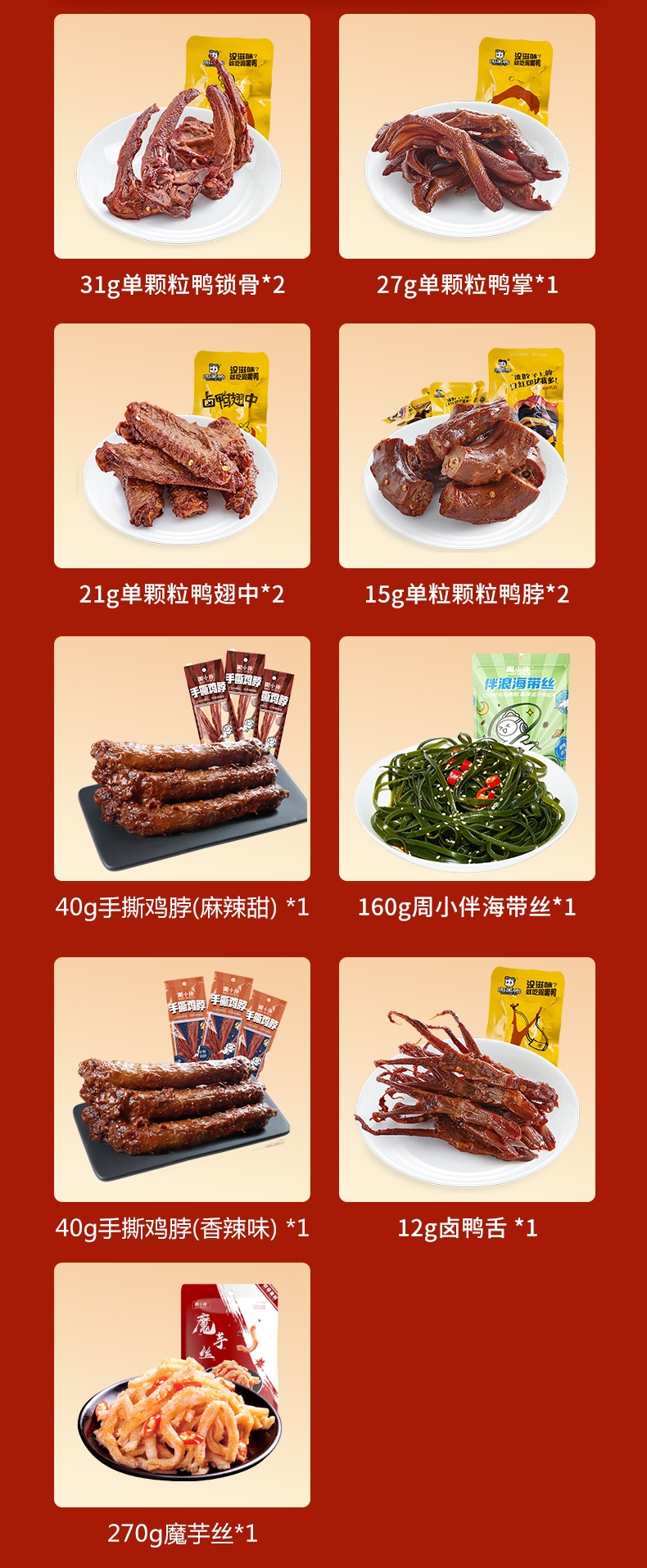 配置清单:周黑鸭卤鸭锁骨31g*2 周黑鸭卤鸭翅中21g*2 周黑鸭卤鸭脖15g*2 周黑鸭鸡脖香辣味40g*1 周黑鸭卤鸭掌27g*1 周黑鸭卤鸭舌12g*1 周黑鸭周小伴海带丝160g*1 周黑鸭鸡脖麻辣甜40g*1 周小伴魔芋丝270g*1