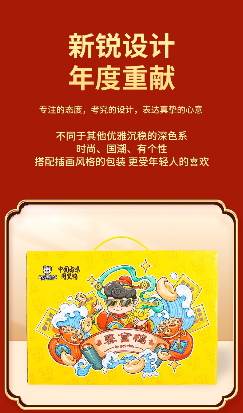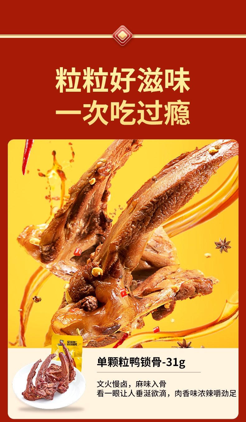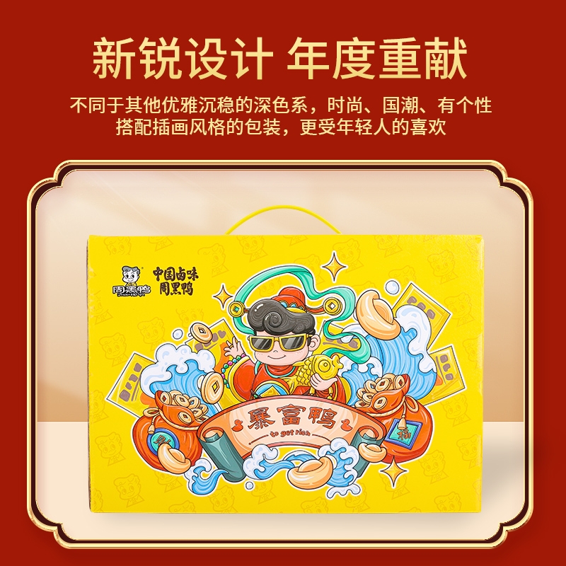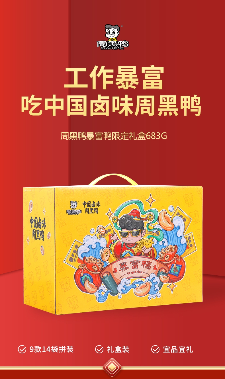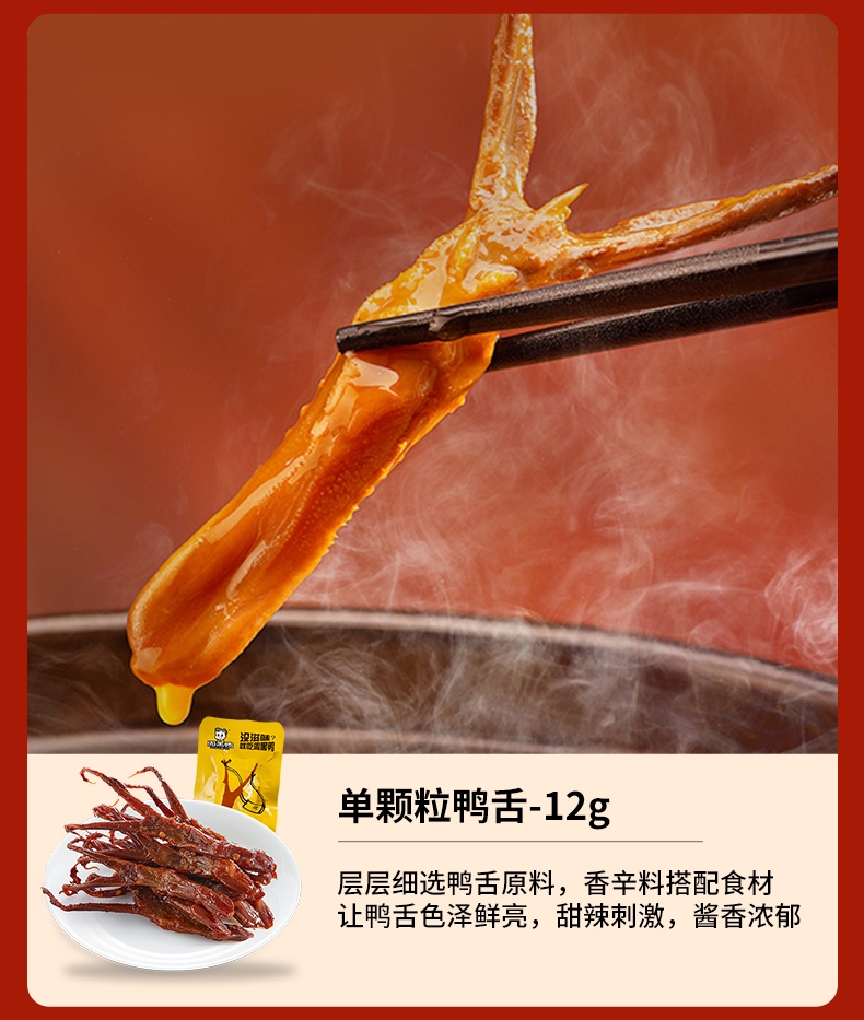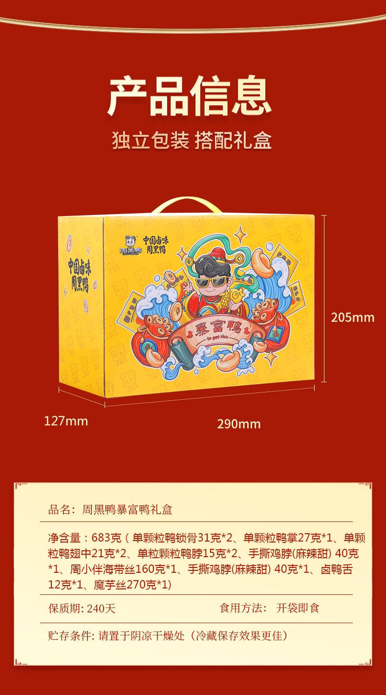 配置清单:周黑鸭卤鸭锁骨31g*2 周黑鸭卤鸭翅中21g*2 周黑鸭卤鸭脖15g*2 周黑鸭鸡脖香辣味40g*1 周黑鸭卤鸭掌27g*1 周黑鸭卤鸭舌12g*1 周黑鸭周小伴海带丝160g*1 周黑鸭鸡脖麻辣甜40g*1 周小伴魔芋丝270g*1