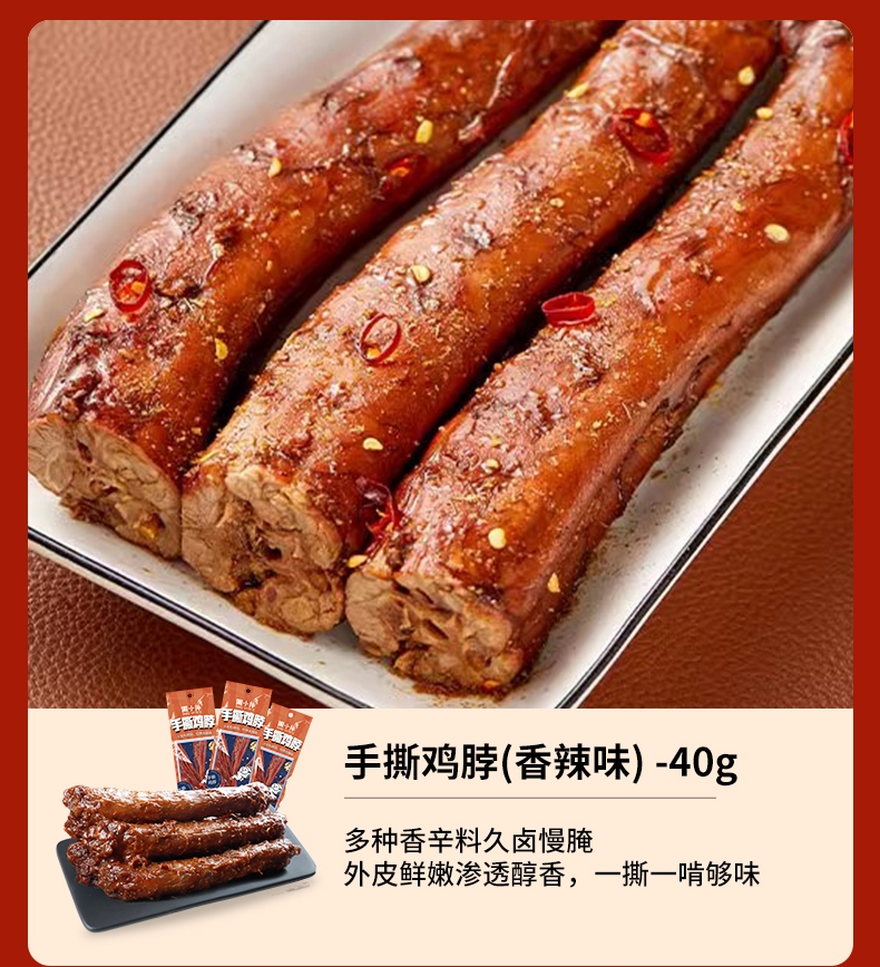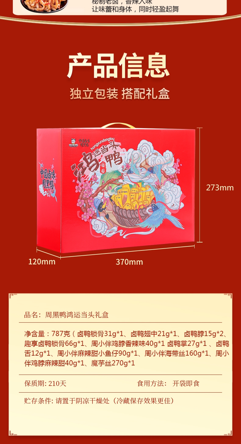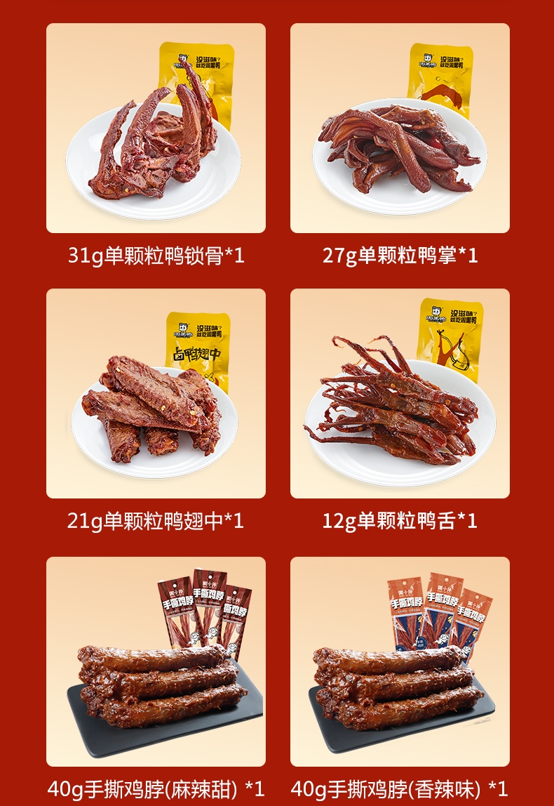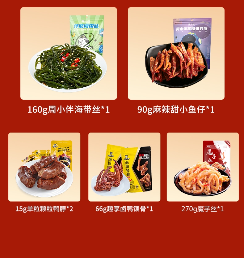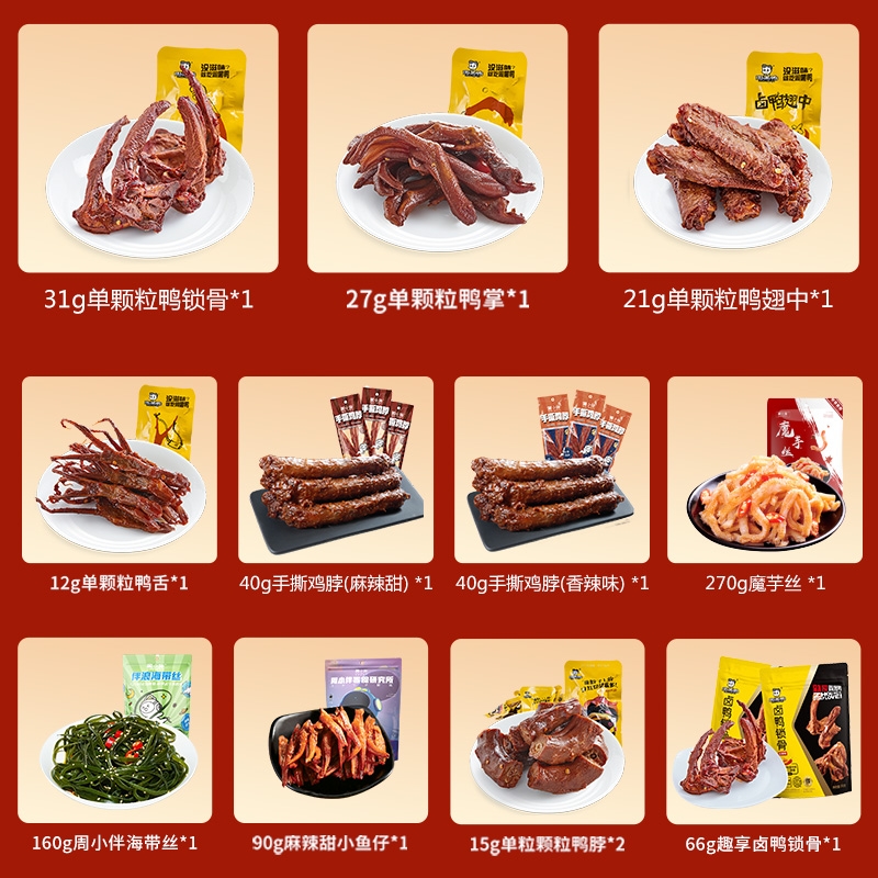 配置清单:周黑鸭卤鸭锁骨31g*1 周黑鸭卤鸭翅中21g*1 周黑鸭卤鸭脖15g*2 周黑鸭趣享卤鸭锁骨66g*1 周小伴鸡脖香辣味40g*1 周黑鸭卤鸭掌27g*1 周黑鸭卤鸭舌12g*1 周小伴麻辣甜小鱼仔90g*1 周小伴海带丝160g*1 周小伴魔芋丝270g*1 周小伴鸡脖麻辣甜40g*1