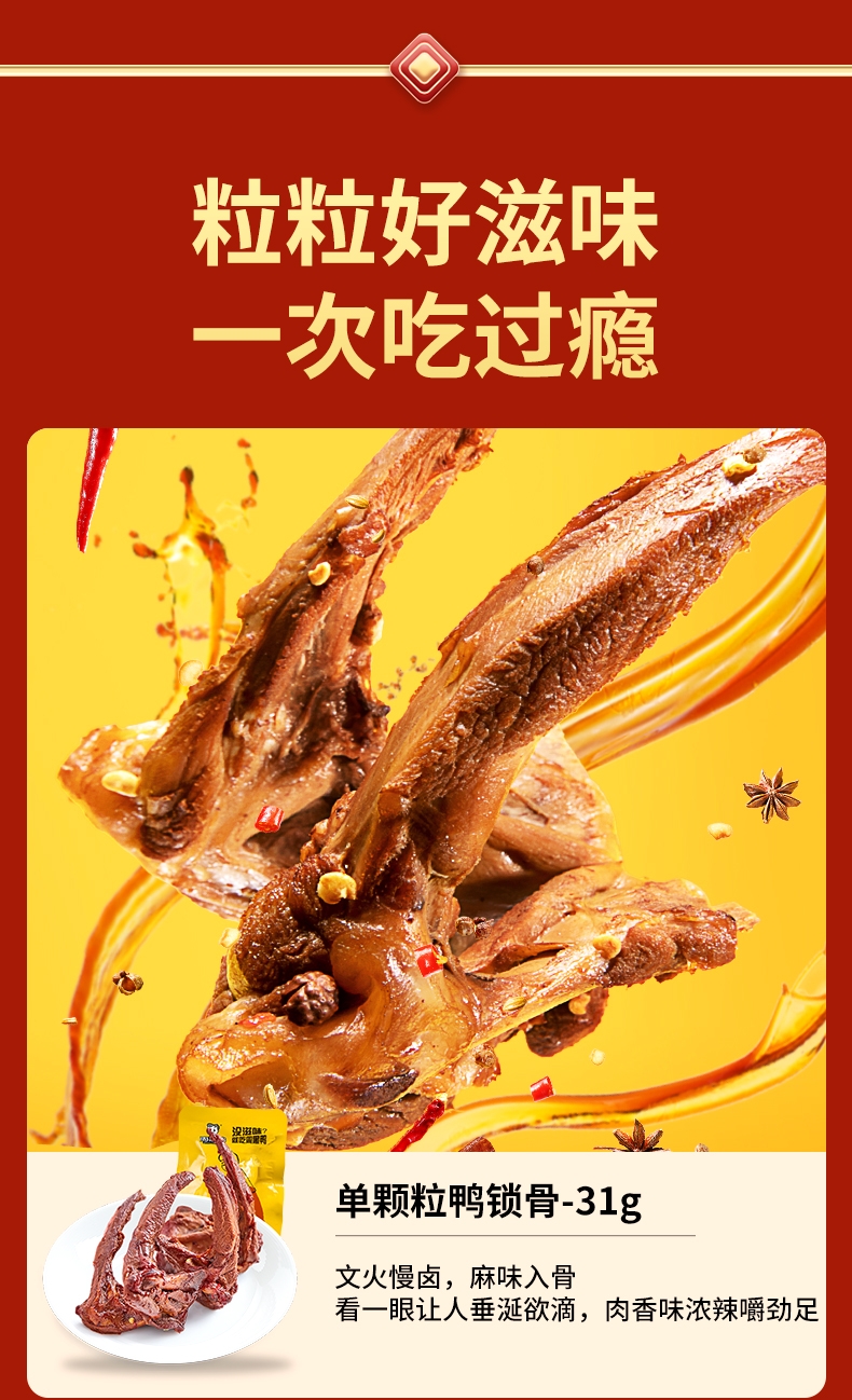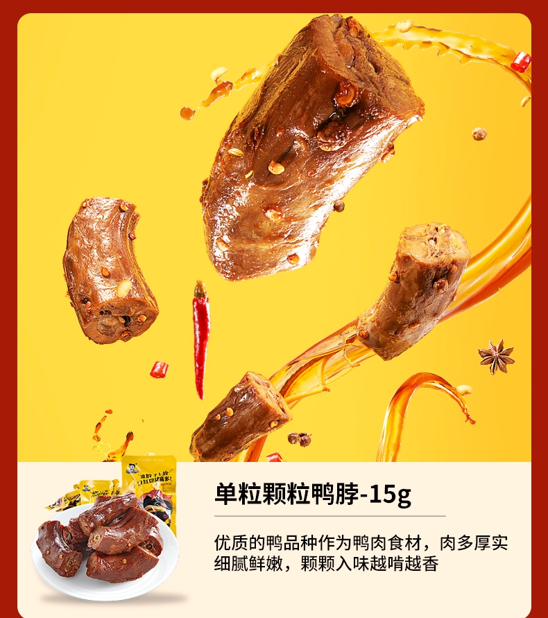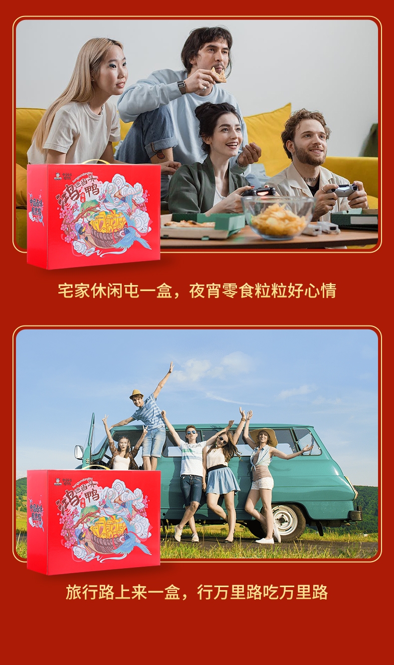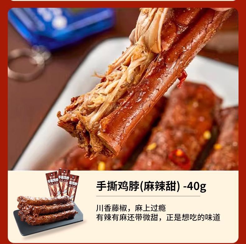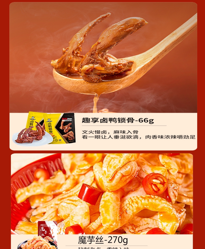 配置清单:周黑鸭卤鸭锁骨31g*1 周黑鸭卤鸭翅中21g*1 周黑鸭卤鸭脖15g*2 周黑鸭趣享卤鸭锁骨66g*1 周小伴鸡脖香辣味40g*1 周黑鸭卤鸭掌27g*1 周黑鸭卤鸭舌12g*1 周小伴麻辣甜小鱼仔90g*1 周小伴海带丝160g*1 周小伴魔芋丝270g*1 周小伴鸡脖麻辣甜40g*1