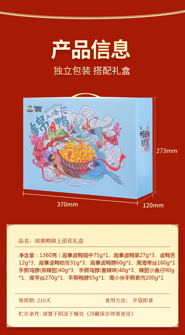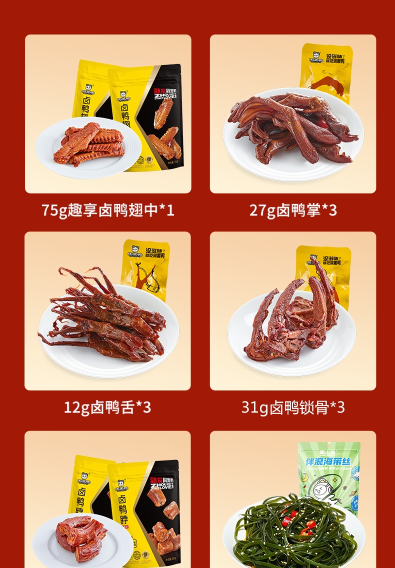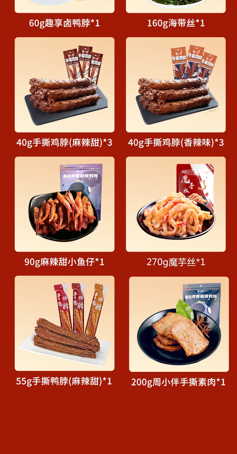 配置清单:周黑鸭趣享卤鸭翅中75g*1 周黑鸭卤鸭掌27g*3 周黑鸭卤鸭舌12g*3 周黑鸭趣享卤鸭锁骨31g*3 周黑鸭趣享卤鸭脖60g*1 周小伴海带丝160g*1 周小伴手撕鸡脖麻辣甜40g*3 周小伴手撕鸡脖香辣味40g*3 周小伴麻辣甜小鱼仔90g*1 周小伴魔芋丝270g*1 周黑鸭手撕鸭脖55g*1 周小伴手撕素肉200g*1