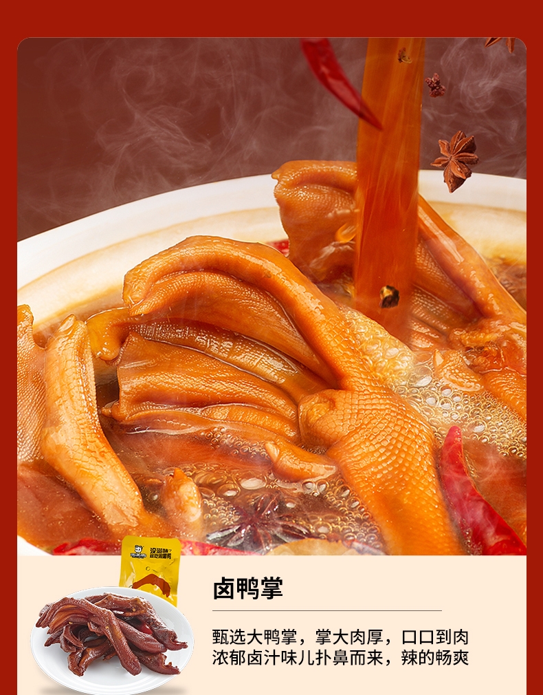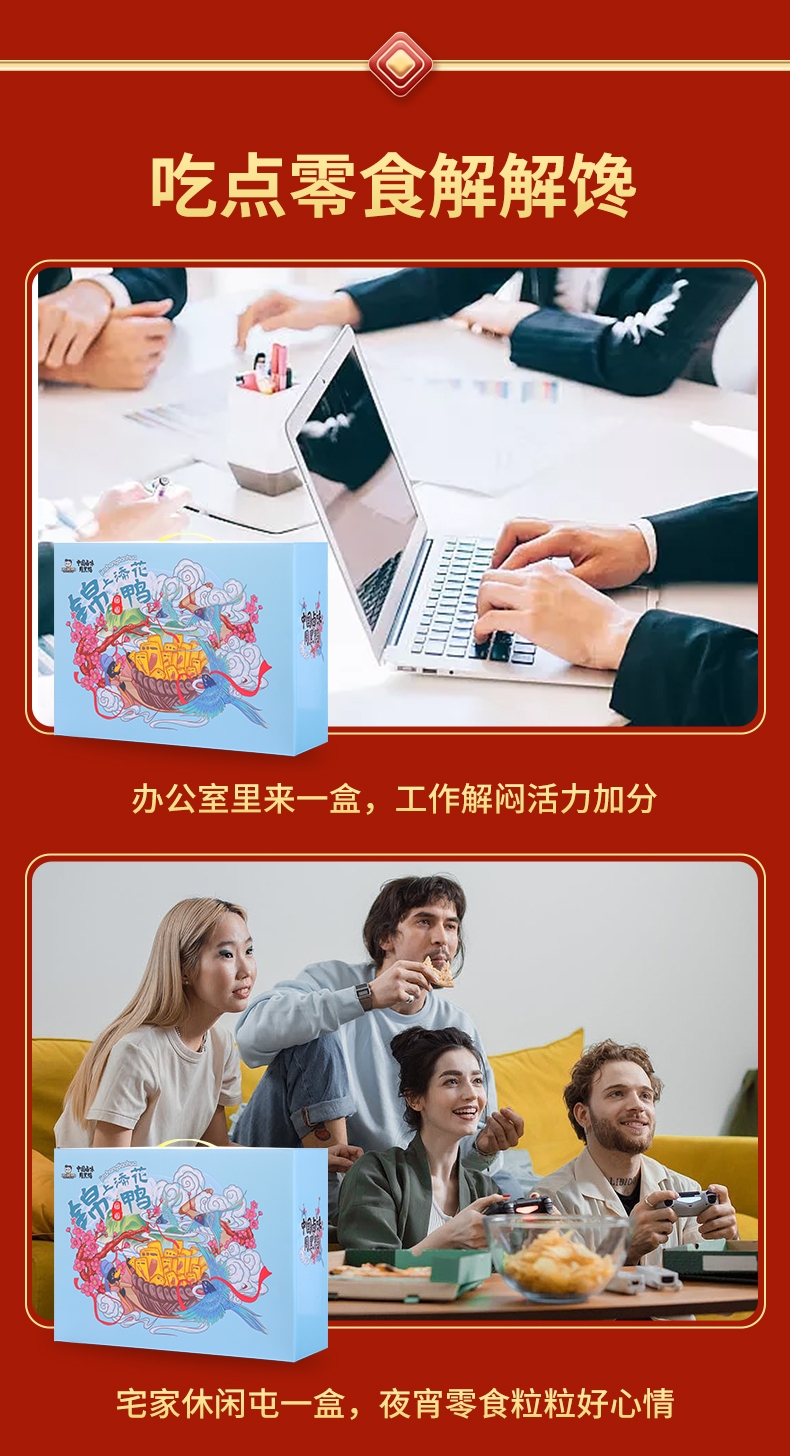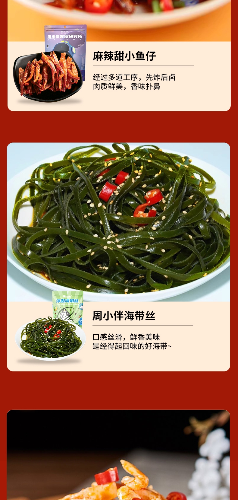 配置清单:周黑鸭趣享卤鸭翅中75g*1 周黑鸭卤鸭掌27g*3 周黑鸭卤鸭舌12g*3 周黑鸭趣享卤鸭锁骨31g*3 周黑鸭趣享卤鸭脖60g*1 周小伴海带丝160g*1 周小伴手撕鸡脖麻辣甜40g*3 周小伴手撕鸡脖香辣味40g*3 周小伴麻辣甜小鱼仔90g*1 周小伴魔芋丝270g*1 周黑鸭手撕鸭脖55g*1 周小伴手撕素肉200g*1
