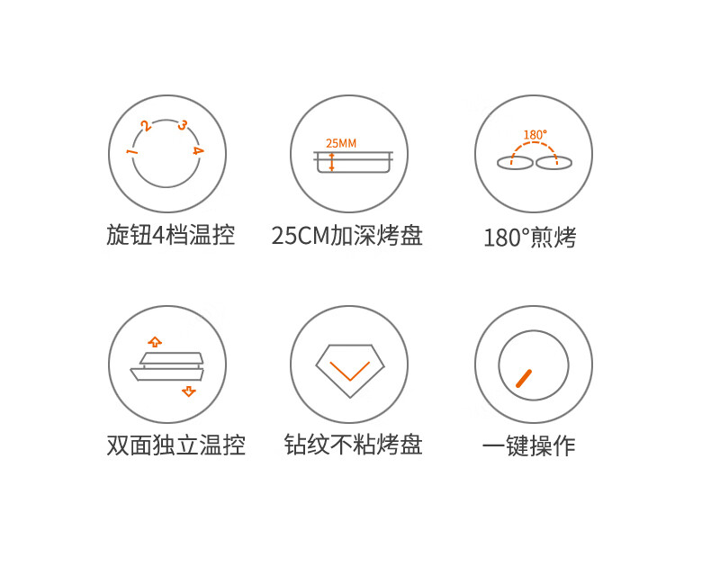 25mm深烤盘 让食物充分膨起 ;180°开合,双面同时煎烤;650W双火力加热 烤出酥脆口感