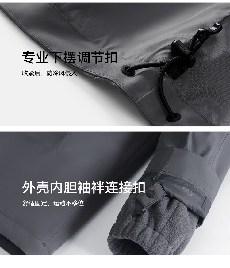 魔术贴袖口, 调节方便;可调节帽口,防冷风侵入;下摆可收紧 ,不给寒风钻空子