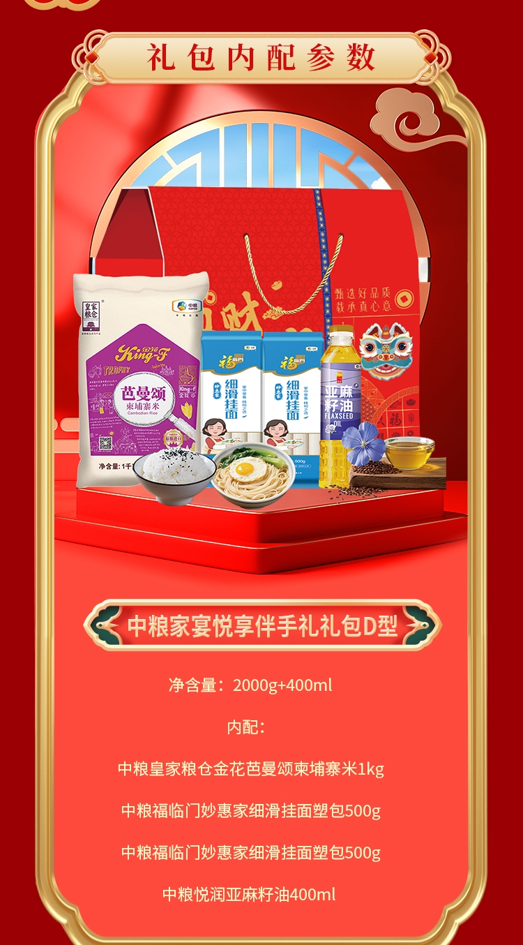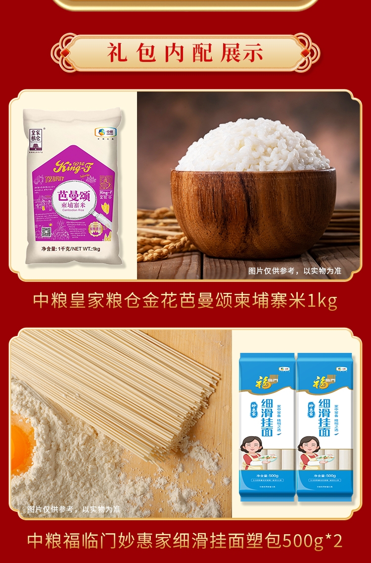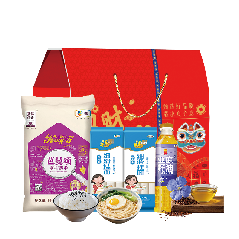 配置清单:净含量:2000g+400ml 内配: 中粮金花芭曼颂柬埔寨米1kg 中粮福临门妙惠家细滑挂面塑包500g 中粮福临门妙惠家细滑挂面塑包500g 中粮悦润亚麻籽油400ml