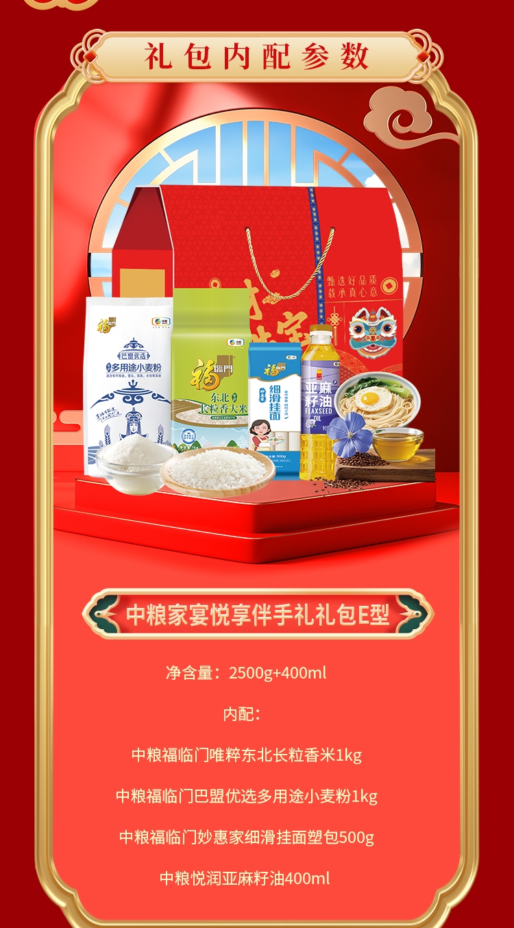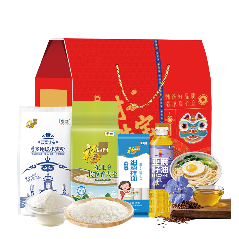 配置清单:净含量:2500g+400ml 内配: 中粮福临门唯粹东北长粒香米 1kg 中粮福临门巴盟优选多用途小麦粉1kg 中粮福临门妙惠家细滑挂面塑包500g 中粮悦润亚麻籽油400ml