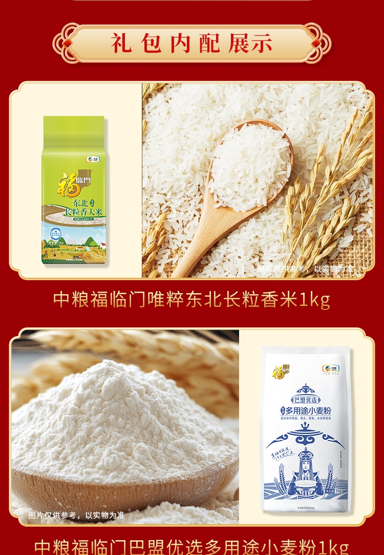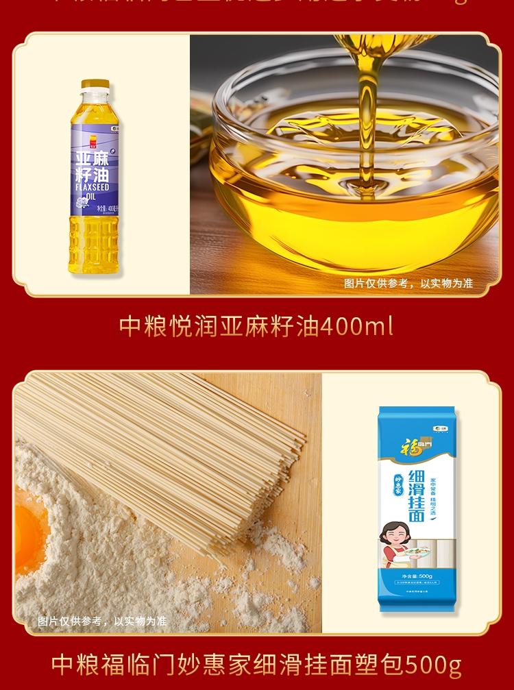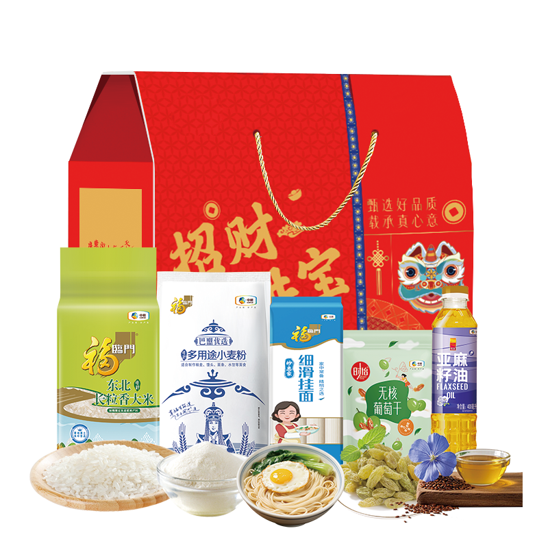 配置清单:净含量:2628g+400ml 内配: 中粮福临门唯粹东北长粒香米1kg 中粮福临门巴盟优选多用途小麦粉1kg 中粮福临门妙惠家细滑挂面塑包500g 中粮悦润亚麻籽油400ml 中粮时怡无核葡萄干128g