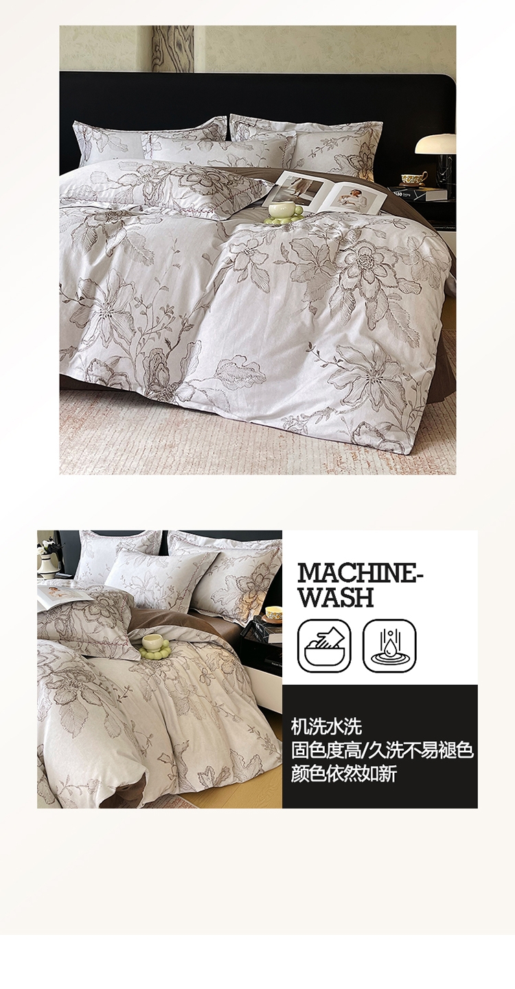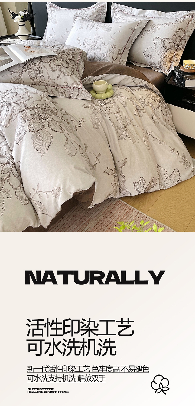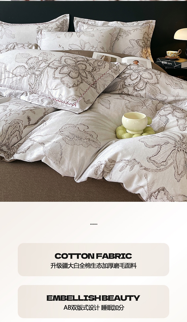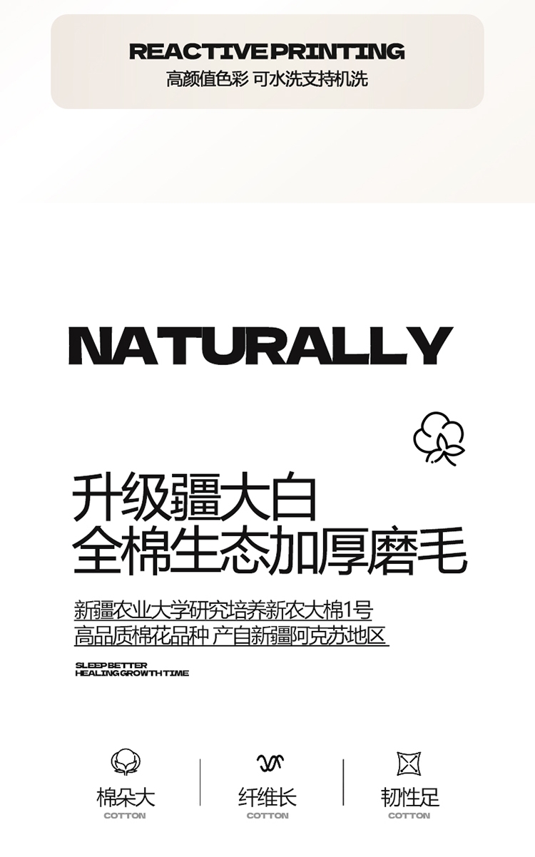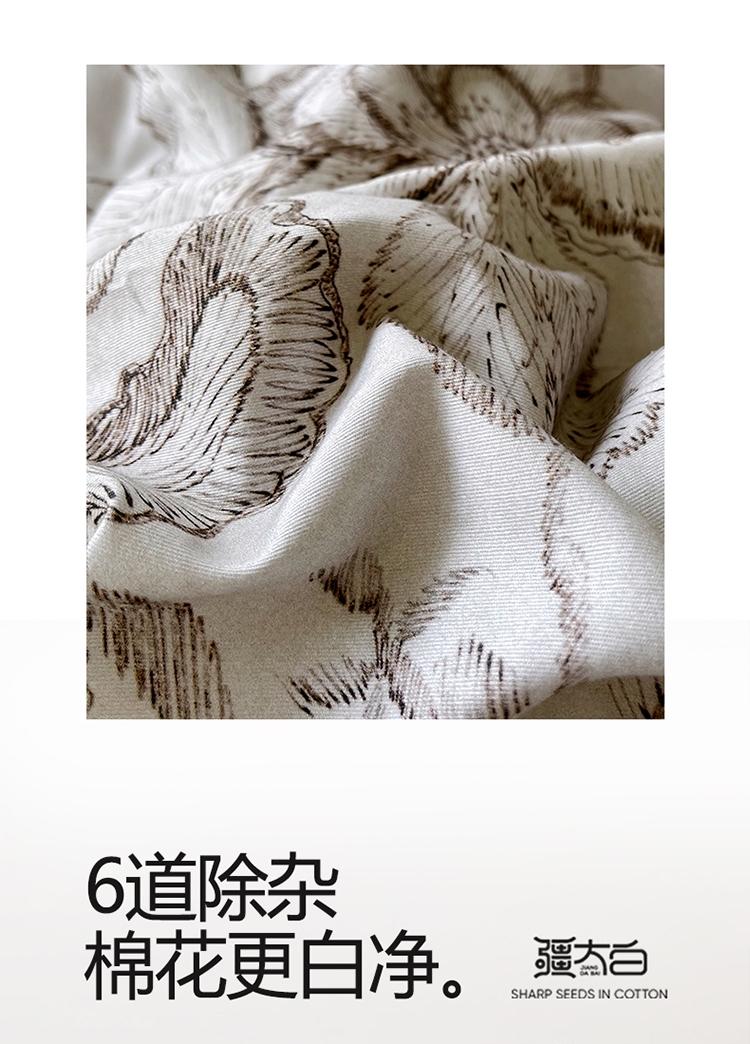 全棉磨毛面料,软糯贴肤触感,柔滑细腻感知好睡眠;活性印染工艺,色泽靓丽不易褪色;新一代活性印染工艺,固色度更加持久不易褪色