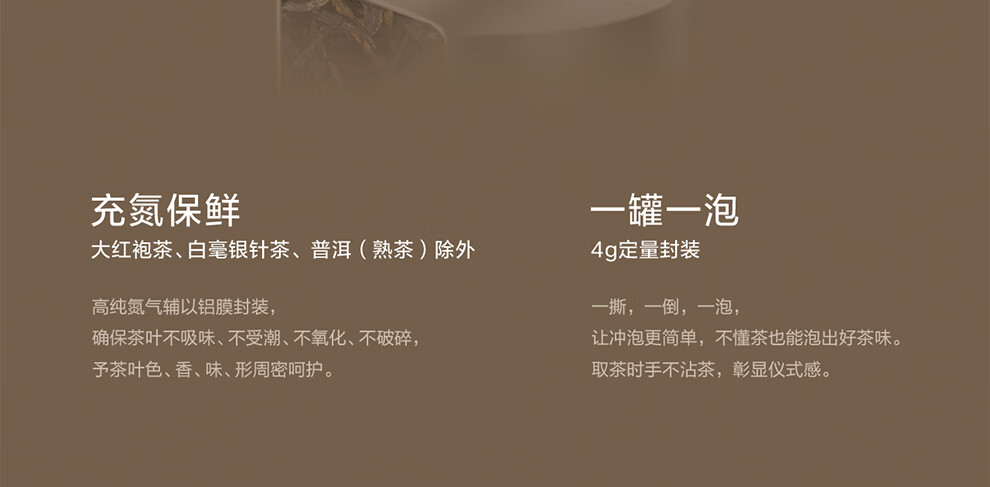 一罐一泡 ,4g定量封装;条索紧结,稍扭曲、色泽乌褐;汤色深橙黄明亮