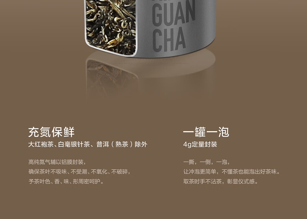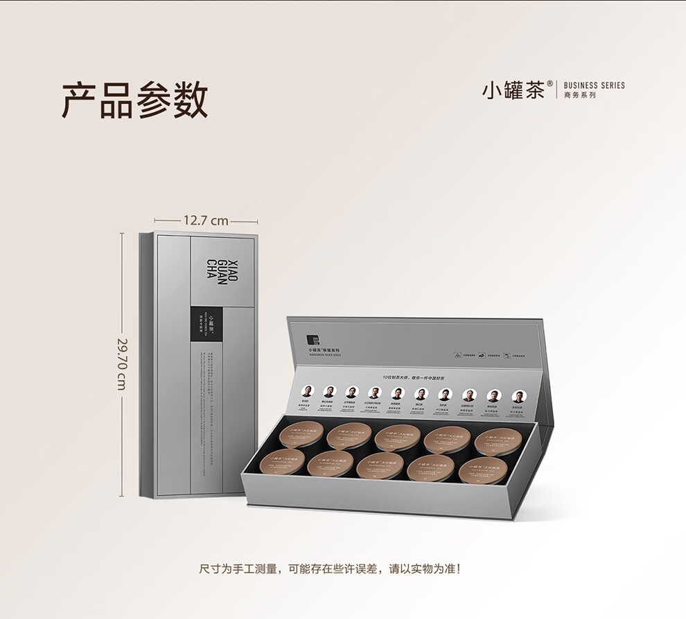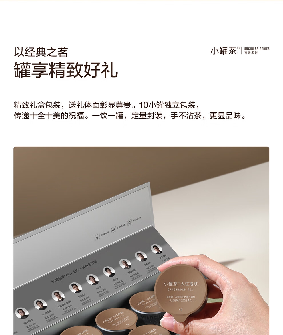 精致礼盒包装,送礼体面彰显尊贵;10小罐独立包装,传递十全十美的祝褔;一饮一罐,定量封装,手不沾茶,更显品味。