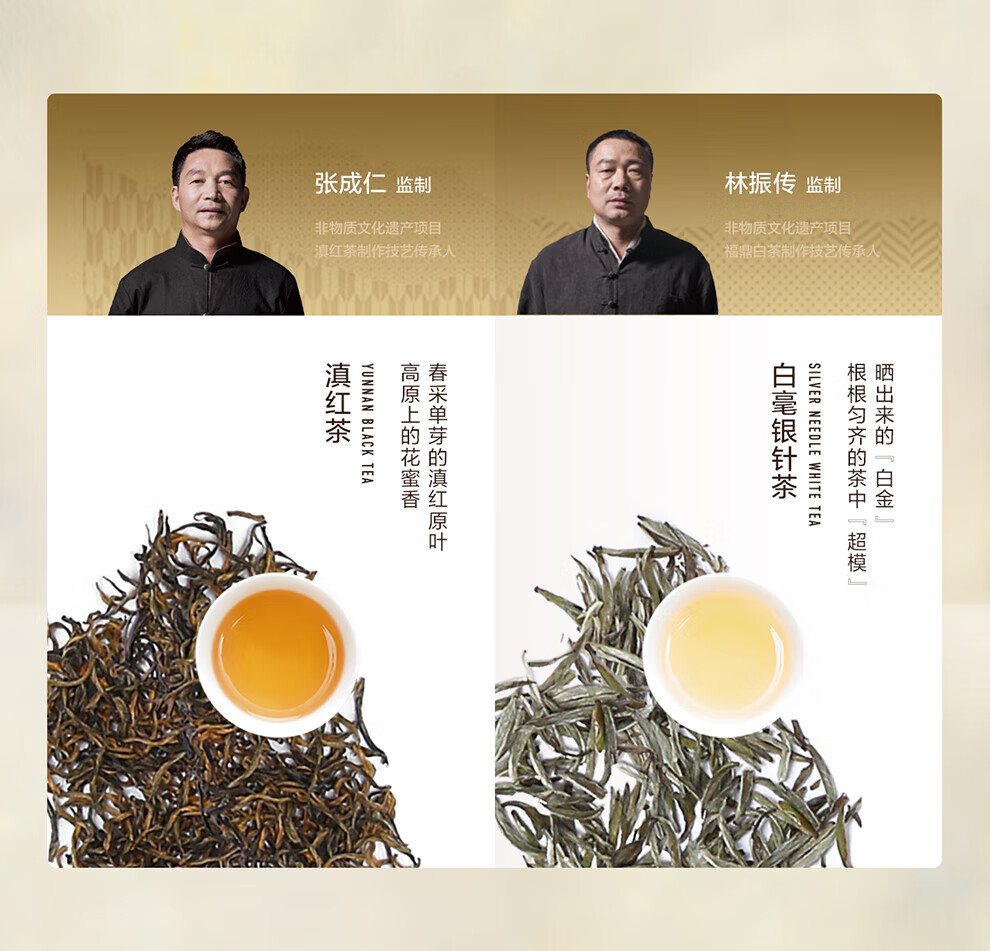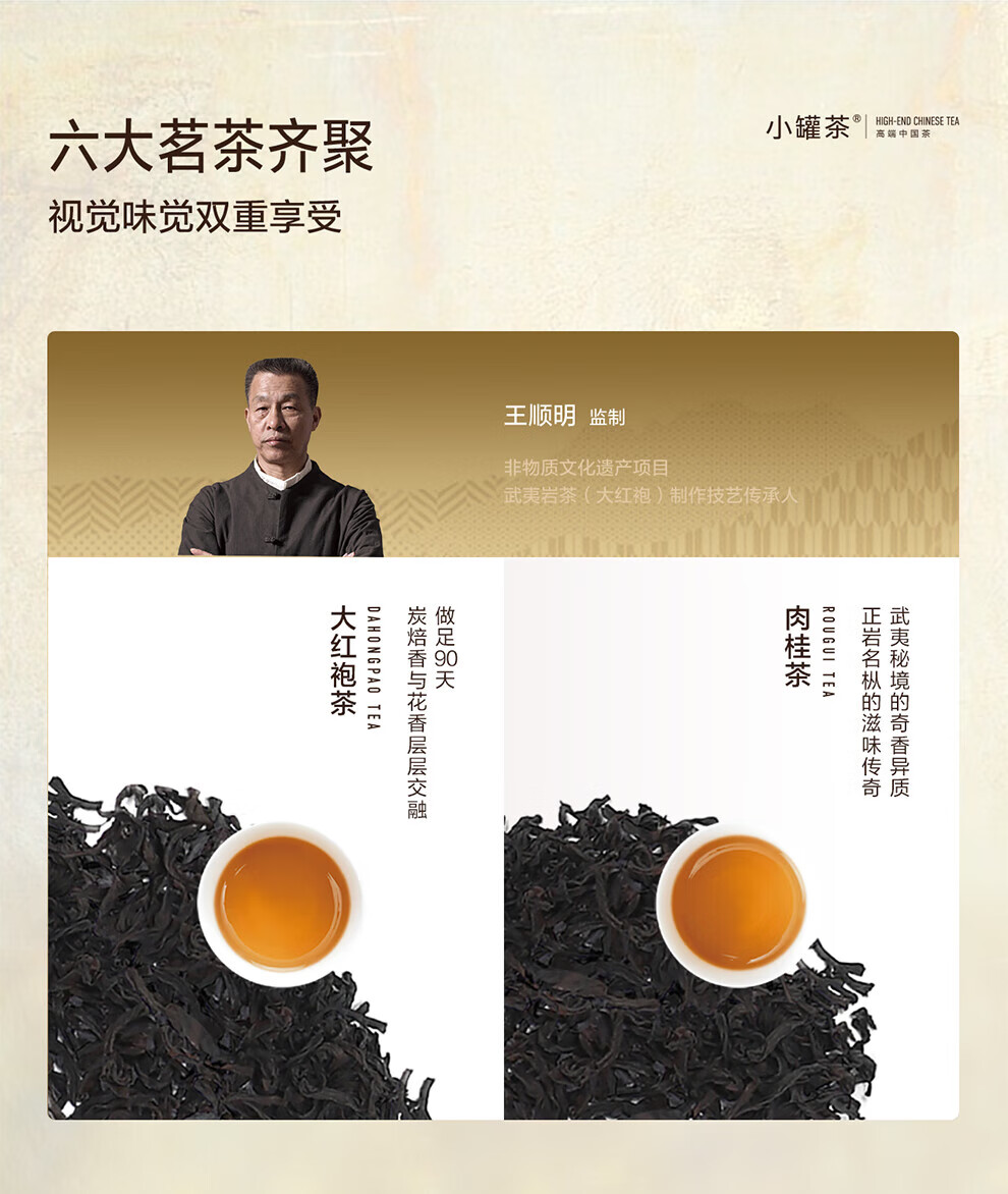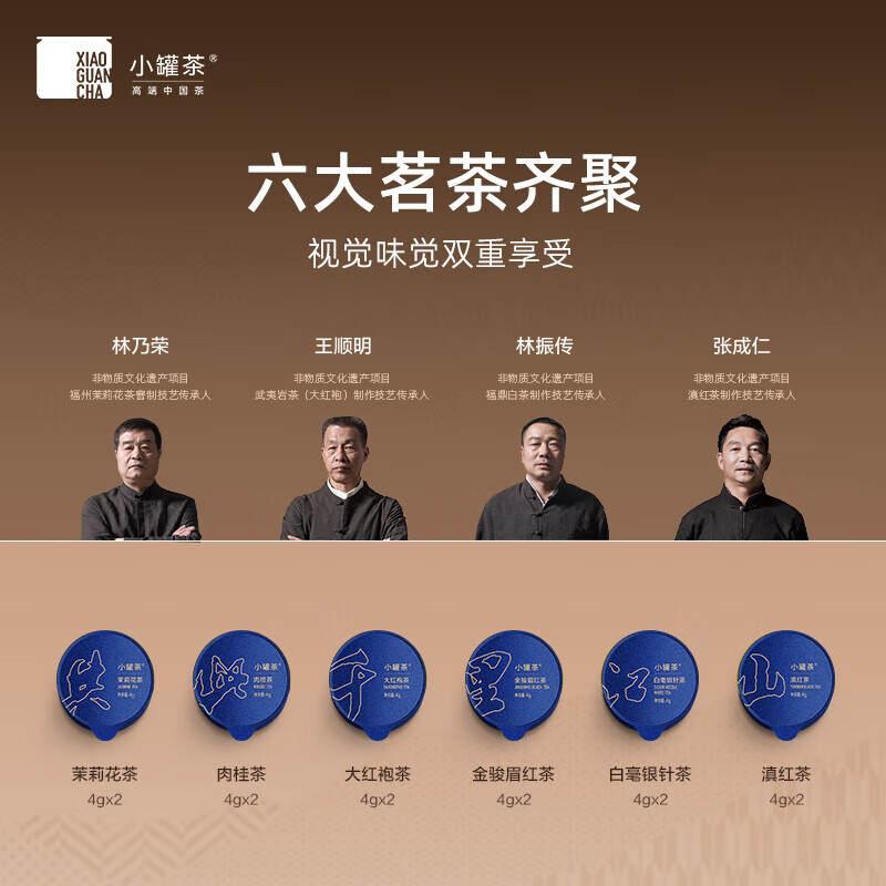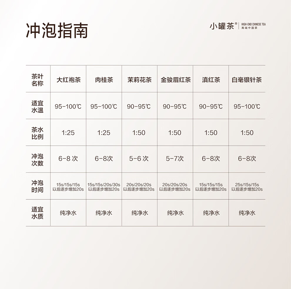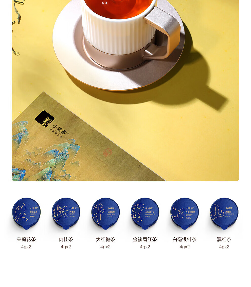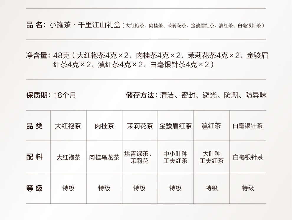 配置:大红袍4g*2 肉桂4g*2 滇红4g*2 茉莉花4g*2 白毫银针4g*2 金骏眉4g*2