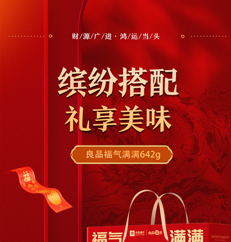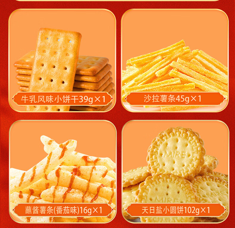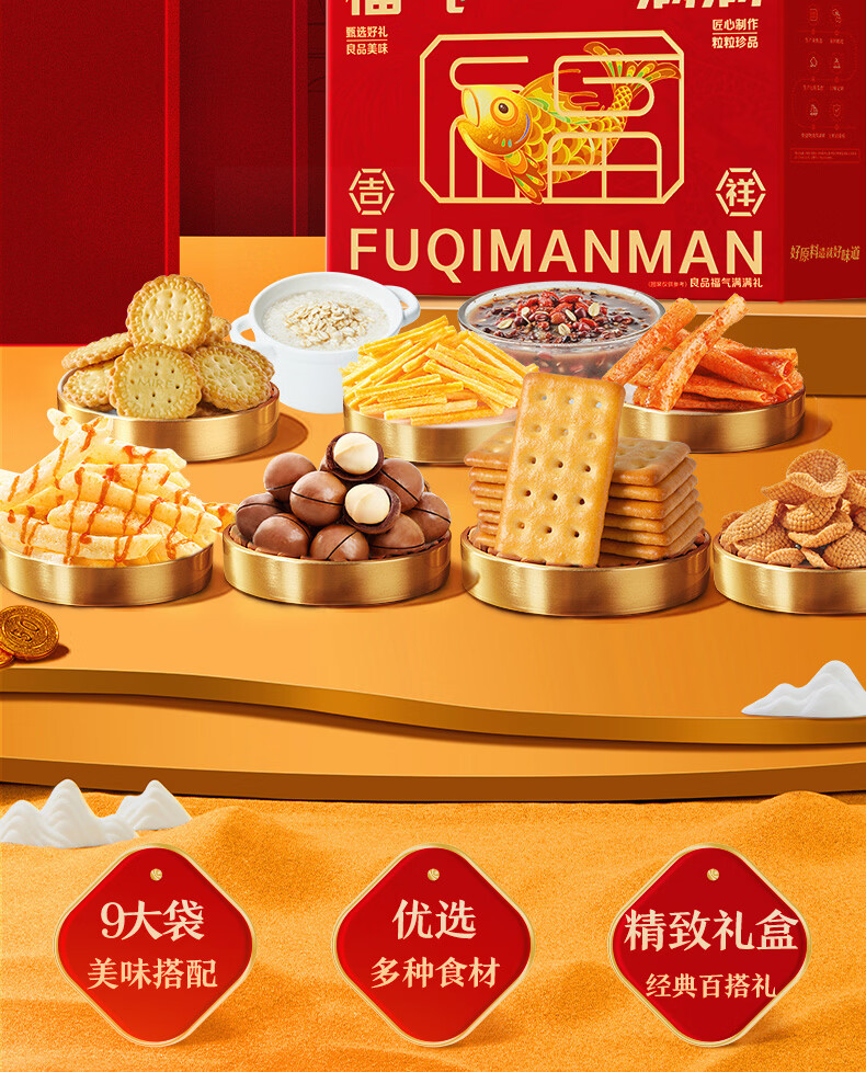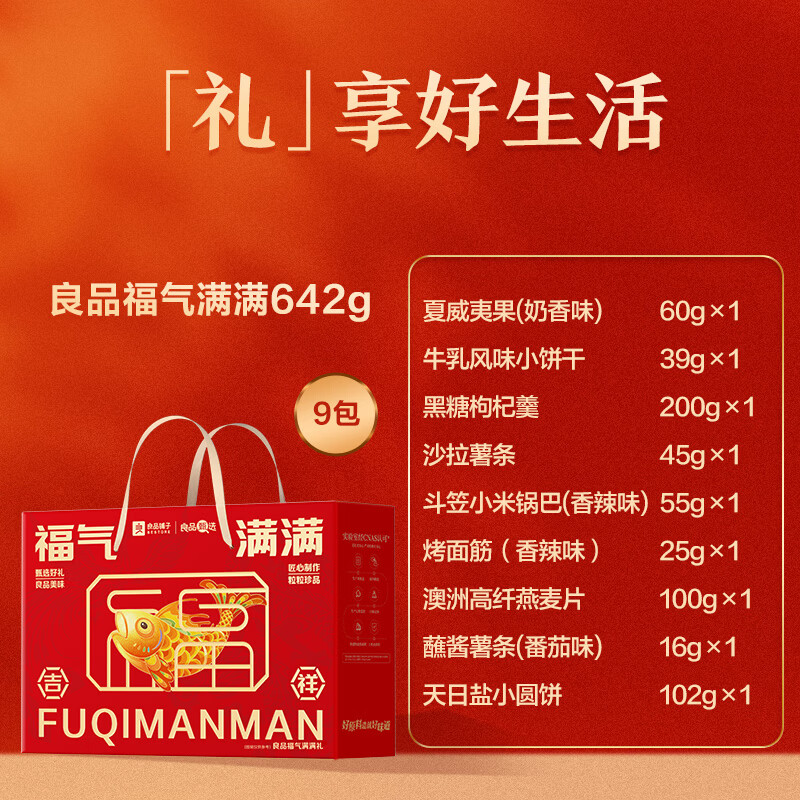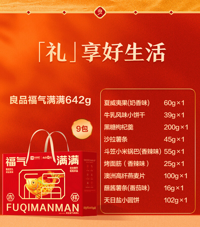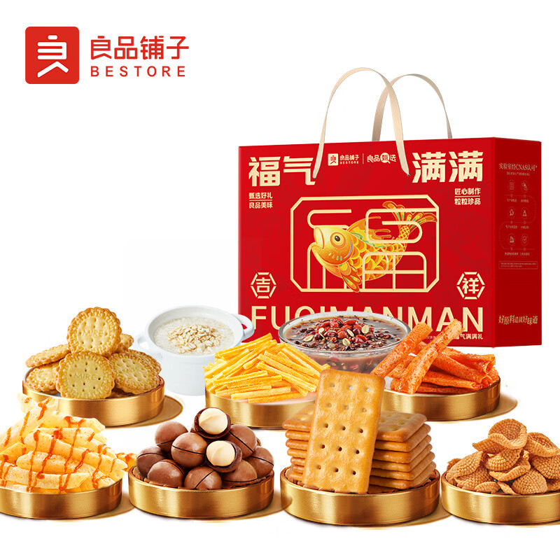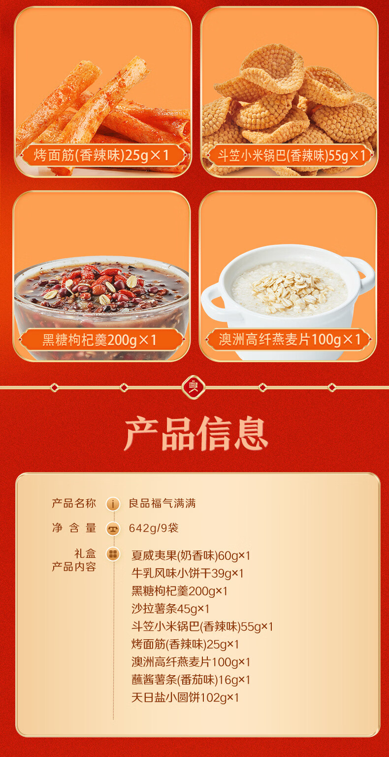 配置:【良品铺子】夏威夷果(奶香味)60g 【良品铺子】牛乳风味小饼干39g 【良品铺子】黑糖枸杞羹(八宝粥)200g 【良品铺子】沙拉薯条(膨化食品)45g 【良品铺子】斗笠小米锅巴(香辣味)55g 【良品铺子】烤面筋(香辣味)25g 【良品铺子】澳洲高纤燕麦片100g 【良品铺子】蘸酱薯条(番茄味)16g 【良品铺子】天日盐小圆饼102g