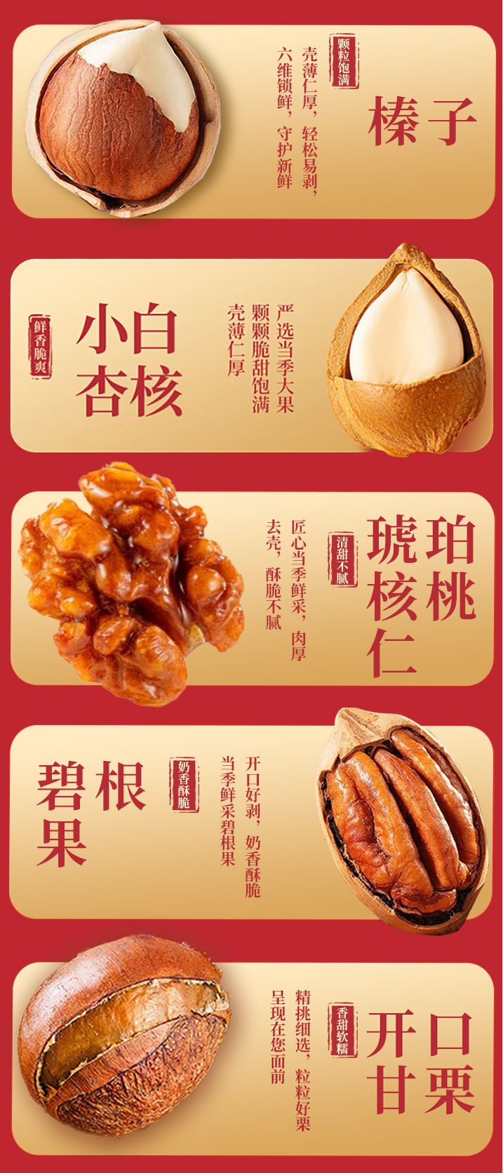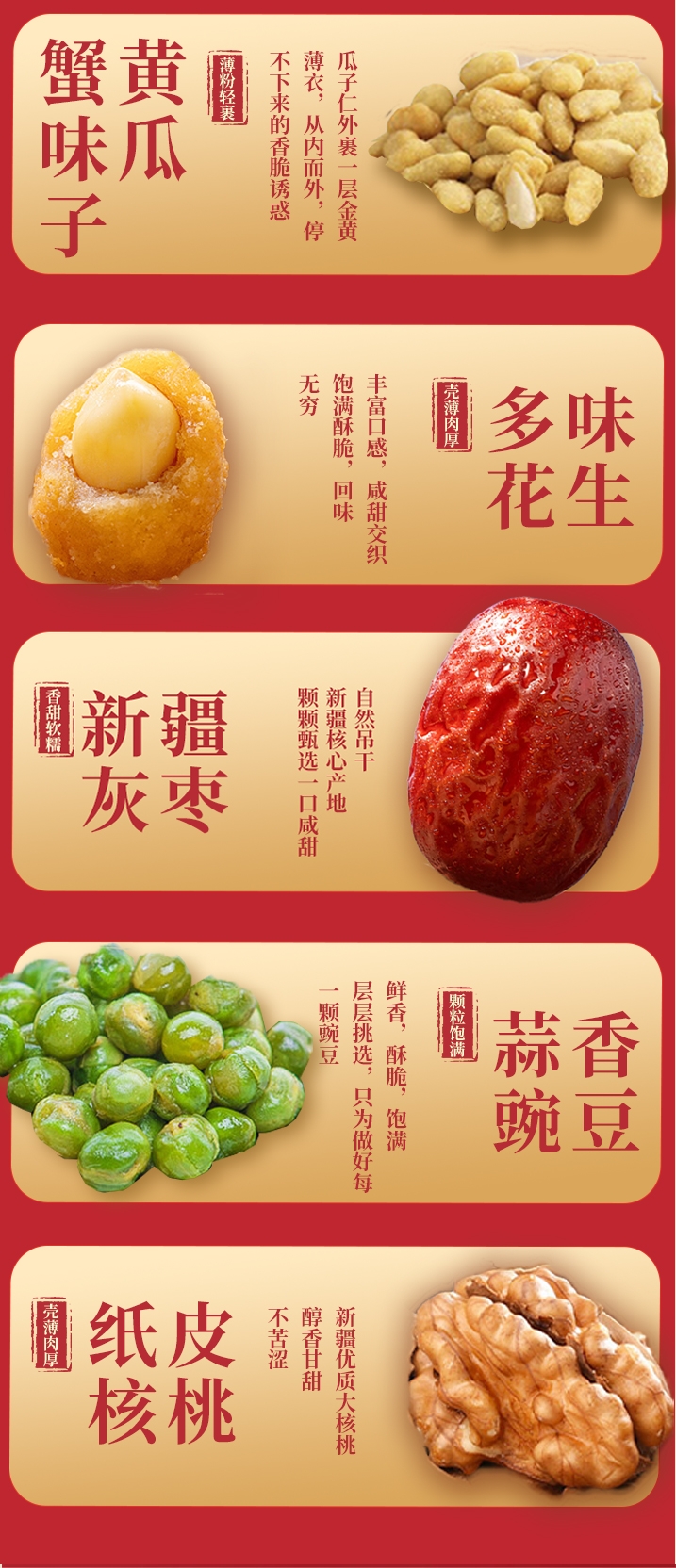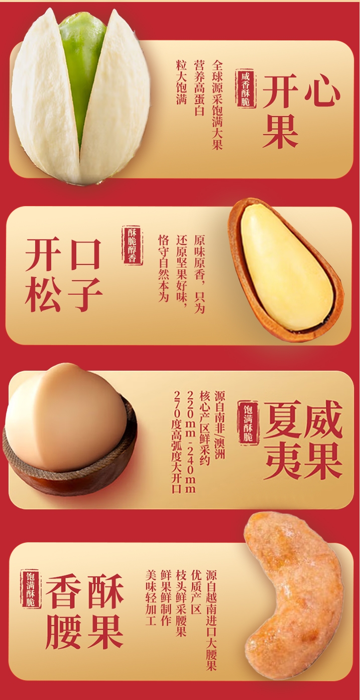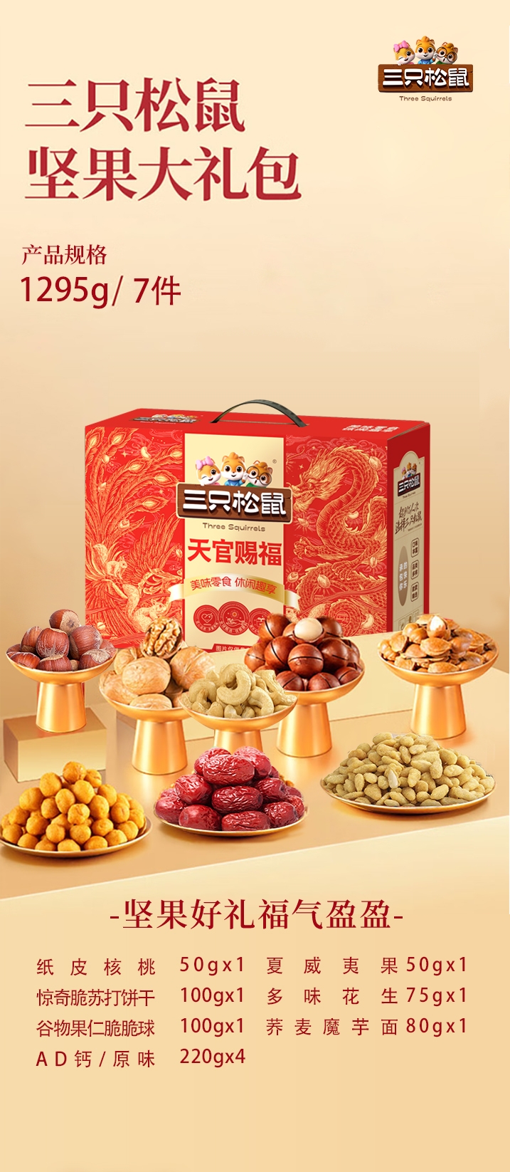 配置清单:中袋装_纸皮核桃 50g 夏威夷果 50g 多味花生 75g 惊奇脆苏打饼干/海盐味 100g 谷物果仁脆脆球 60g 荞麦魔芋面/火鸡味 80g 饮料_AD钙/原味220g*4瓶*1排 880g