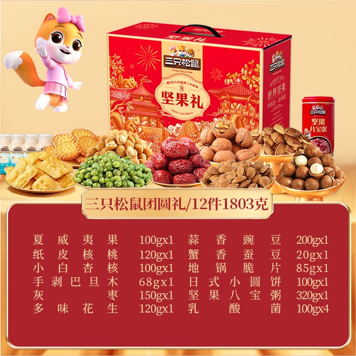 配置清单:大头装_夏威夷果/++/100g(坚果礼专供) 100g 大头装_小白杏核/++/100g 100g 大头装_手剥巴旦木/++/100g 100 坚果礼专供_板栗仁/++/100g 100 中袋装_开心果/++/100g 100 中袋装_纸皮核桃/原味/120g 120 大头装_多味花生/++/120g(甄选) 120 大头装_蒜香豌豆/++/120g(甄选) 120 大头装_蟹香蚕豆/++/120g(甄选) 120 大头装_蟹黄味瓜子仁/++/180g(甄选) 180 礼包专供_0蔗糖沙琪玛/鸡蛋味/200g 200 终端专供_小圆饼/奶盐味/100g 100 饮料_坚果果干粥_坚果八宝粥(FX)/++/320g 320 饮料_乳酸菌/原味/100g*4瓶*1排(FX) 400