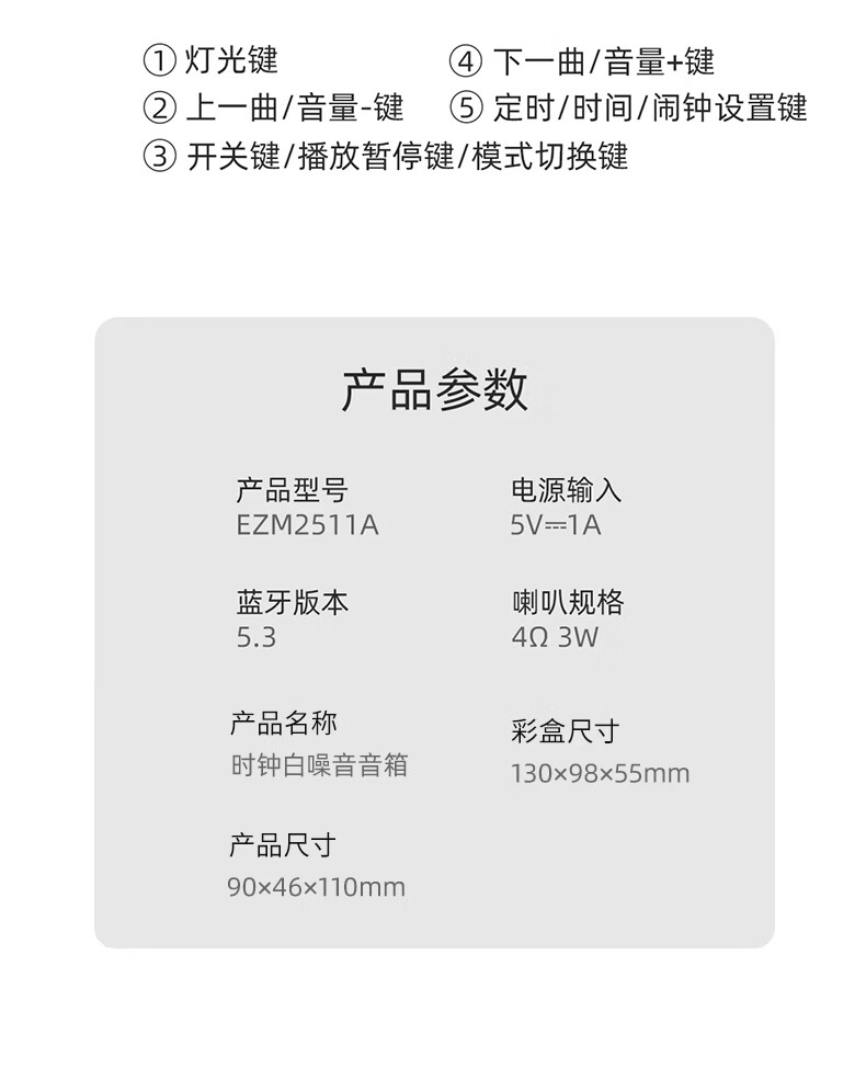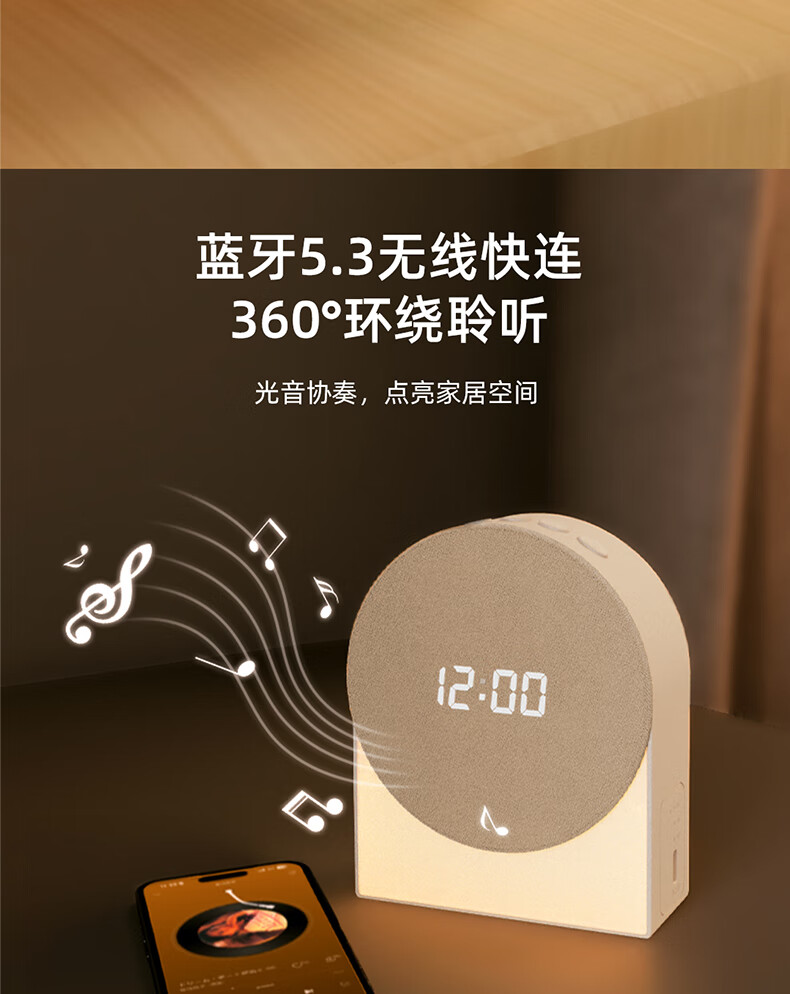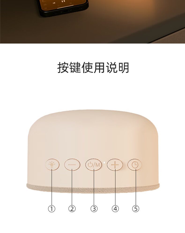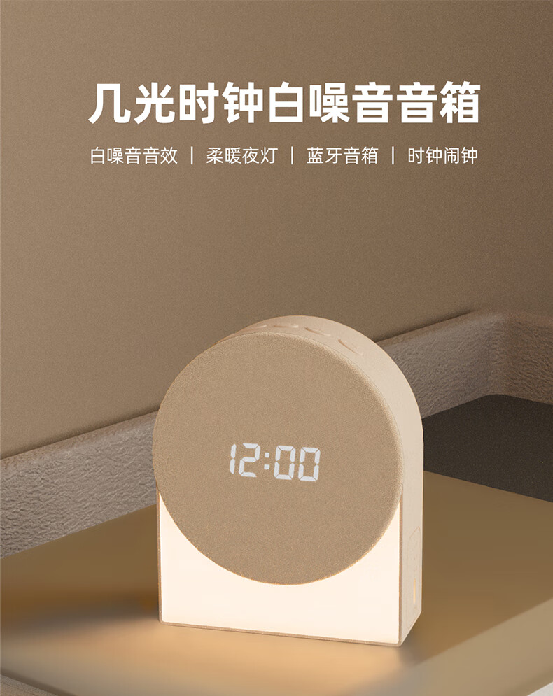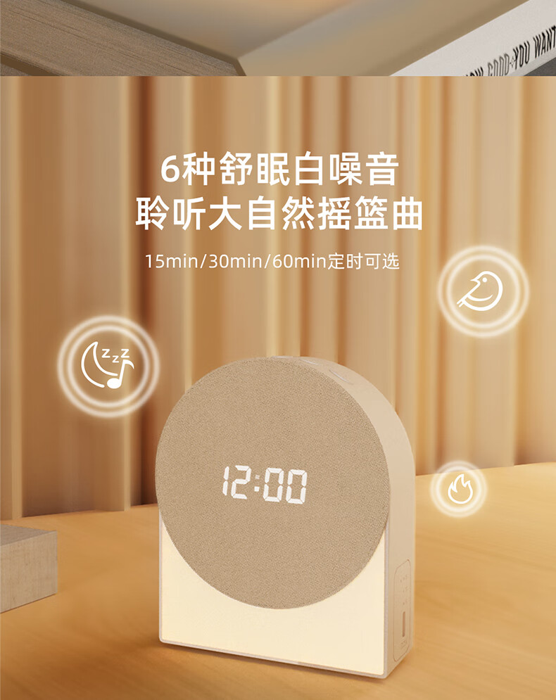 内置6种舒眠白噪音,温柔陪伴每个夜晚,多档定时可选;柔暖小夜灯,点亮床头氛围,三档亮度可调节;蓝牙稳定快连播放,360度环绕聆听