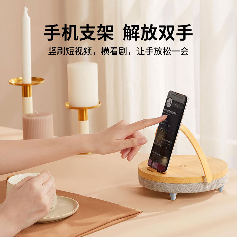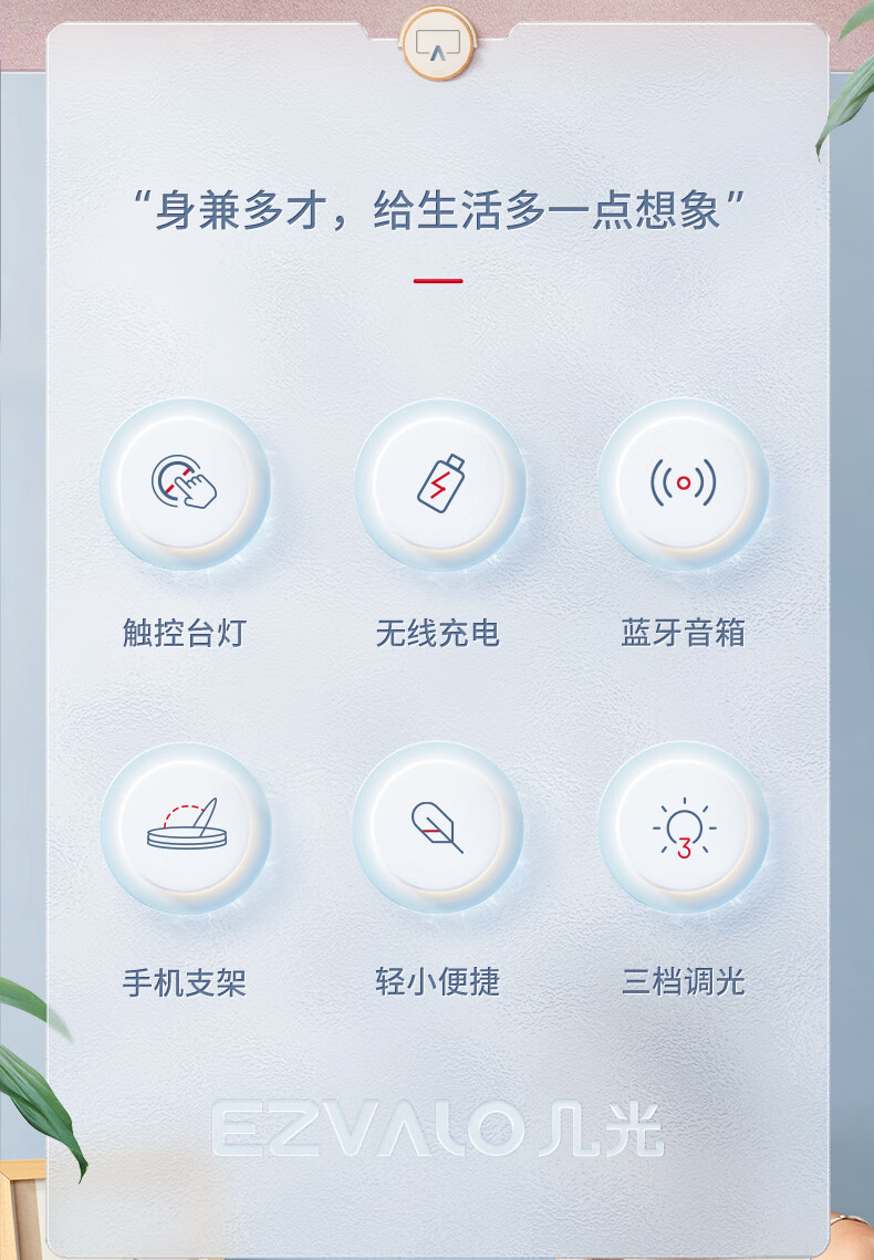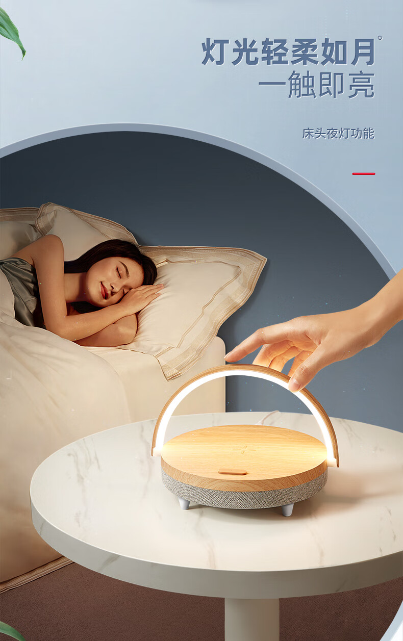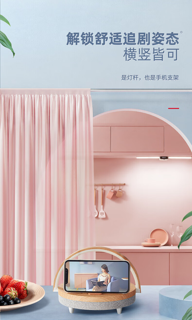 智能无线充电;三档贴心照明模式;180度调节照明角度,手机支架随心放