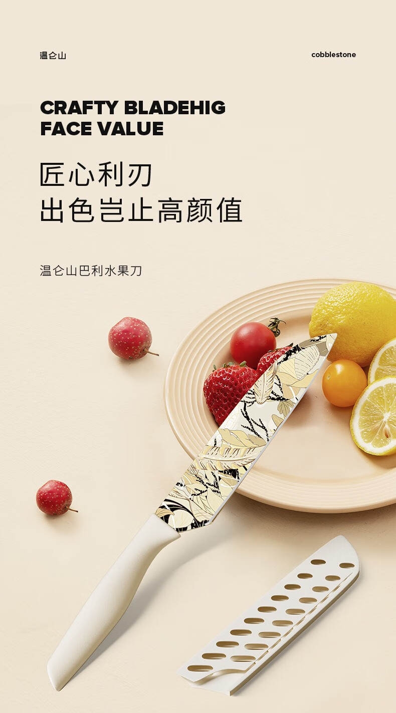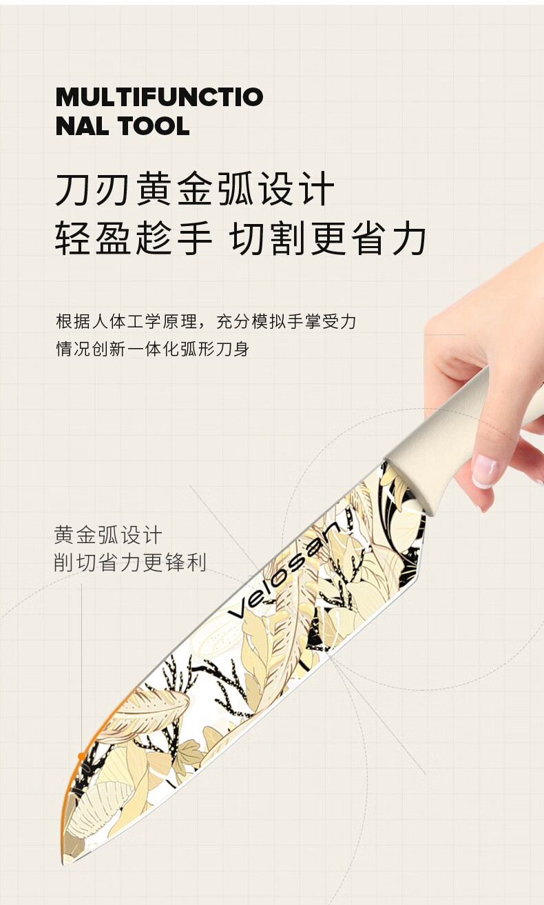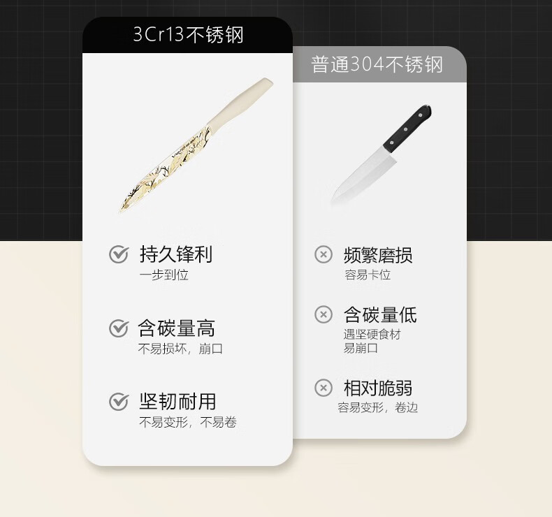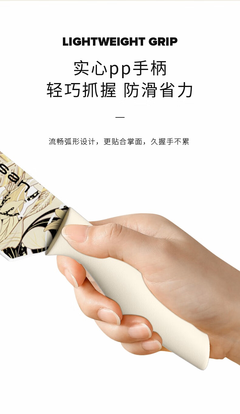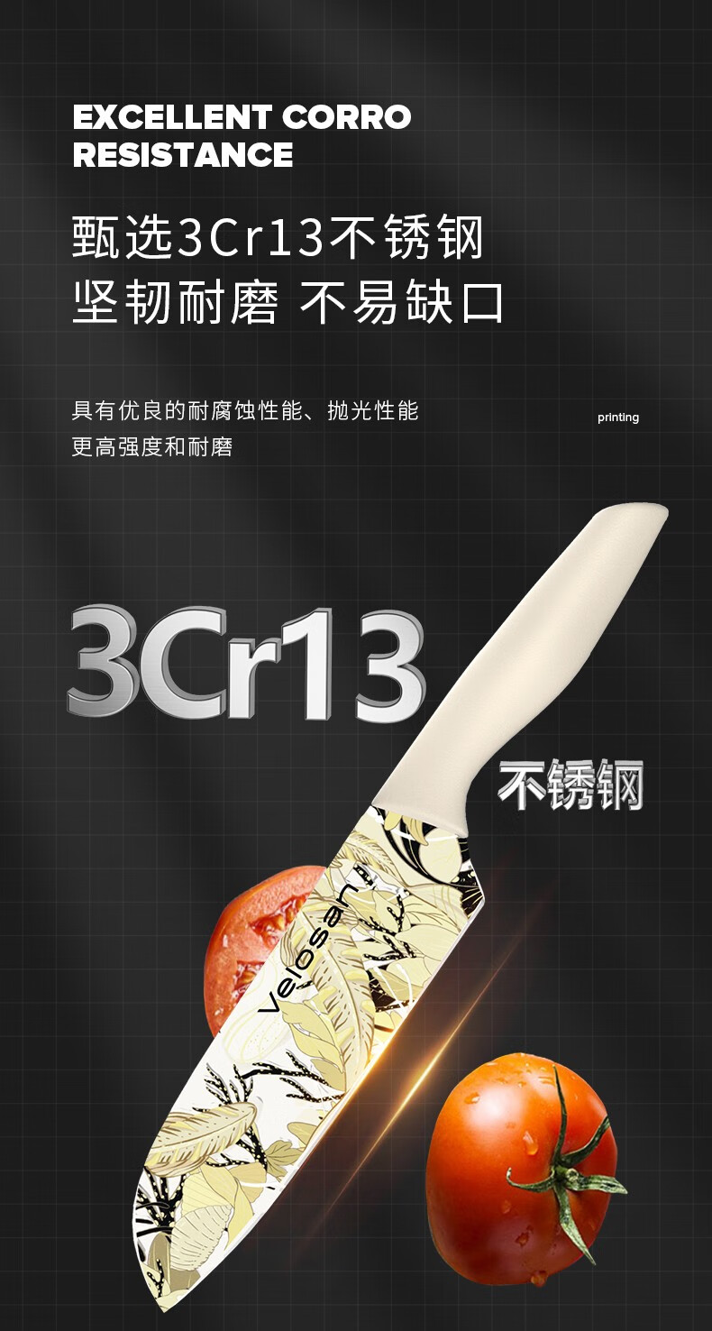 3Cr13不锈钢材质,硬度高,耐腐蚀;符合人体工学设计,握感舒适,省时省力;自带镂空刀套,通风沥水便于收纳