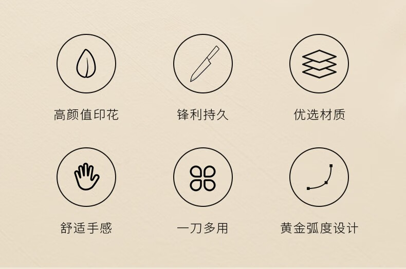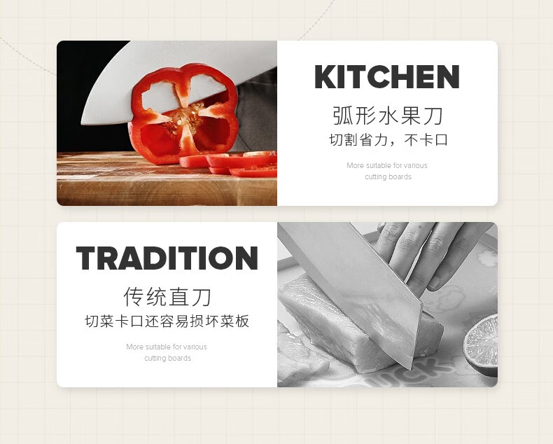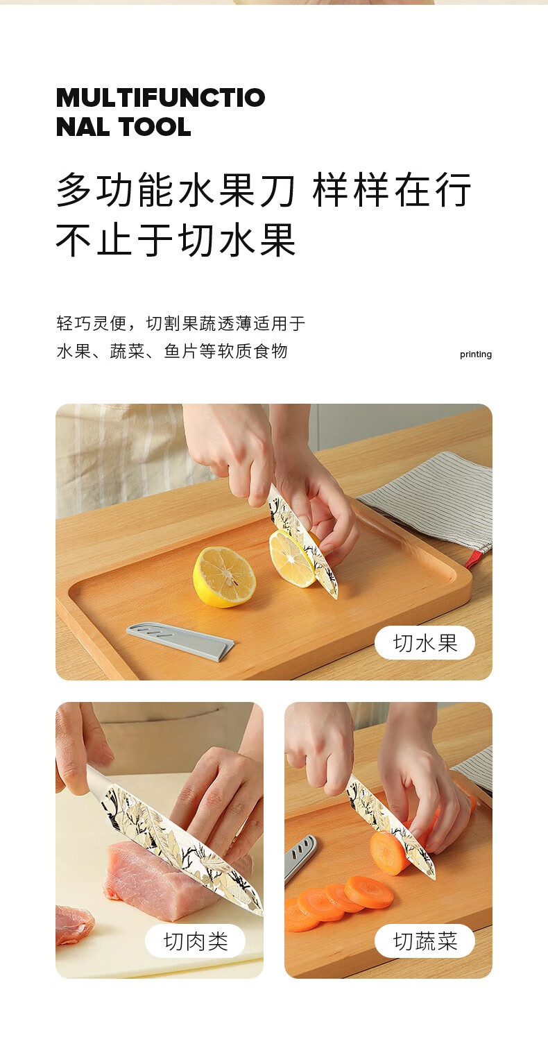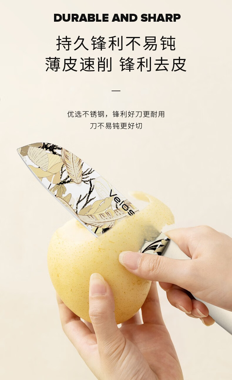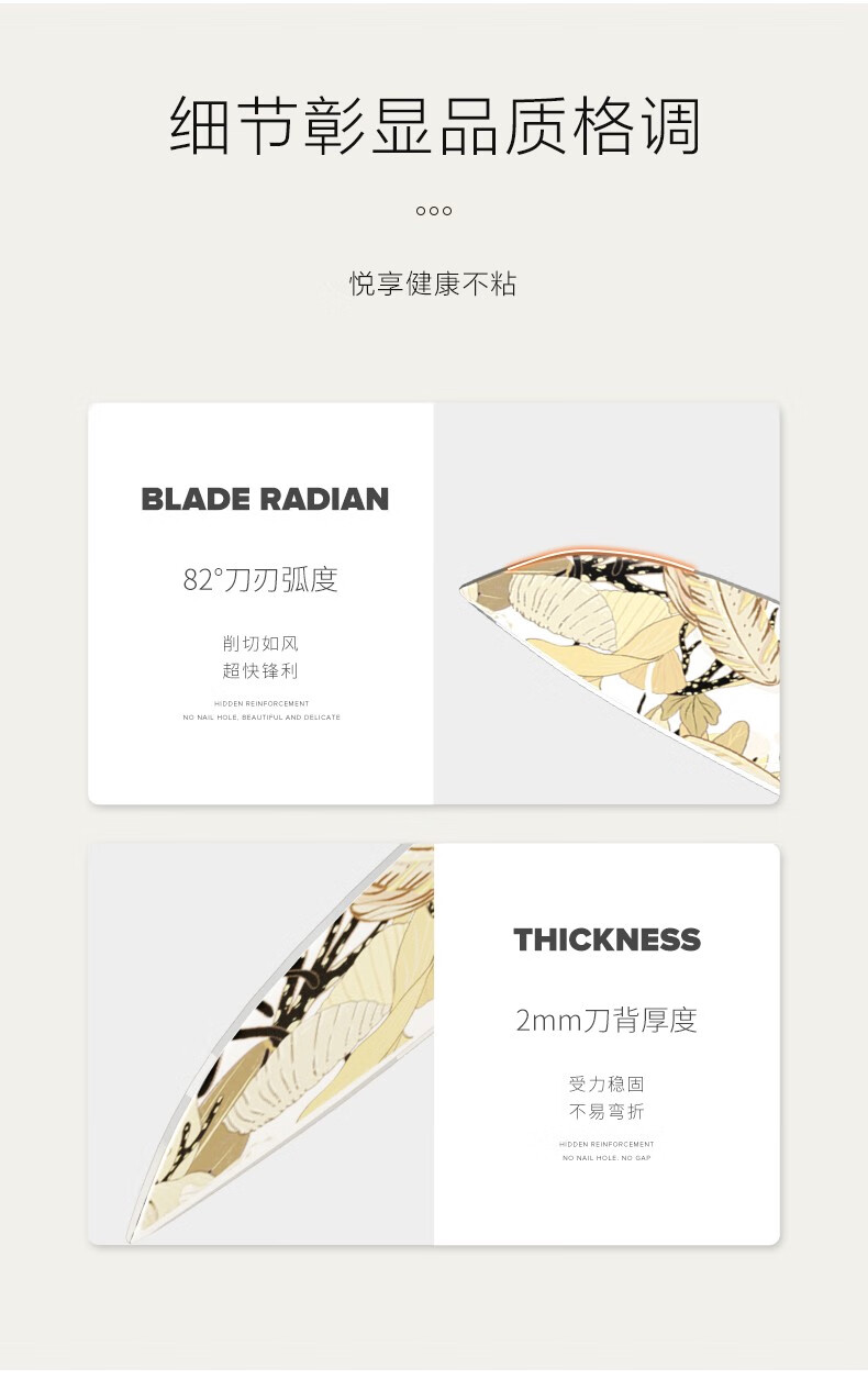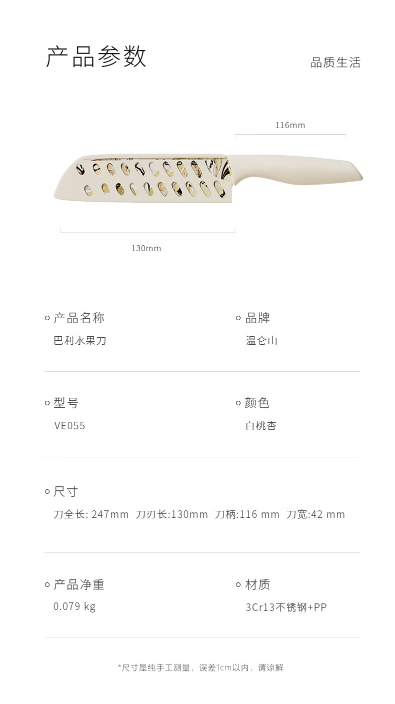3Cr13不锈钢材质,硬度高,耐腐蚀;符合人体工学设计,握感舒适,省时省力;自带镂空刀套,通风沥水便于收纳