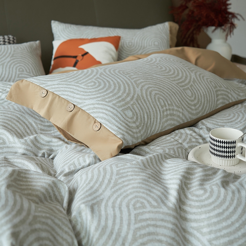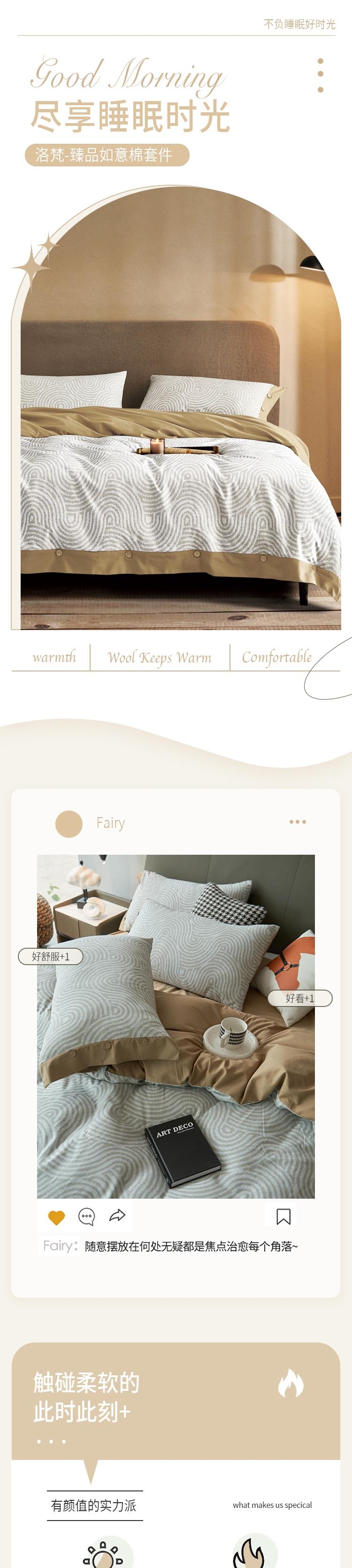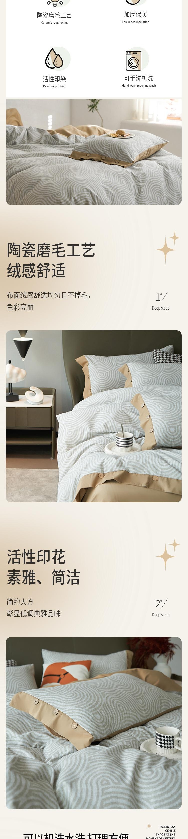 面料采用的是新型陶瓷磨毛工艺;不掉毛,色彩亮丽,色牢度好,手感柔软。;简洁的活性印花,加上经典的设计制作工艺和简约大方