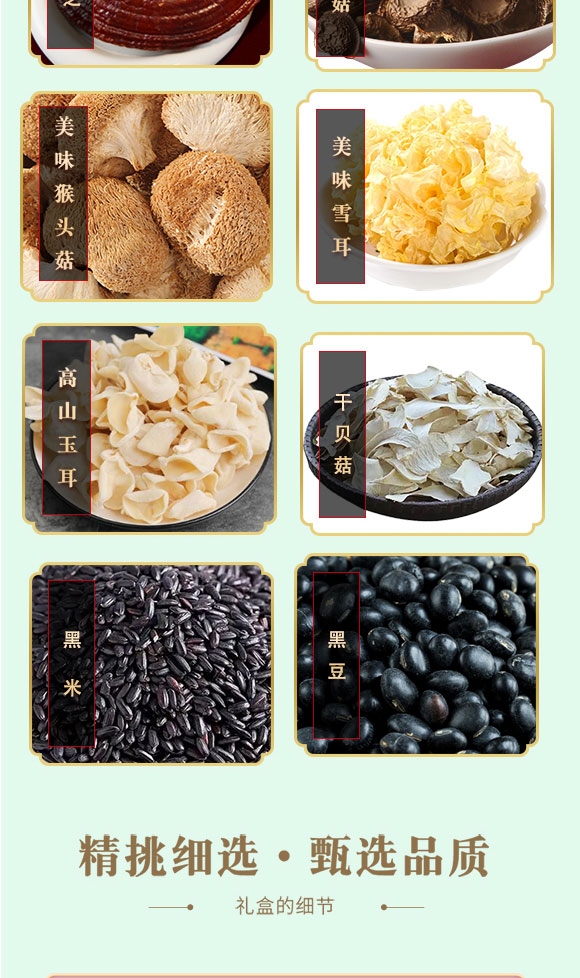 配置清单:黑灵芝50克*1袋 鹿茸菇50克*1袋 猴头菇40克*1袋 美味雪耳40克*1袋 干贝菇50克*1袋 白玉耳50克*1袋 黑豆250克*1袋 黑米250克*1袋