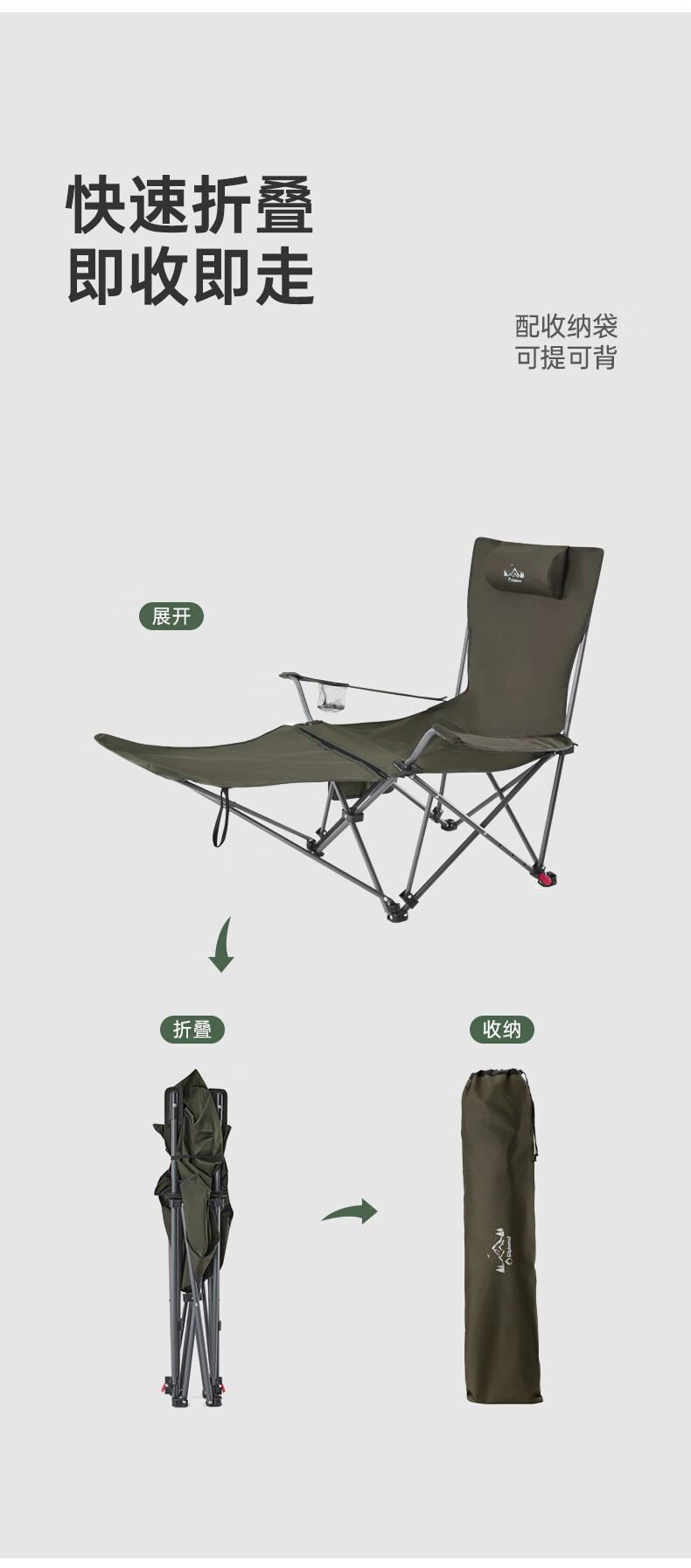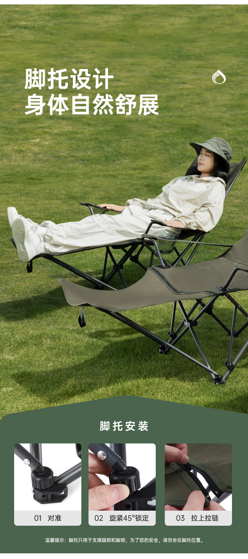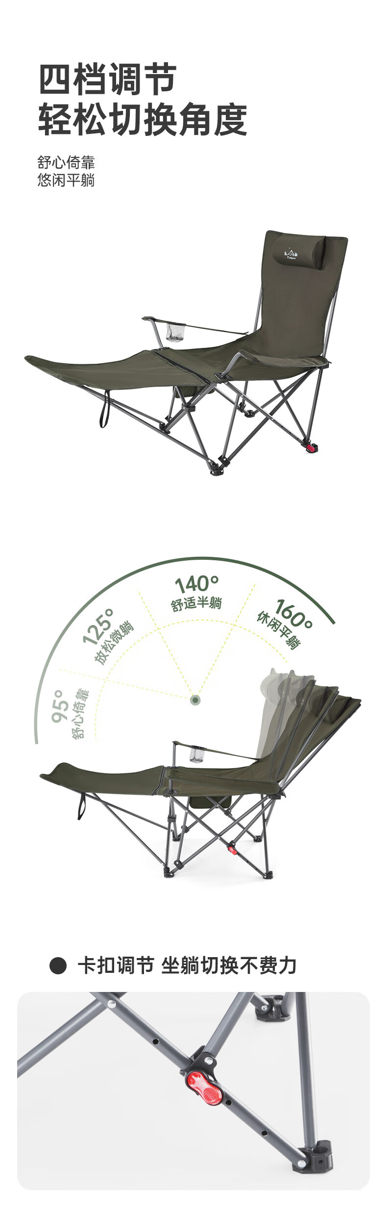 四档可调,坐躺两用随心换。;可拆卸腿托,拉链+旋钮设计,安装方便;饱满弧形头枕,颈部承托更自在。