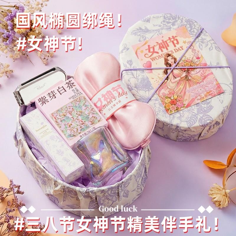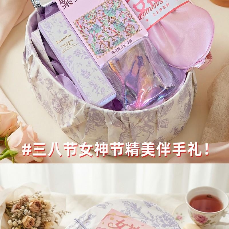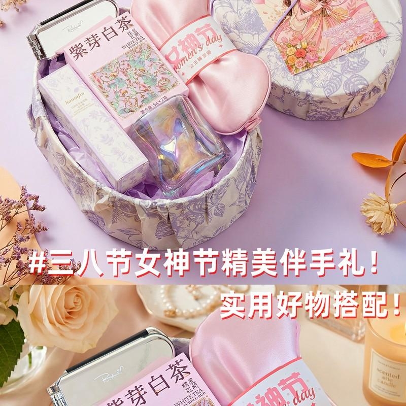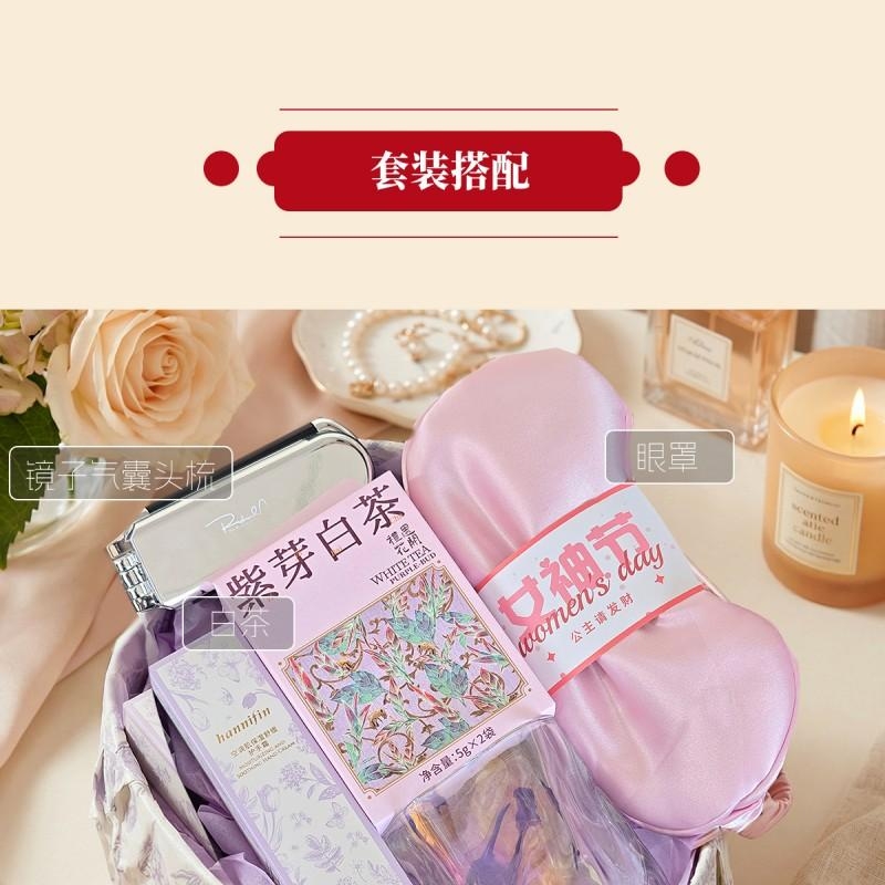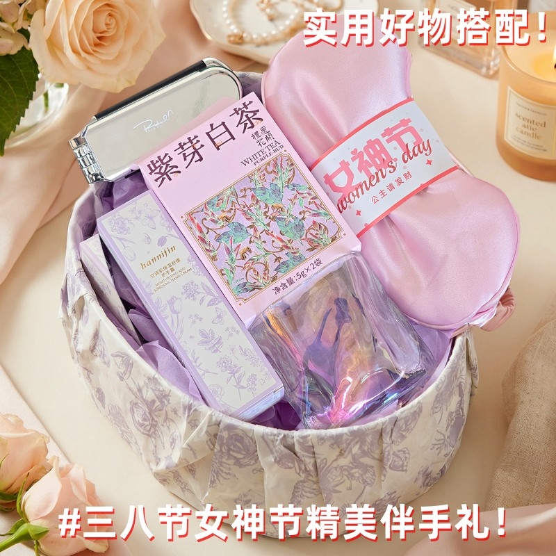 组合:扭扭玻璃杯*1、紫芽白茶5g*2袋、镜子气囊头梳*1、女神节公主眼罩*1、韩方莉花瓣护手霜35g*1