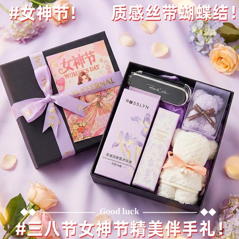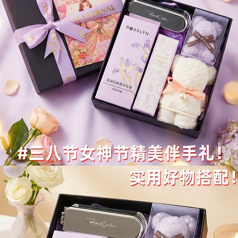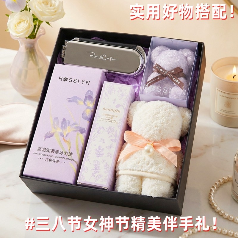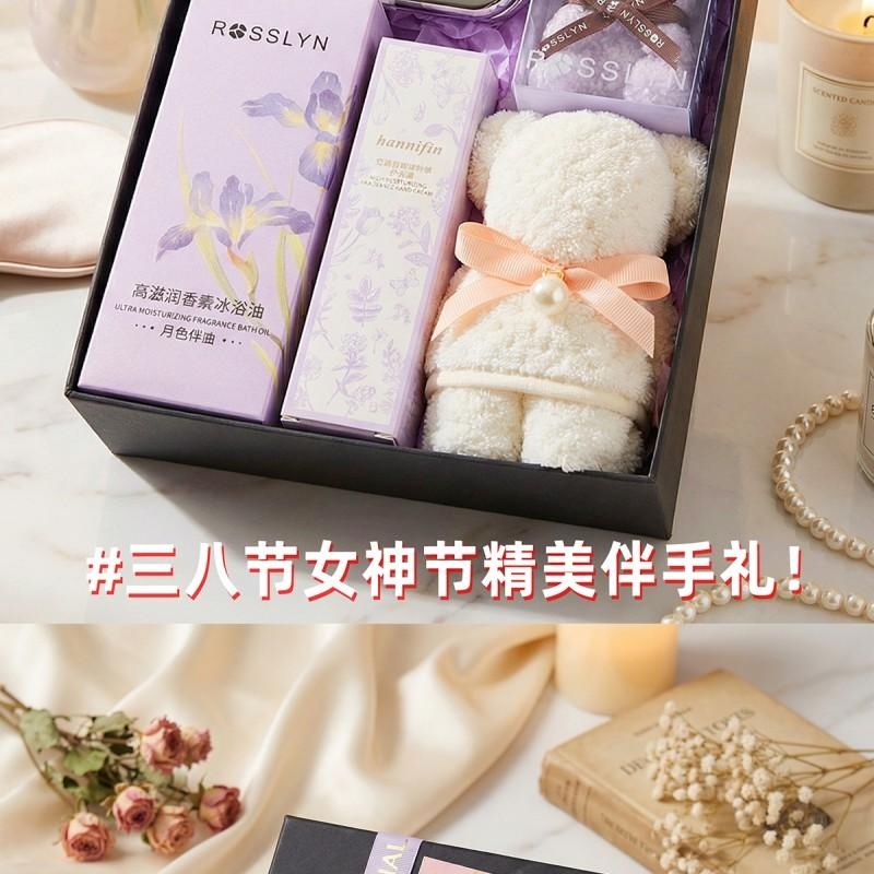 组合:镜子气囊头梳*1、韩方莉花瓣护手霜35g*1、小熊玫瑰香氛皂100g*1、ROSSLYN香氛沐浴油158ML*1、菠萝格纹理创意小熊毛巾30*30CM*1