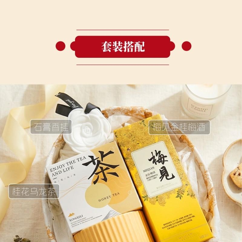 组合:公主陶瓷杯*1、山茶花石膏香挂*1、桂花乌龙茶3g*3包、梅见金桂梅酒150ML*1