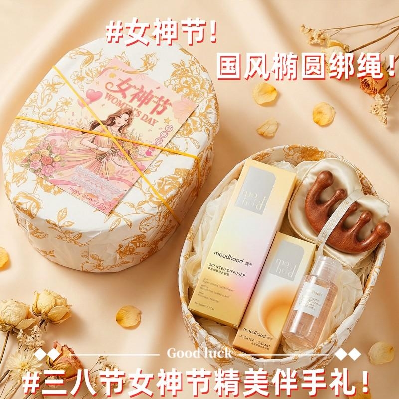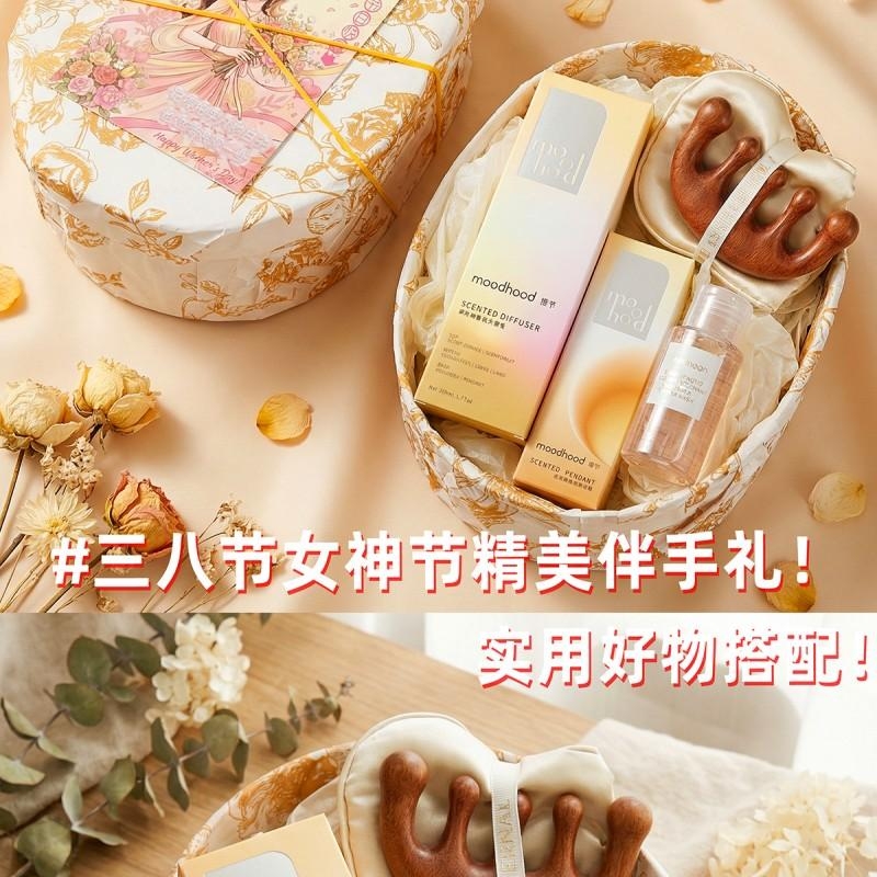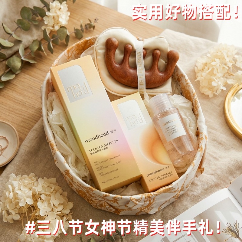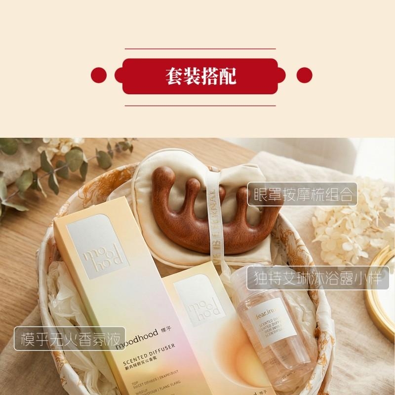 组合:moodhood石膏香挂*1、moodhood无火香氛液50ML*1、独特艾琳沐浴露小样50ML*1、女神节公主眼罩+按摩梳组合*1