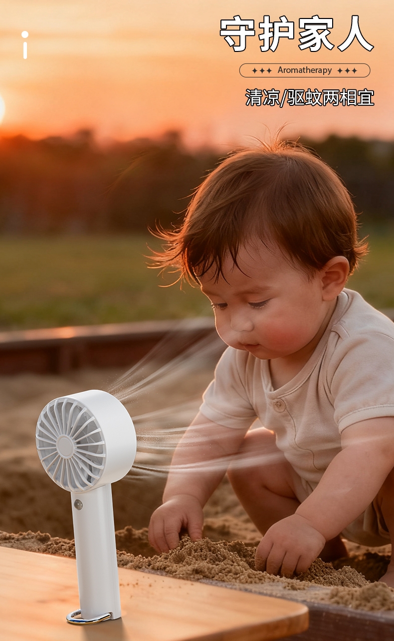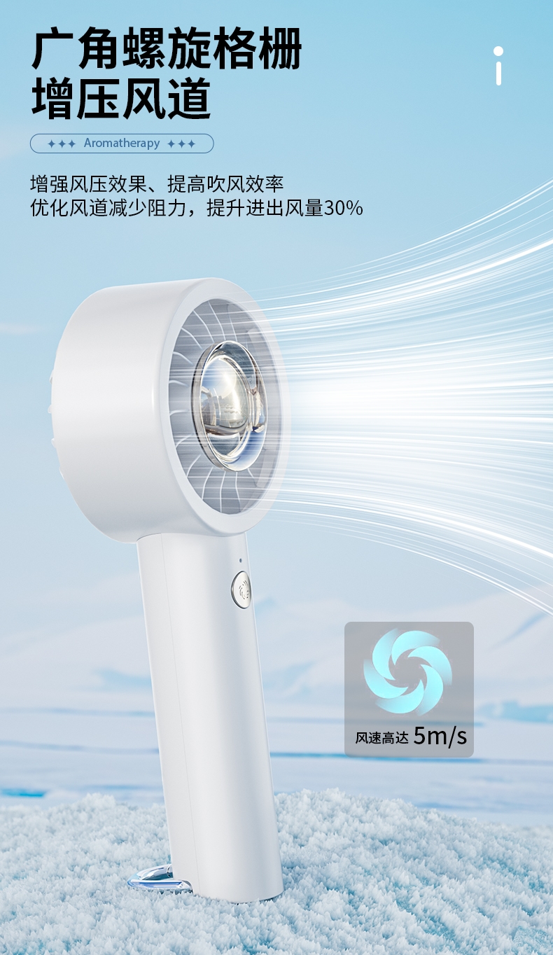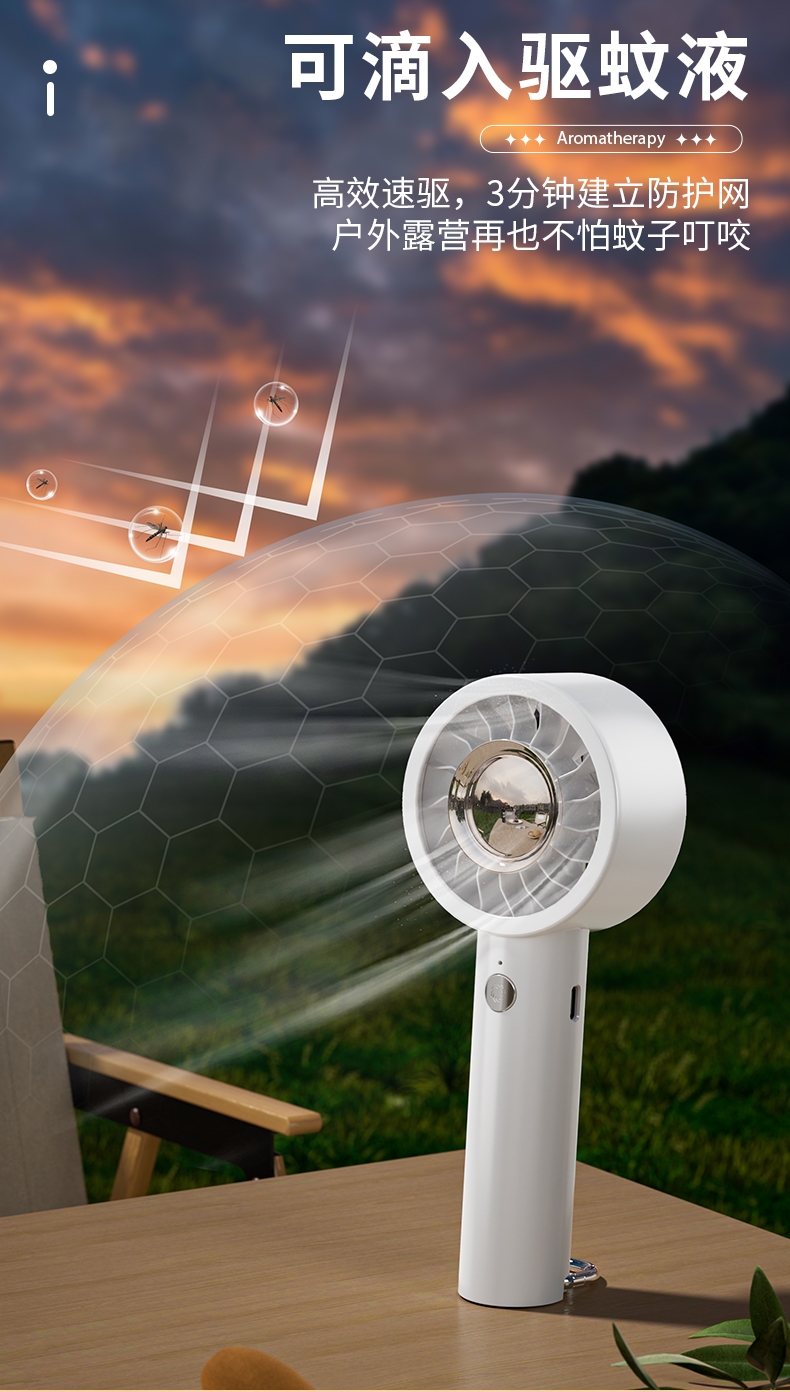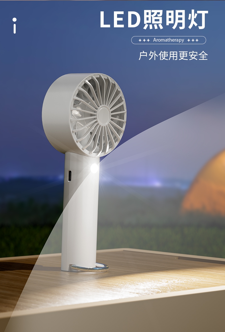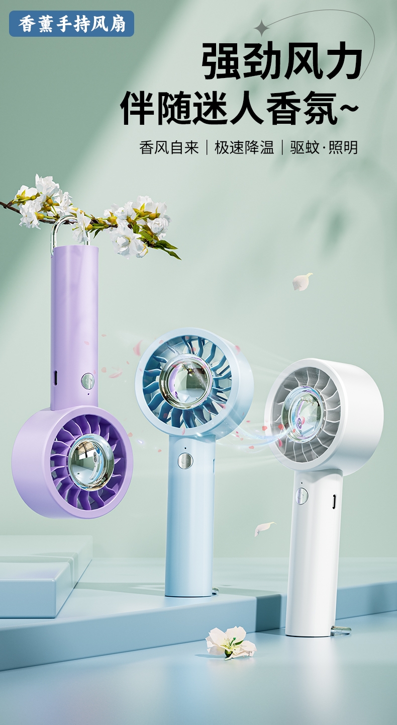 香氛吹风二合一,内置香薰片,吹出的风自带清新香气;采用高速涡轮风叶设计,风力强劲,能快速带走体表热量;照明功能可当小手电,香氛驱蚊,给夜间出行多一份安心