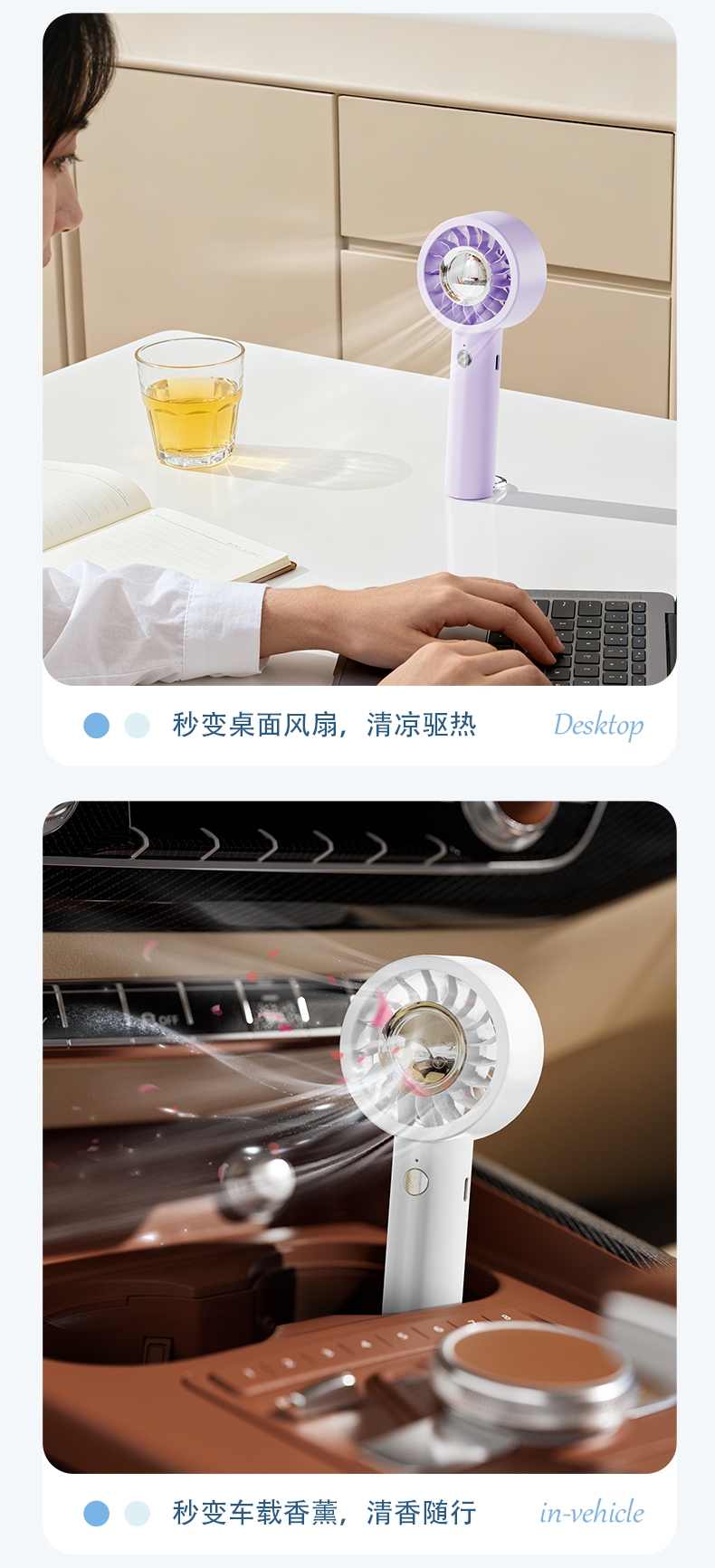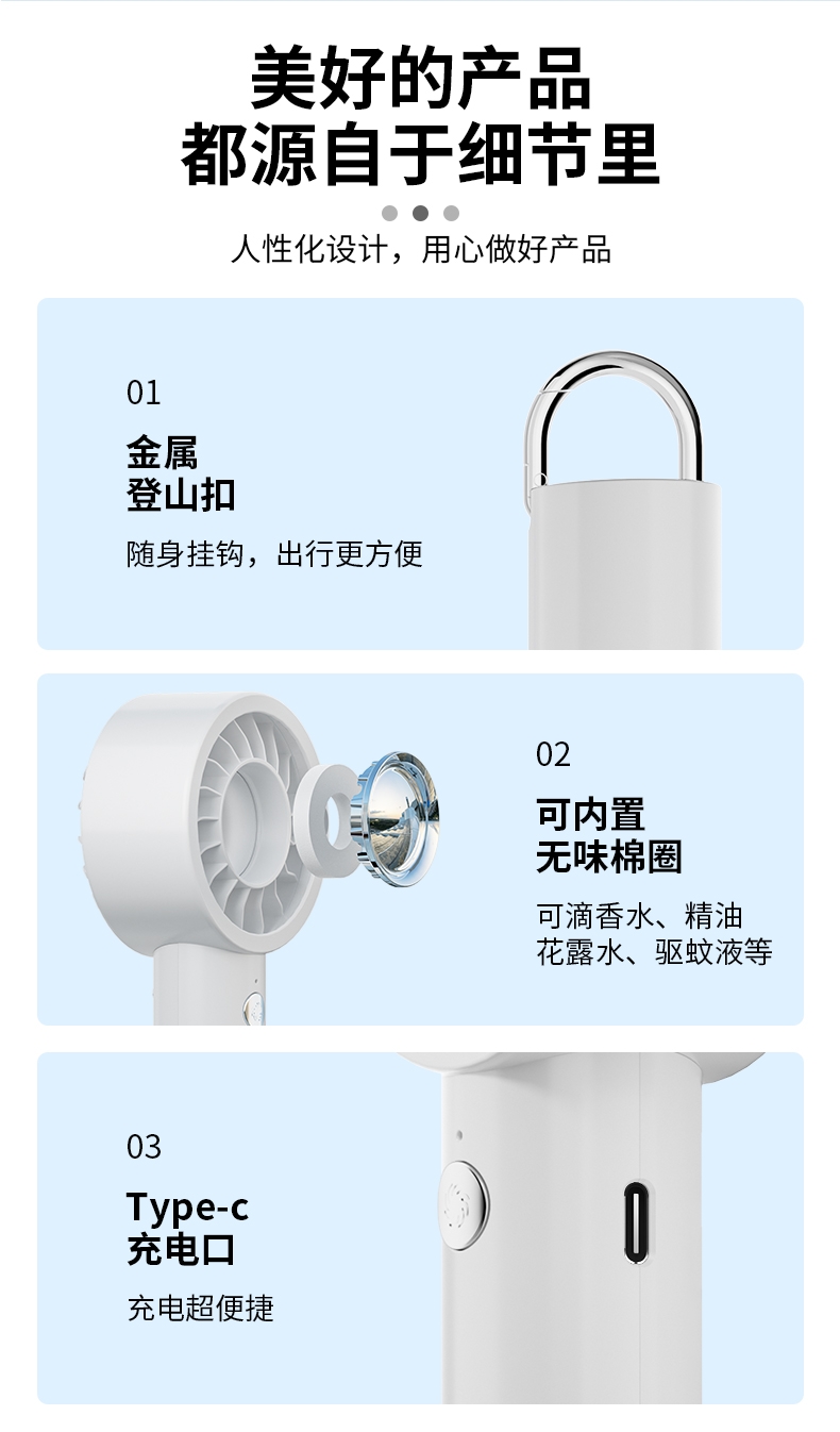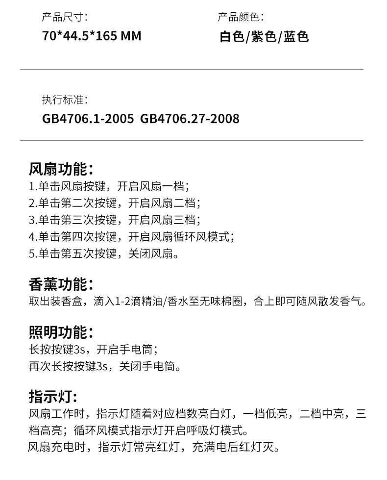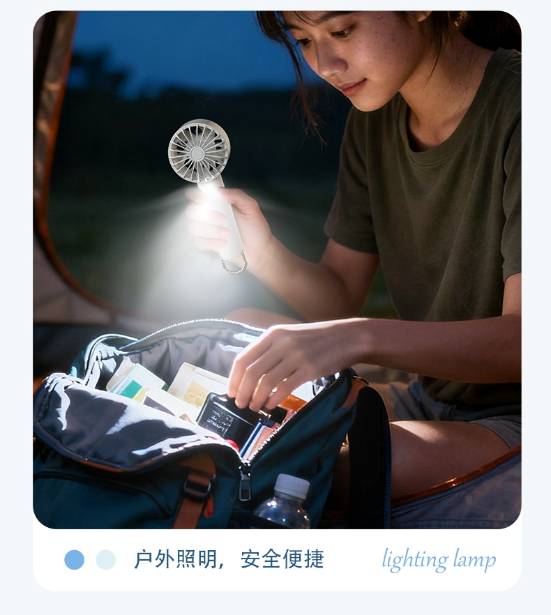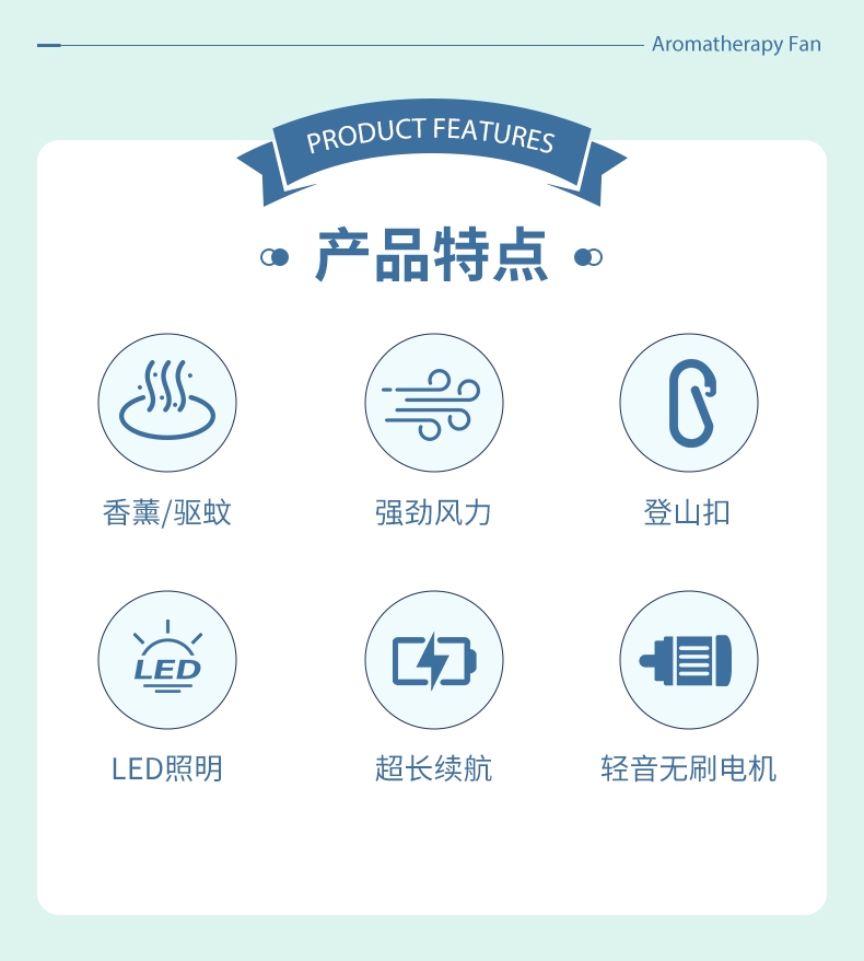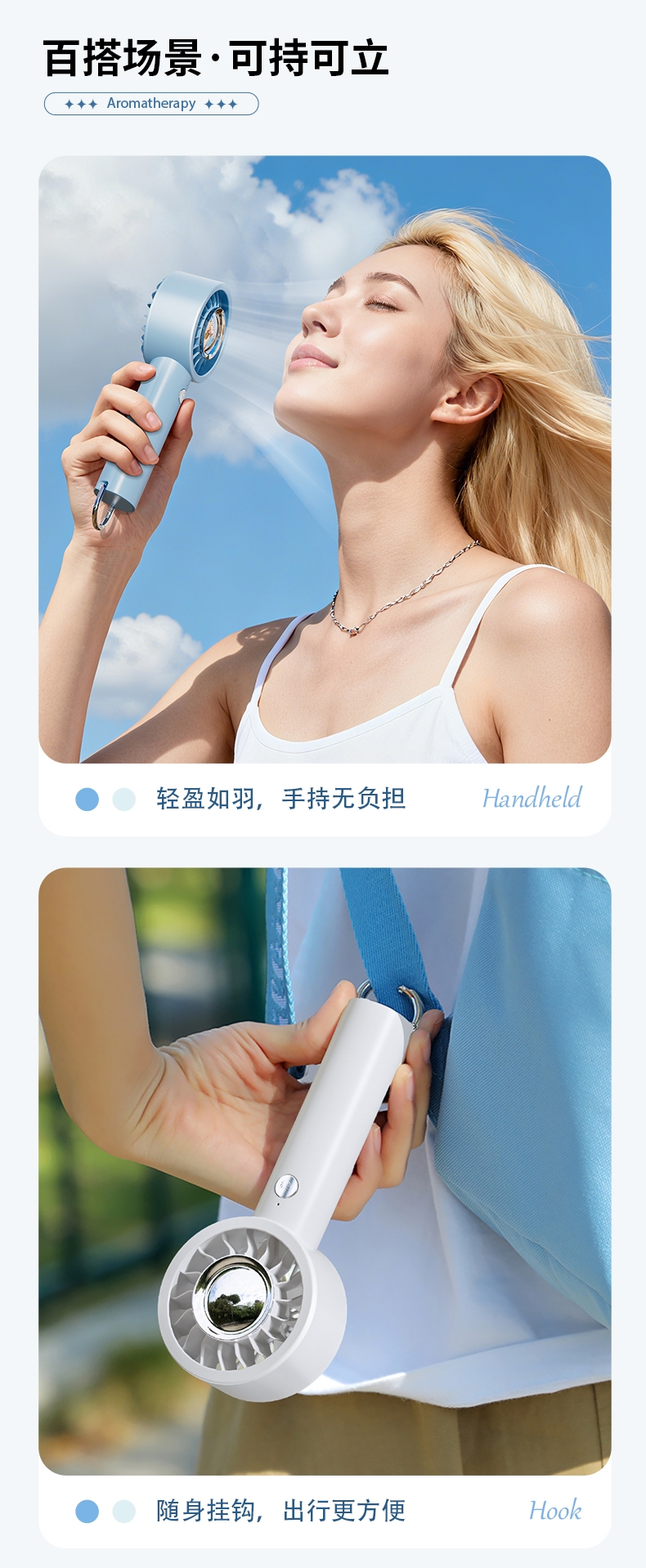 香氛吹风二合一,内置香薰片,吹出的风自带清新香气;采用高速涡轮风叶设计,风力强劲,能快速带走体表热量;照明功能可当小手电,香氛驱蚊,给夜间出行多一份安心