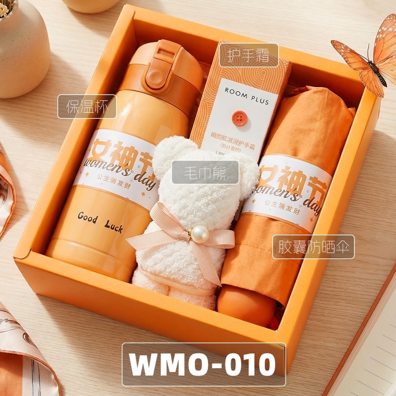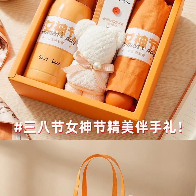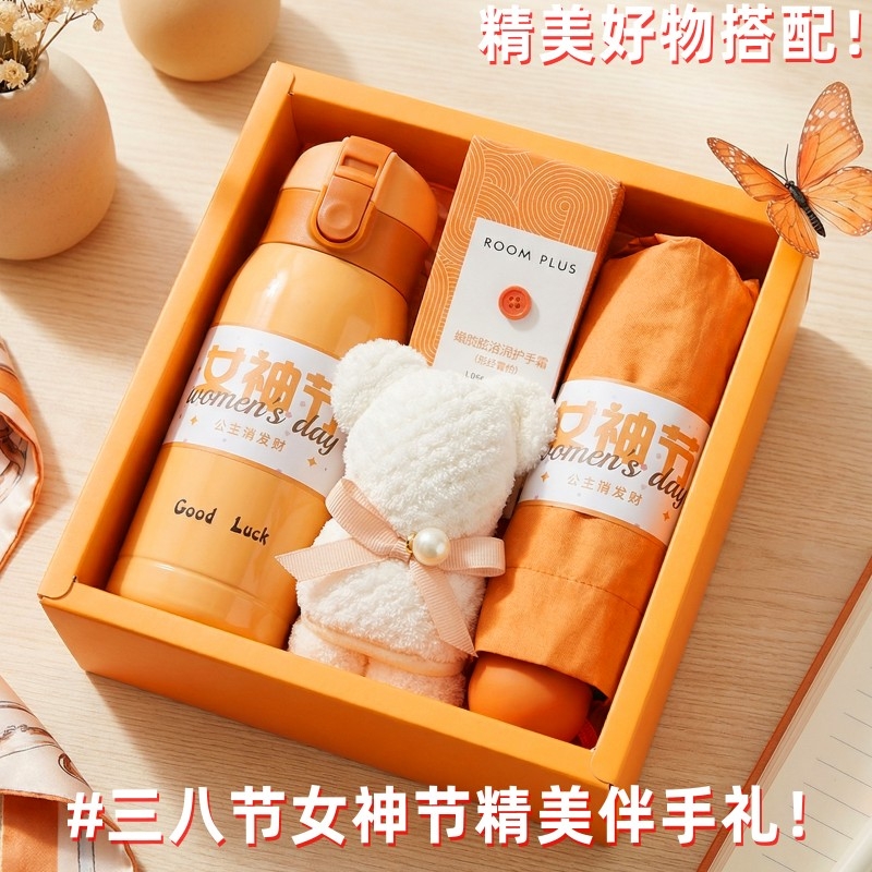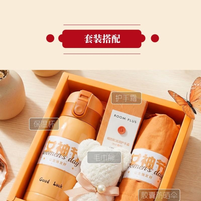 组合:女神节胶囊防晒伞*1、女神节保温杯300ML*1 、ROOM PLUS护手霜30g*1、菠萝格纹理创意小熊毛巾30*30CM