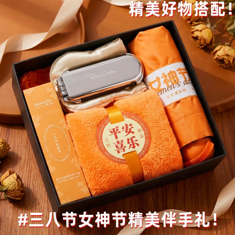 组合:女神节胶囊防晒伞*1、平安喜乐毛巾75*34cm、韩方莉香氛护手霜50g*1、女神节公主眼罩+镜子气囊头梳组合*1