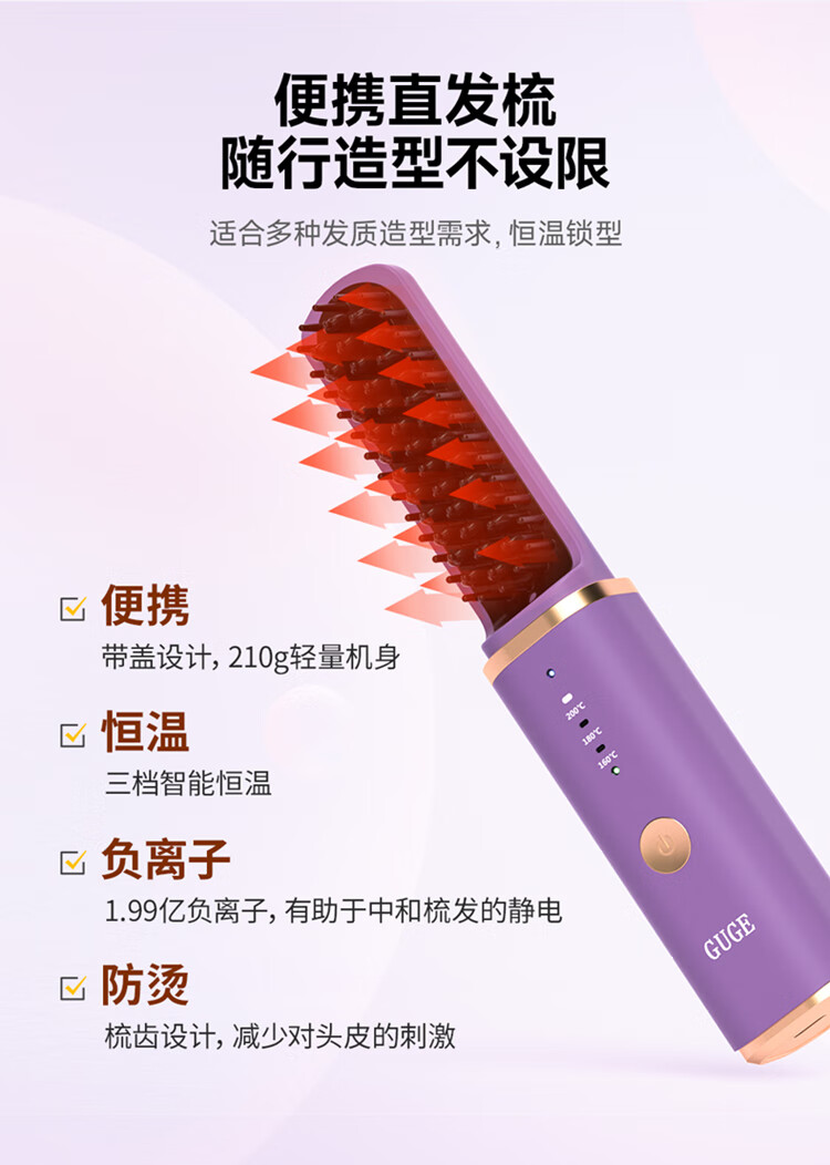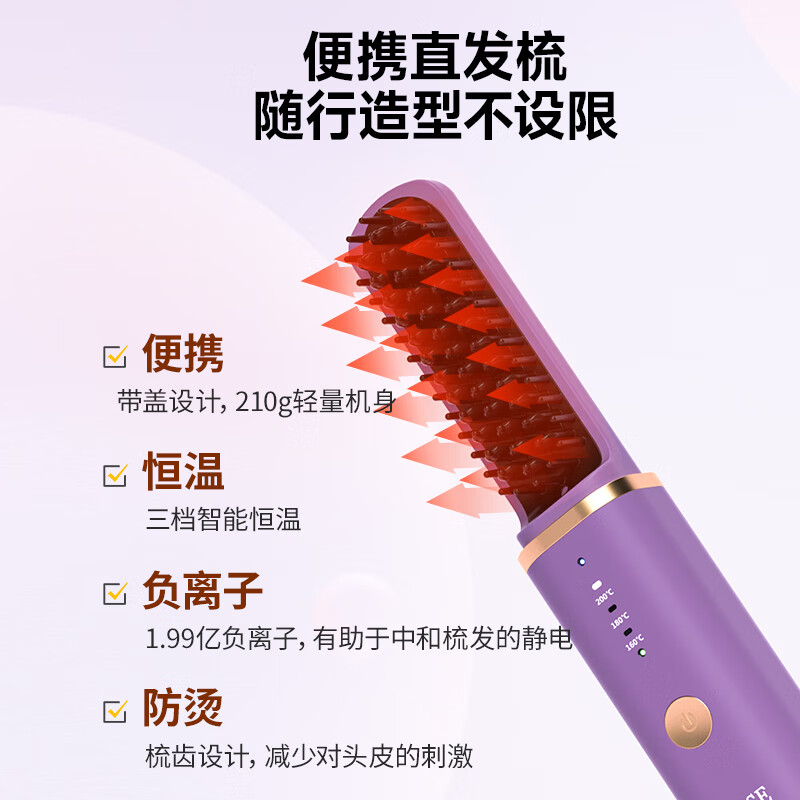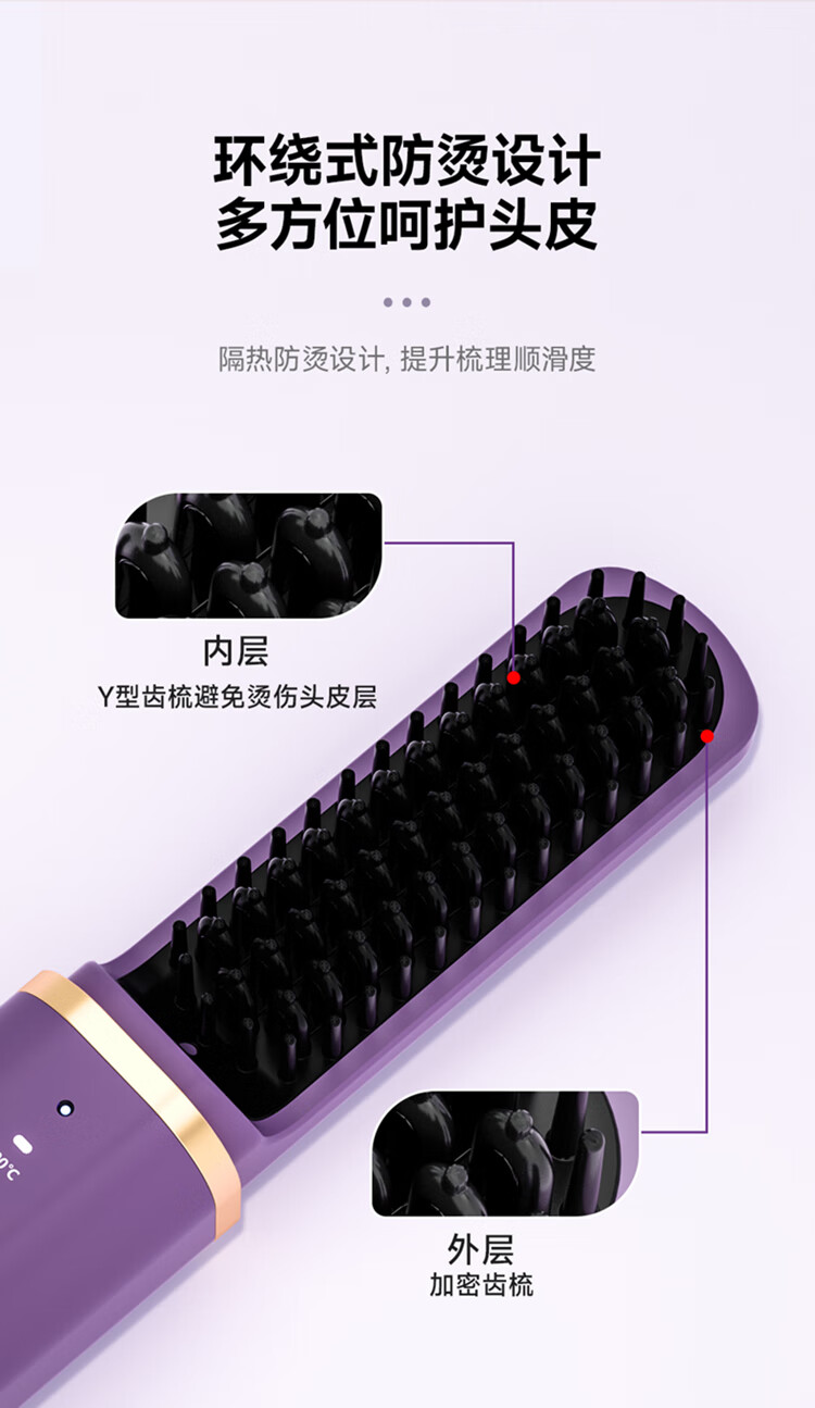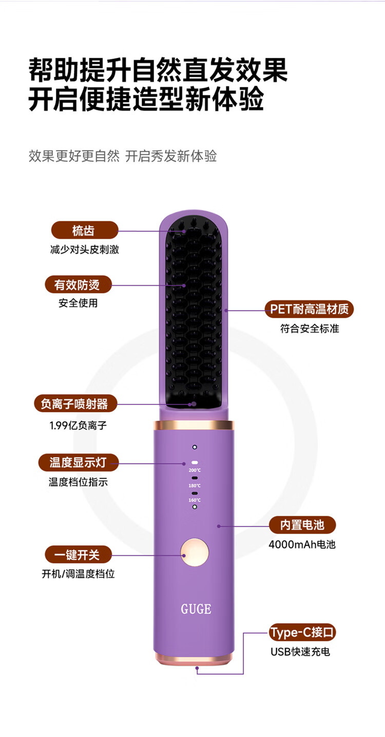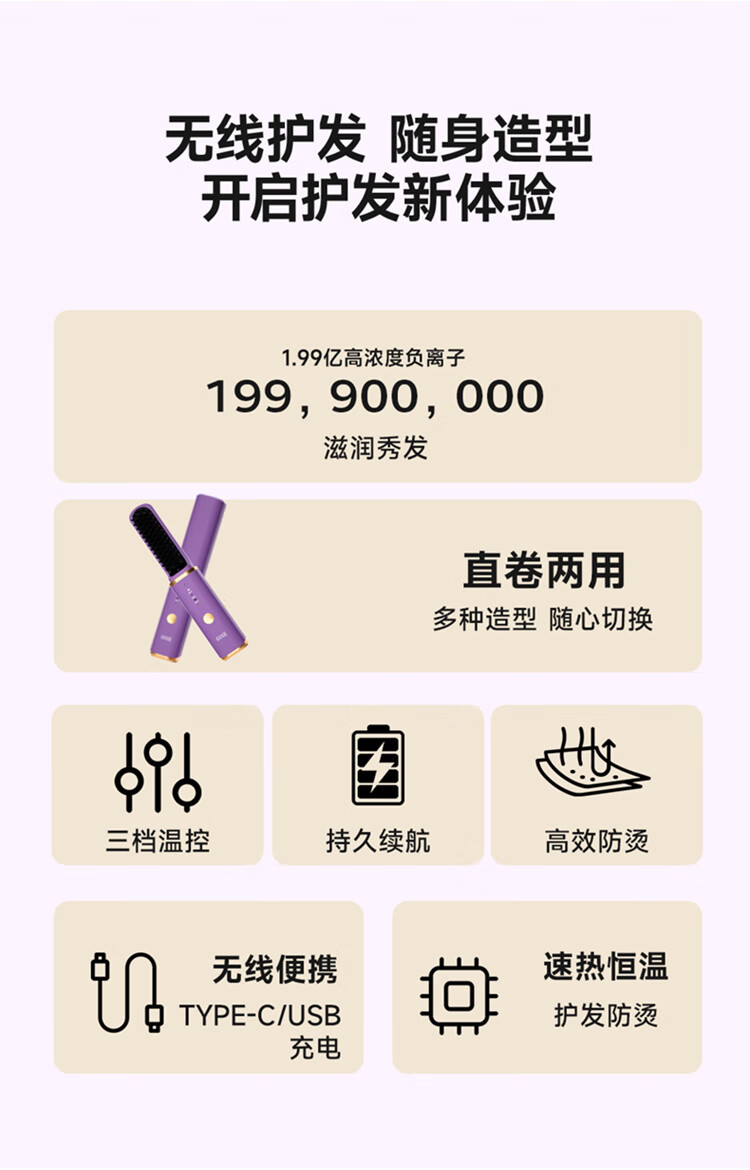2亿负离子无线护发直发梳;3D立体革新齿梳设计,抓发能力强防烫伤设计柔顺加倍; Type-C充电接口在哪儿都能充电