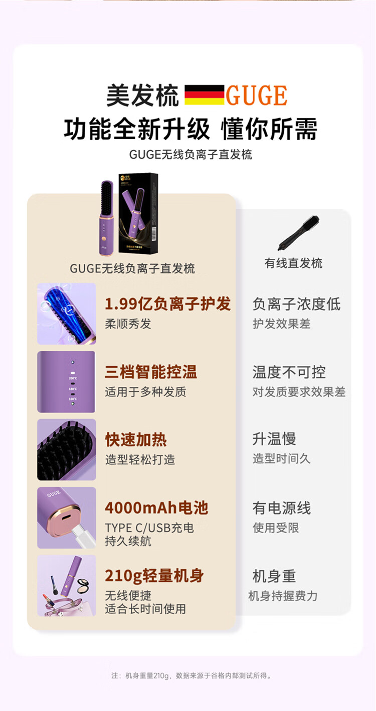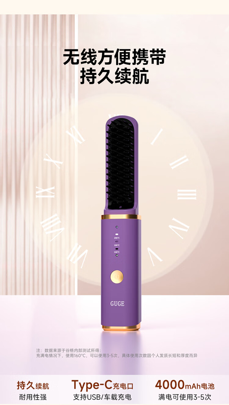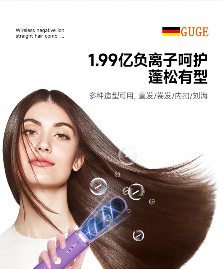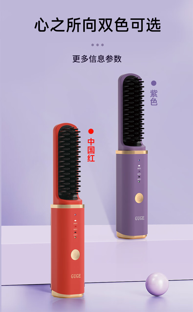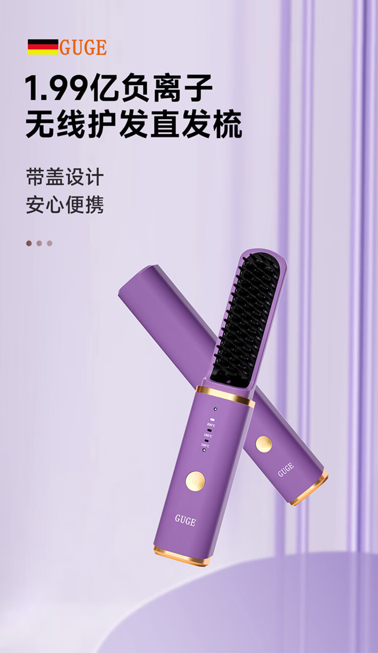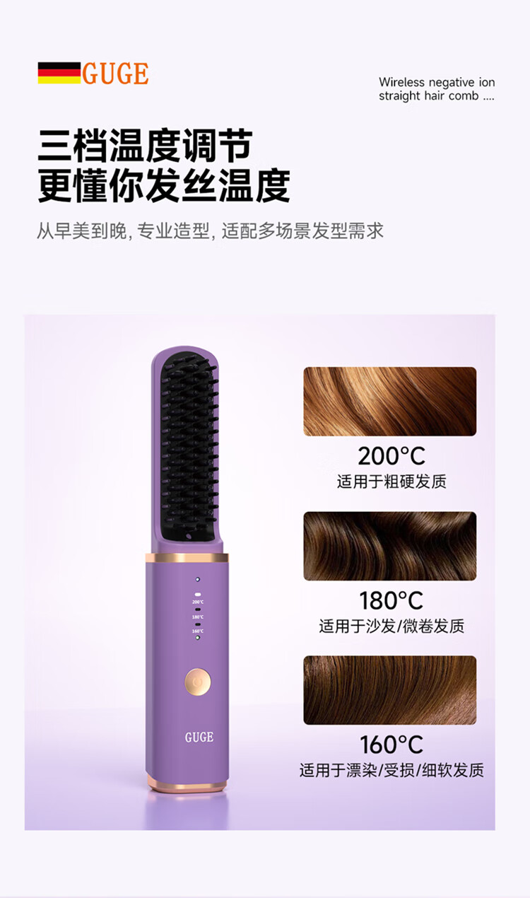 2亿负离子无线护发直发梳;3D立体革新齿梳设计,抓发能力强防烫伤设计柔顺加倍; Type-C充电接口在哪儿都能充电