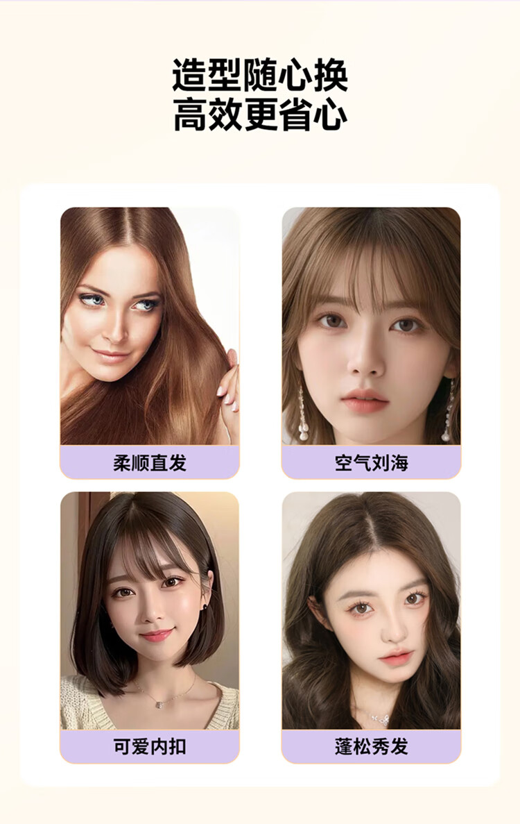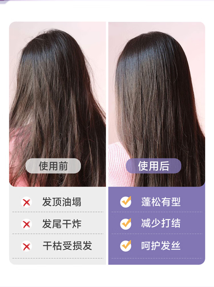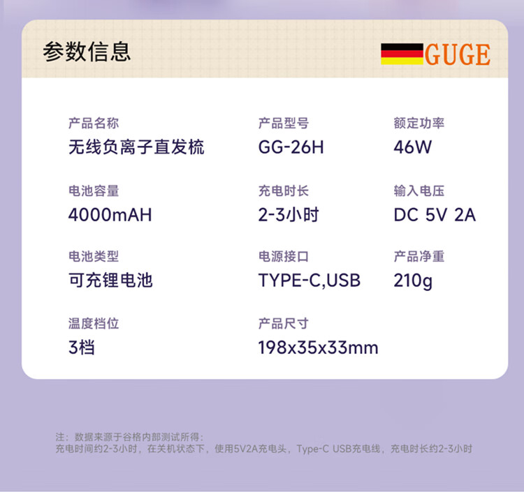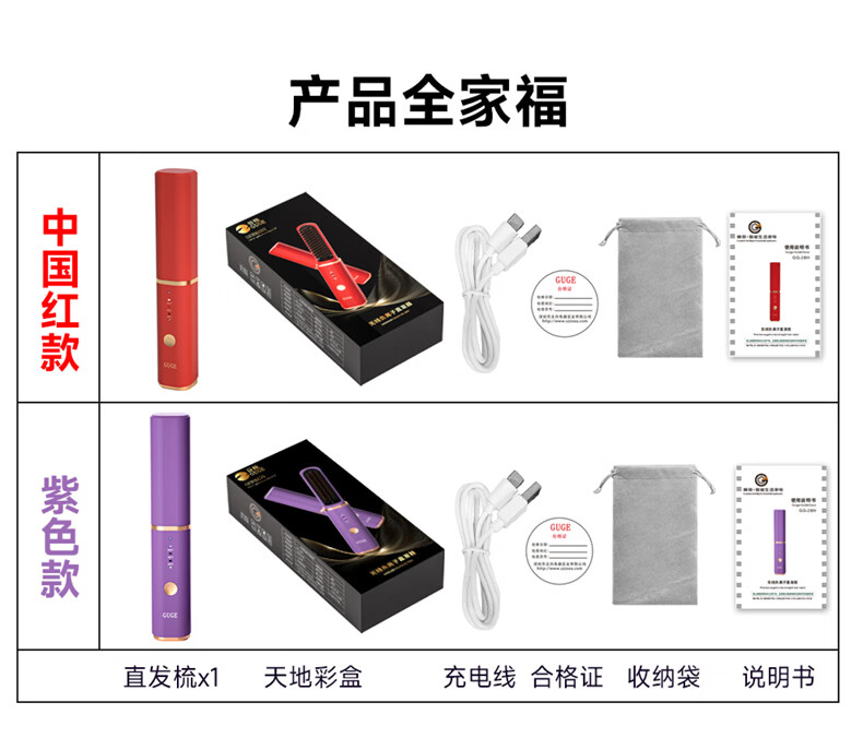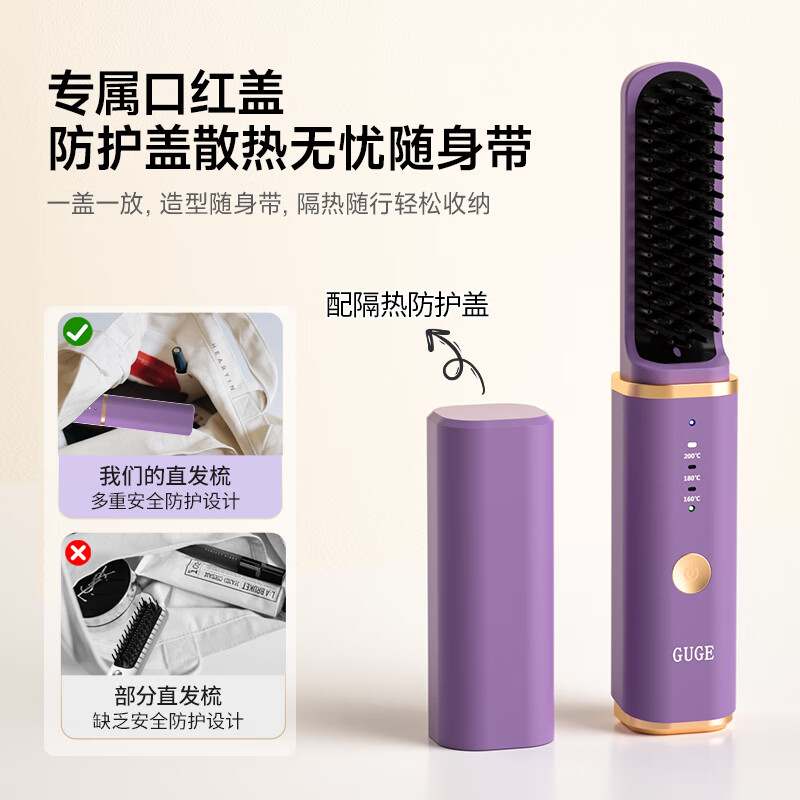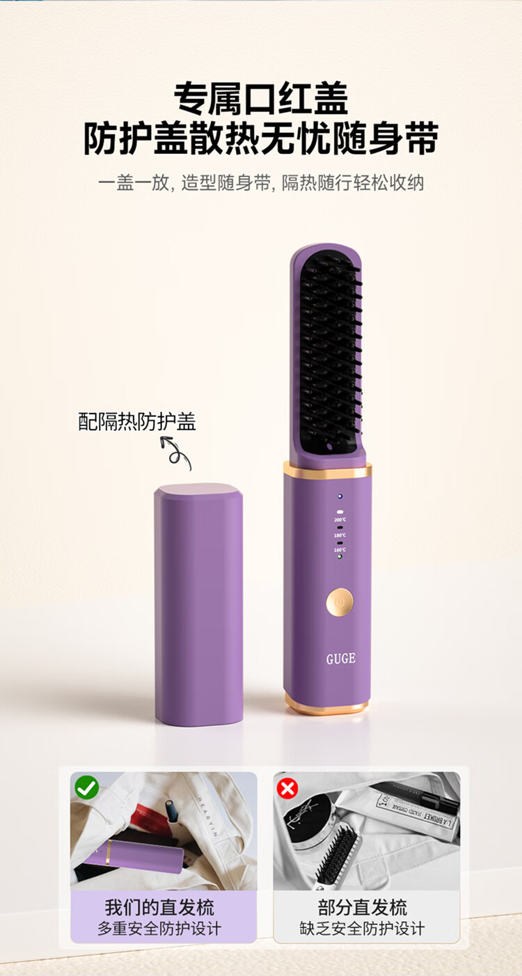 2亿负离子无线护发直发梳;3D立体革新齿梳设计,抓发能力强防烫伤设计柔顺加倍; Type-C充电接口在哪儿都能充电
