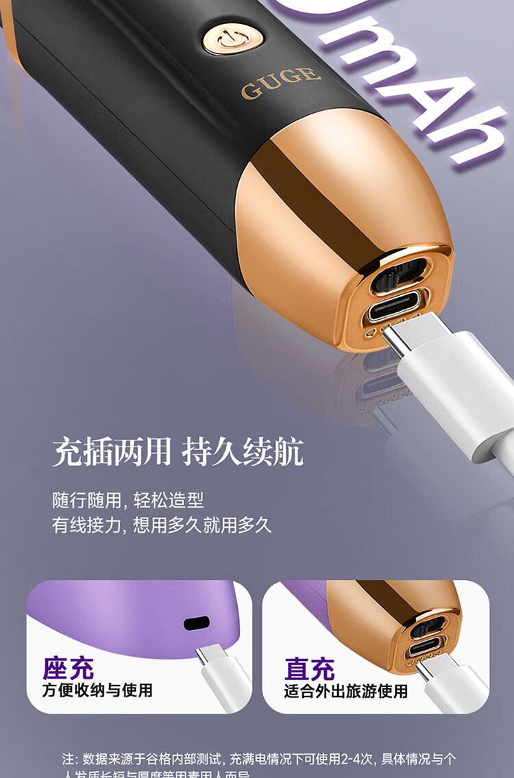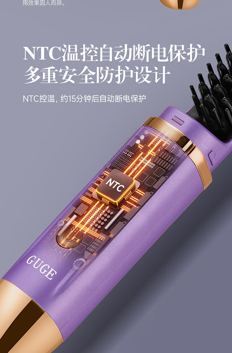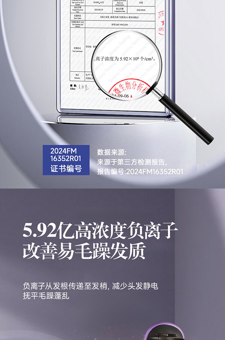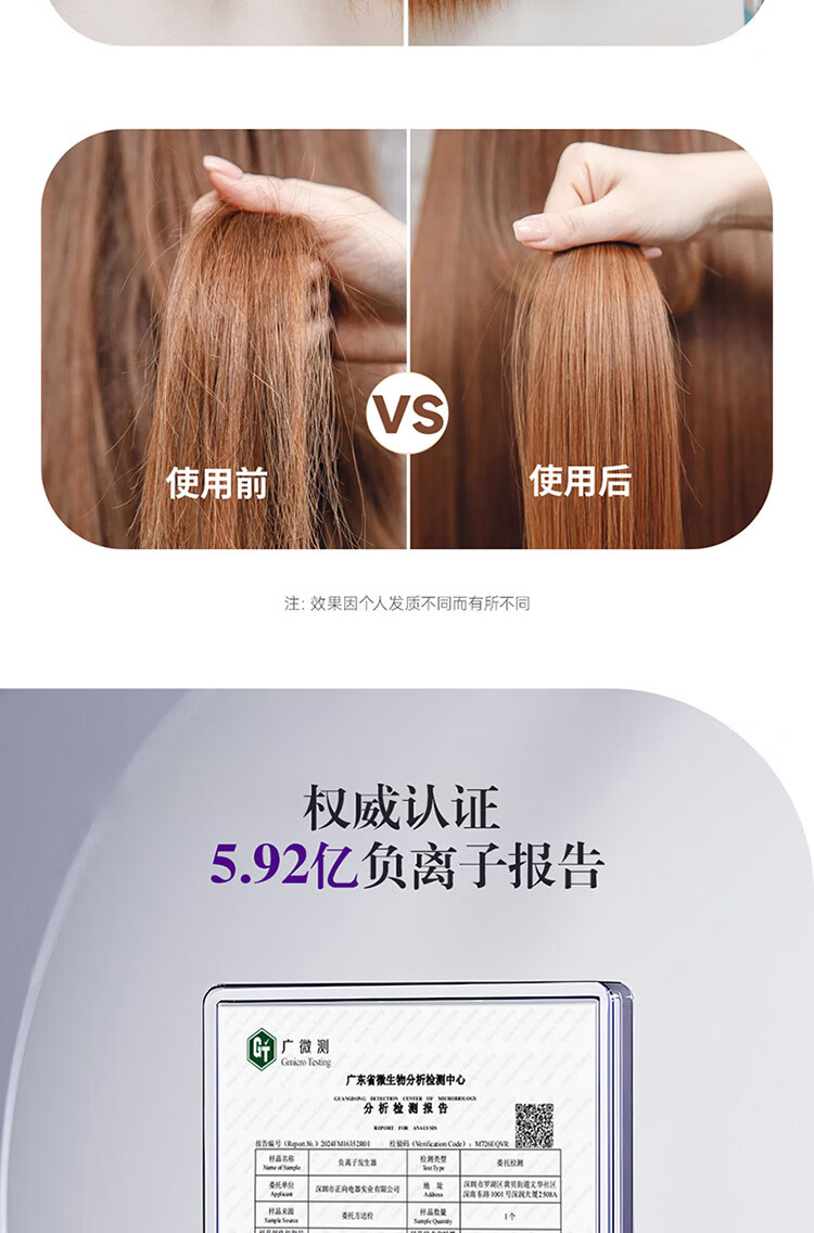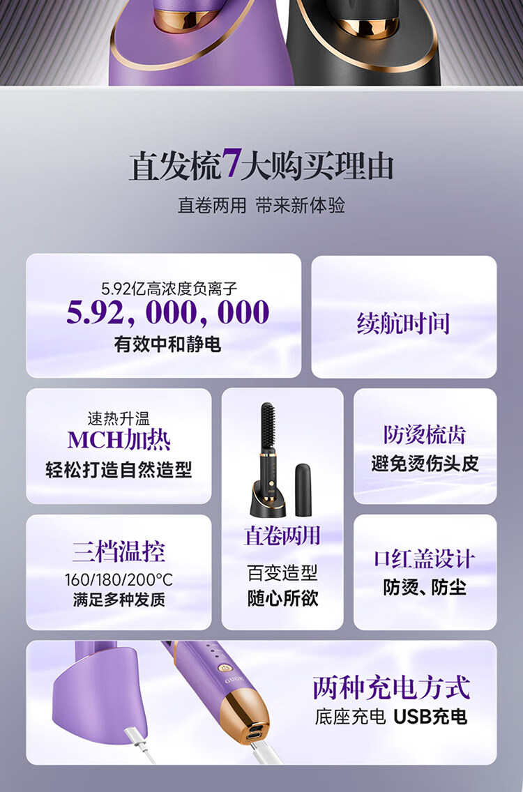 5.62亿负离子,减少头发损伤,抚平毛躁更有光泽;动力锂电池,高性能,长续航,更安全。;MCH发热板,升温快,定型效果好。