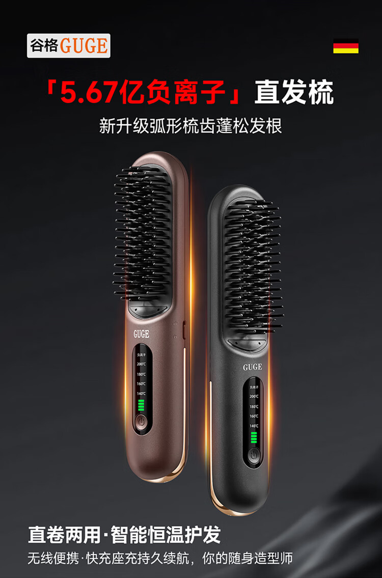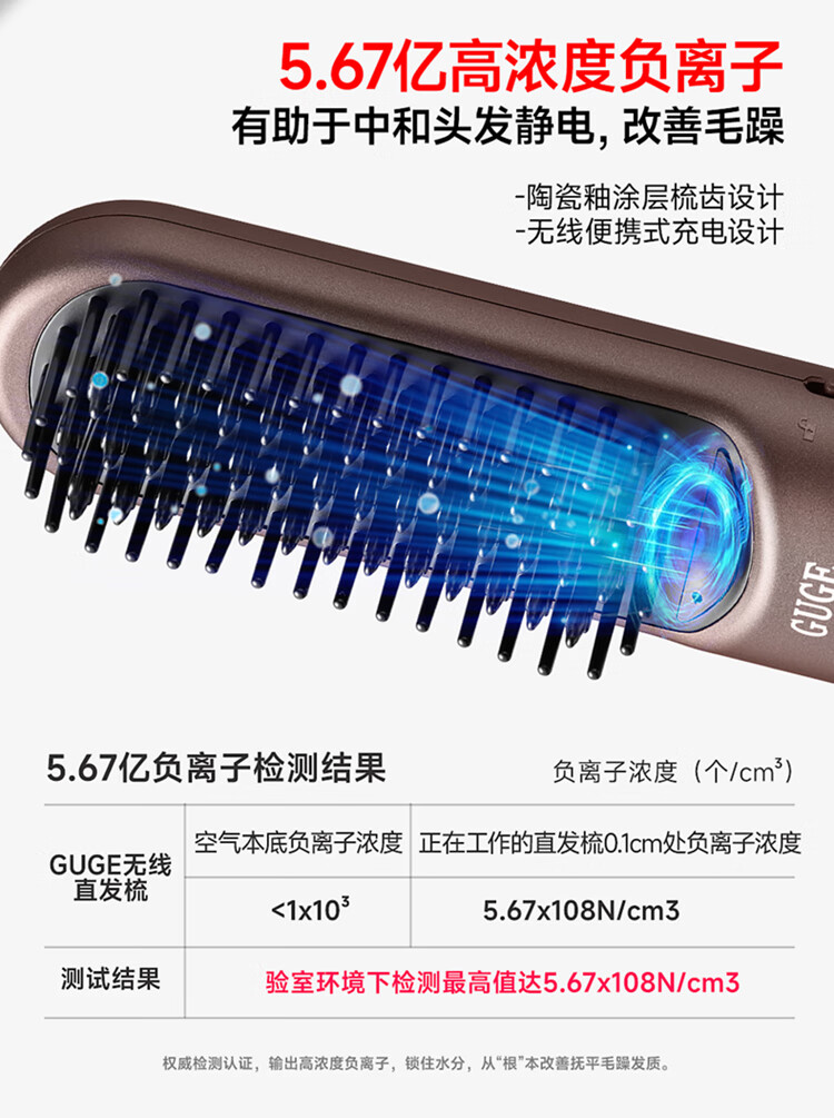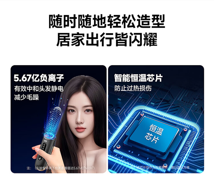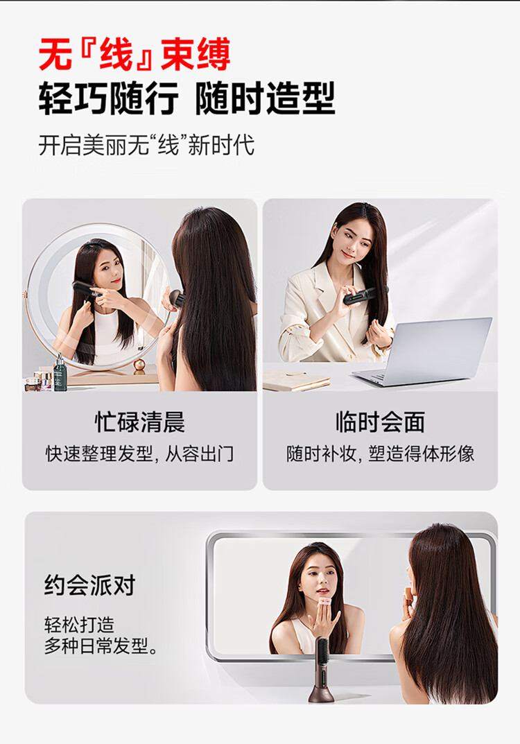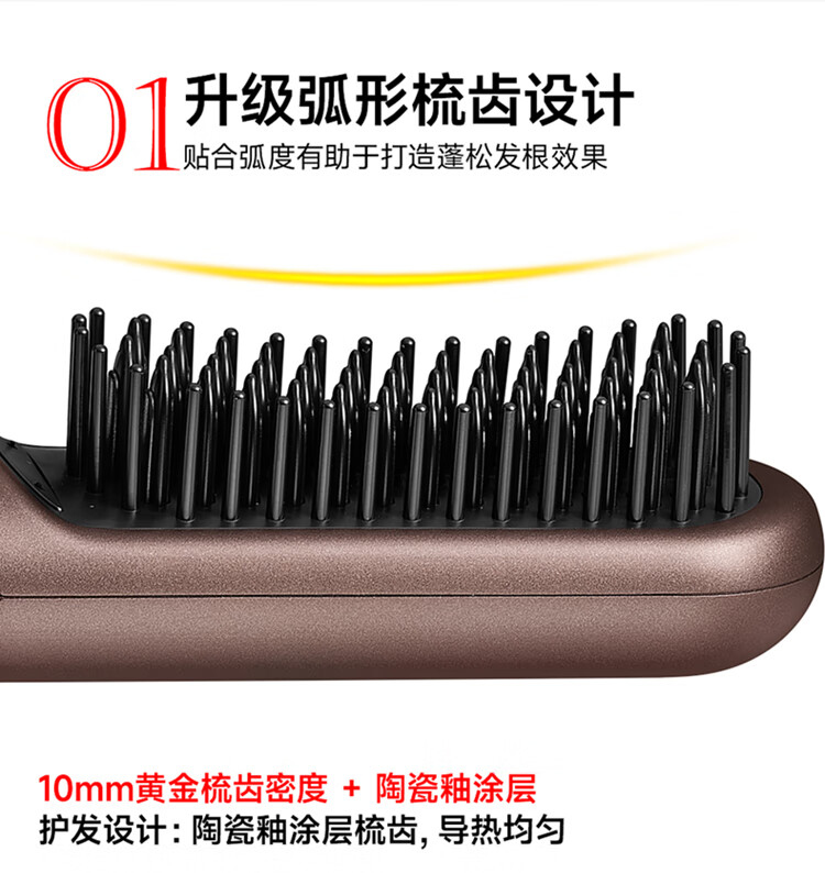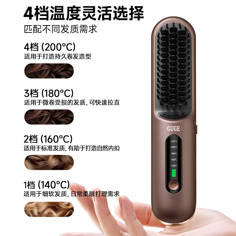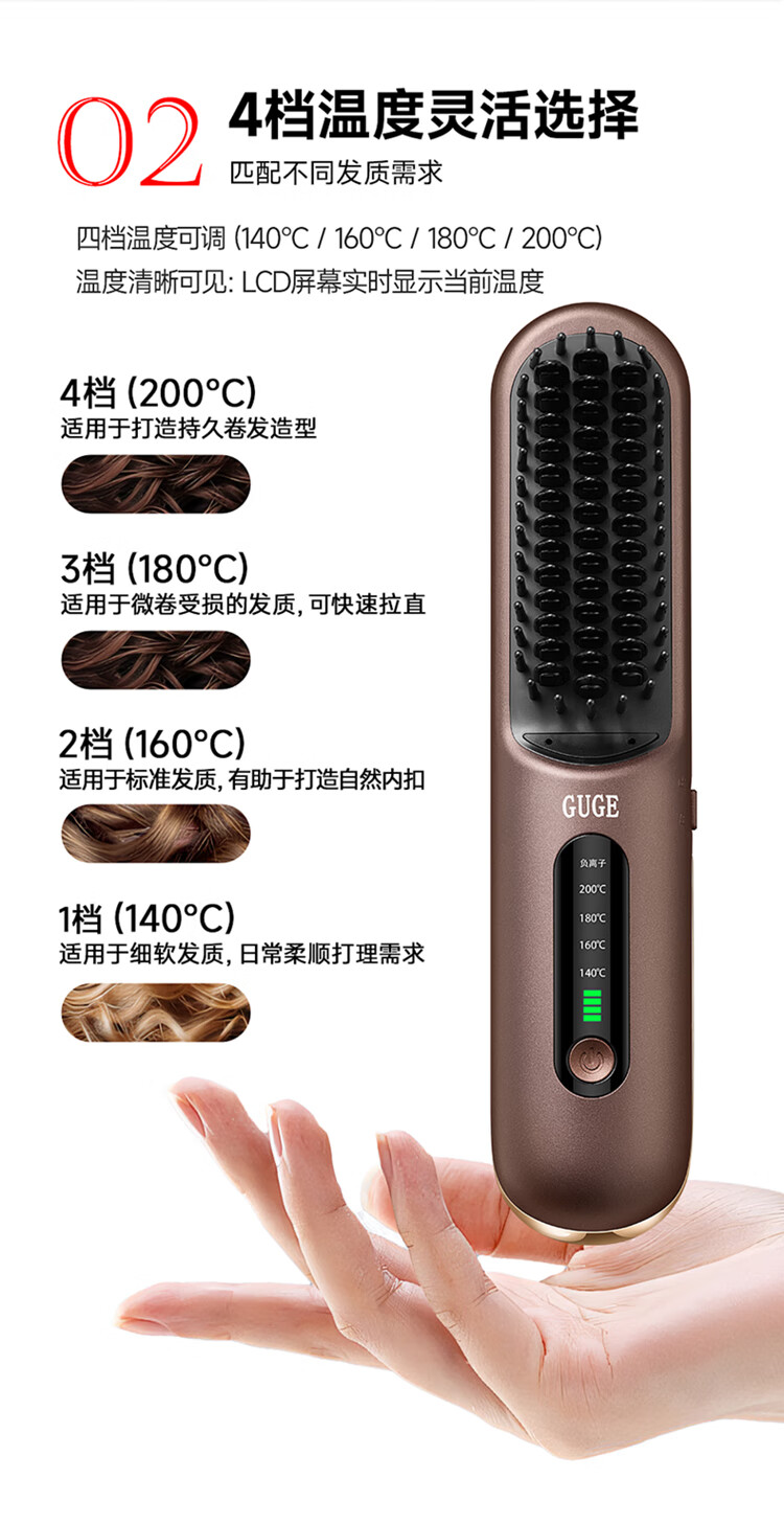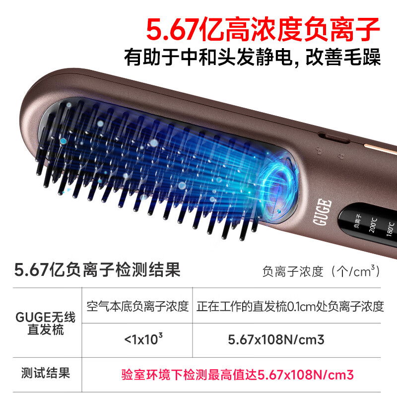 5.67亿负离子直发梳新升级弧形梳齿。;释放负离子 帮助秀发柔亮顺滑无线都能用 ;4档温度选择满足多种发质需求。