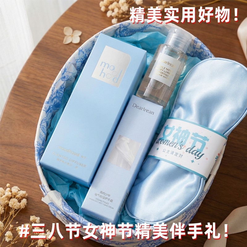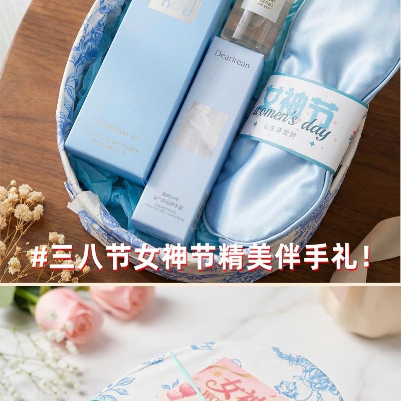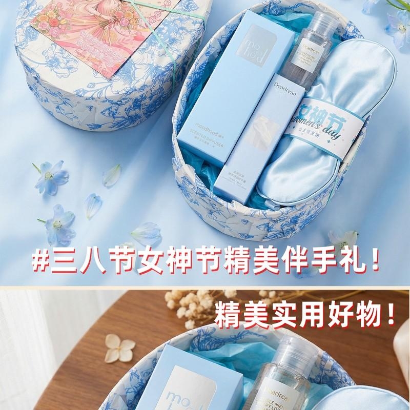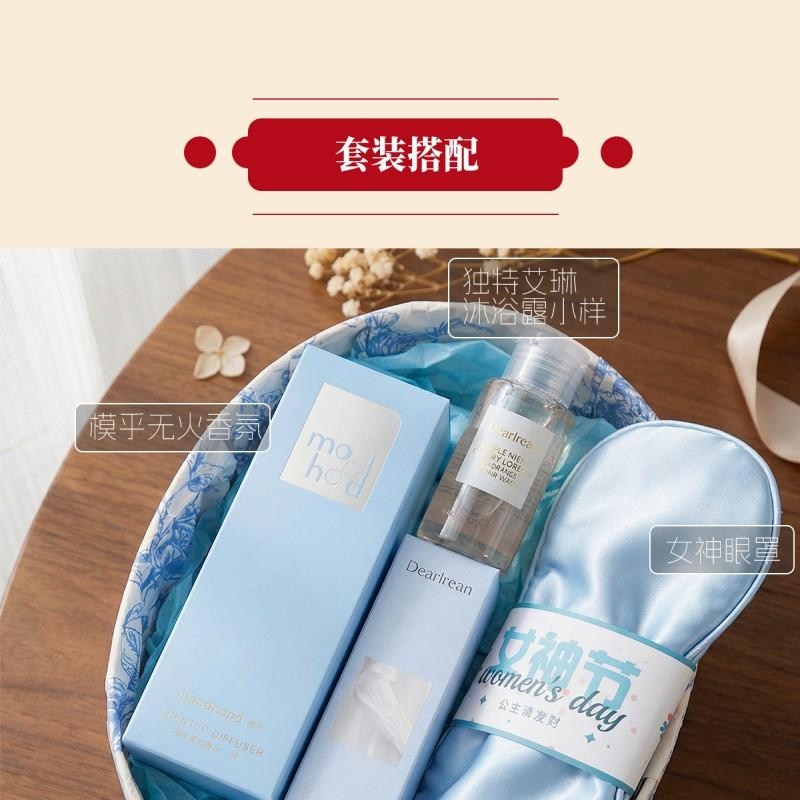 组合:女神节公主眼罩*1、独特艾琳香氛护手霜35g*1、独特艾琳沐浴露小样50ML*1、moodhood无火香氛液50ML*1
