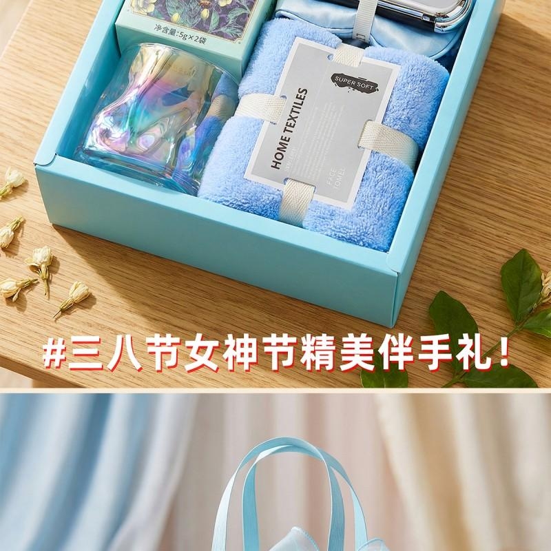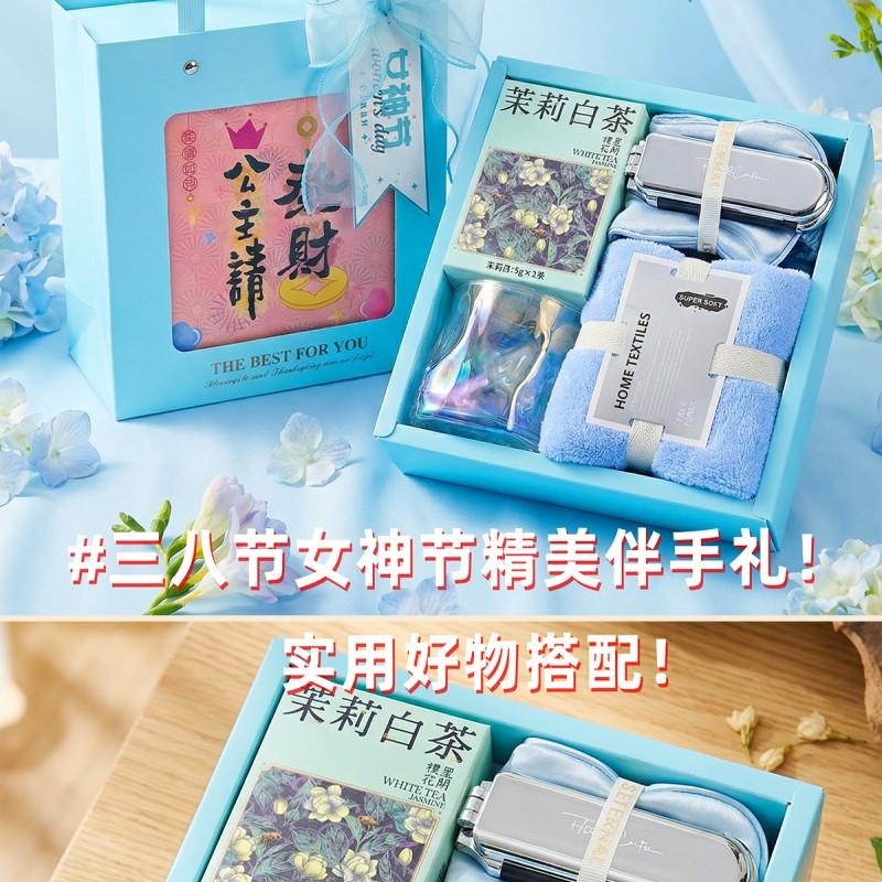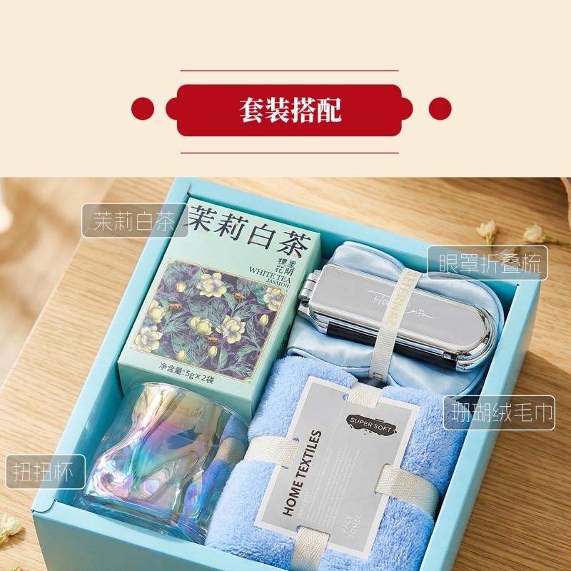 组合:扭扭玻璃杯*1、茉莉白茶5g*2袋、公主珊瑚绒毛巾75*34CM、女神节公主眼罩+折叠镜子头梳*1