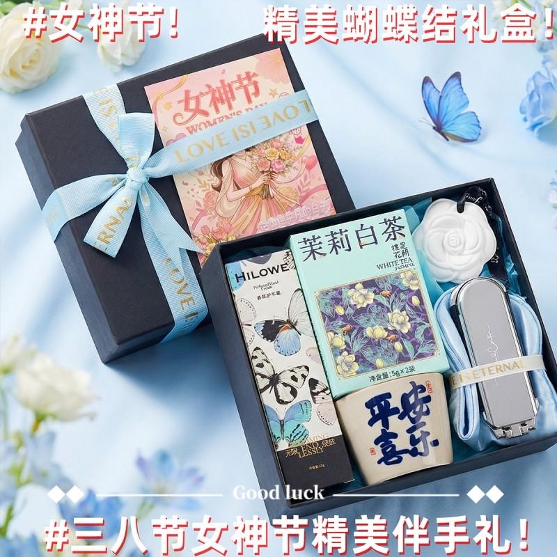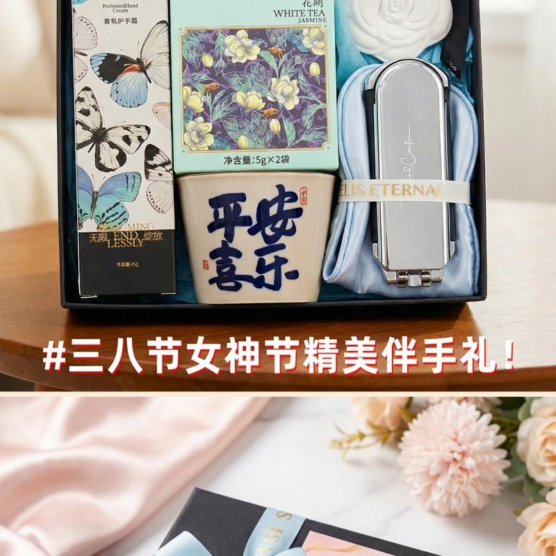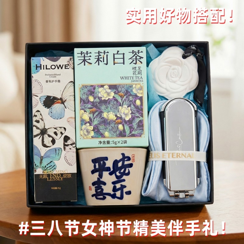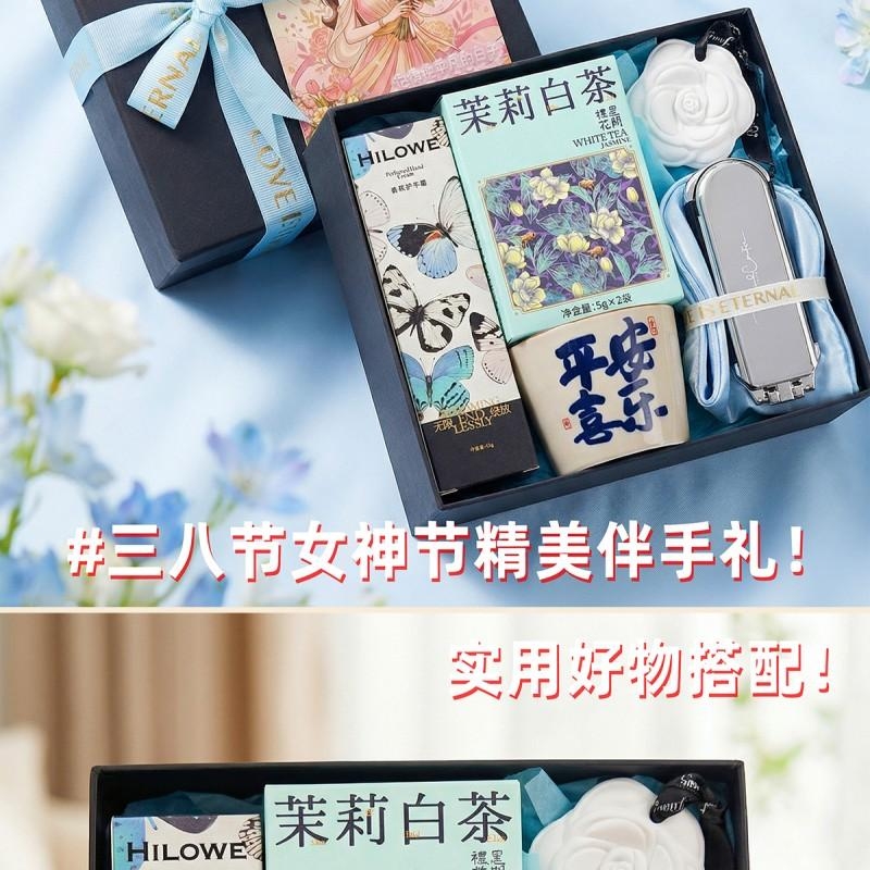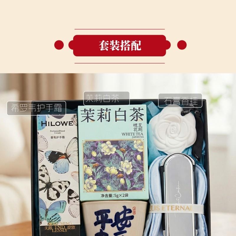 组合:茉莉白茶5g*2袋、平安喜乐主人杯*1、山茶花石膏香挂*1、HILOWE香氛护手霜45g*1、女神节公主眼罩+折叠镜子头梳组合1