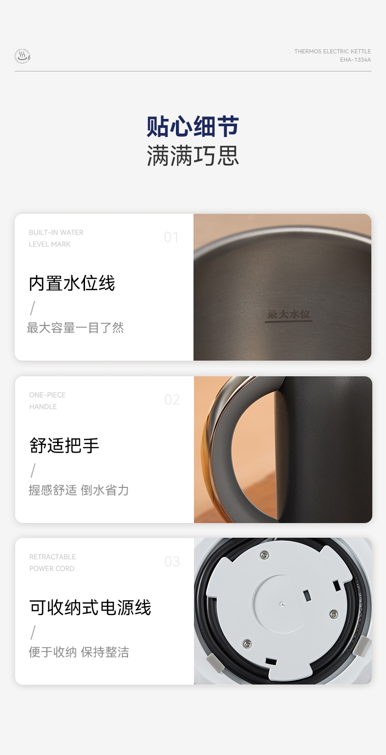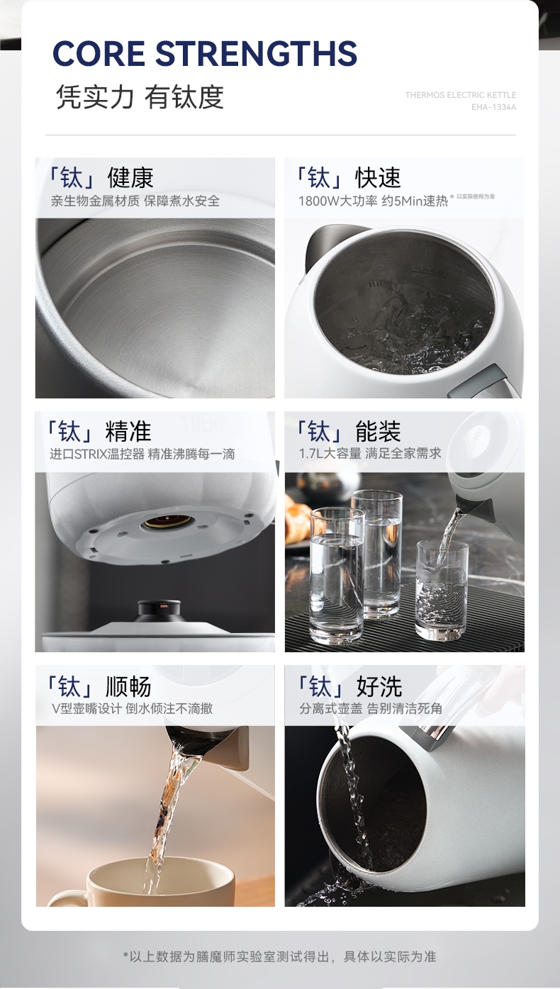 纯钛金属天然抗菌,抗酸碱,泡茶更鲜香;智能温控,控温精准,过热保护,自动断电,防干烧;壶身轻量设计,轻松倒水