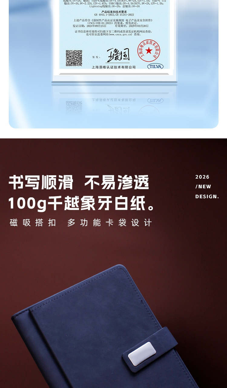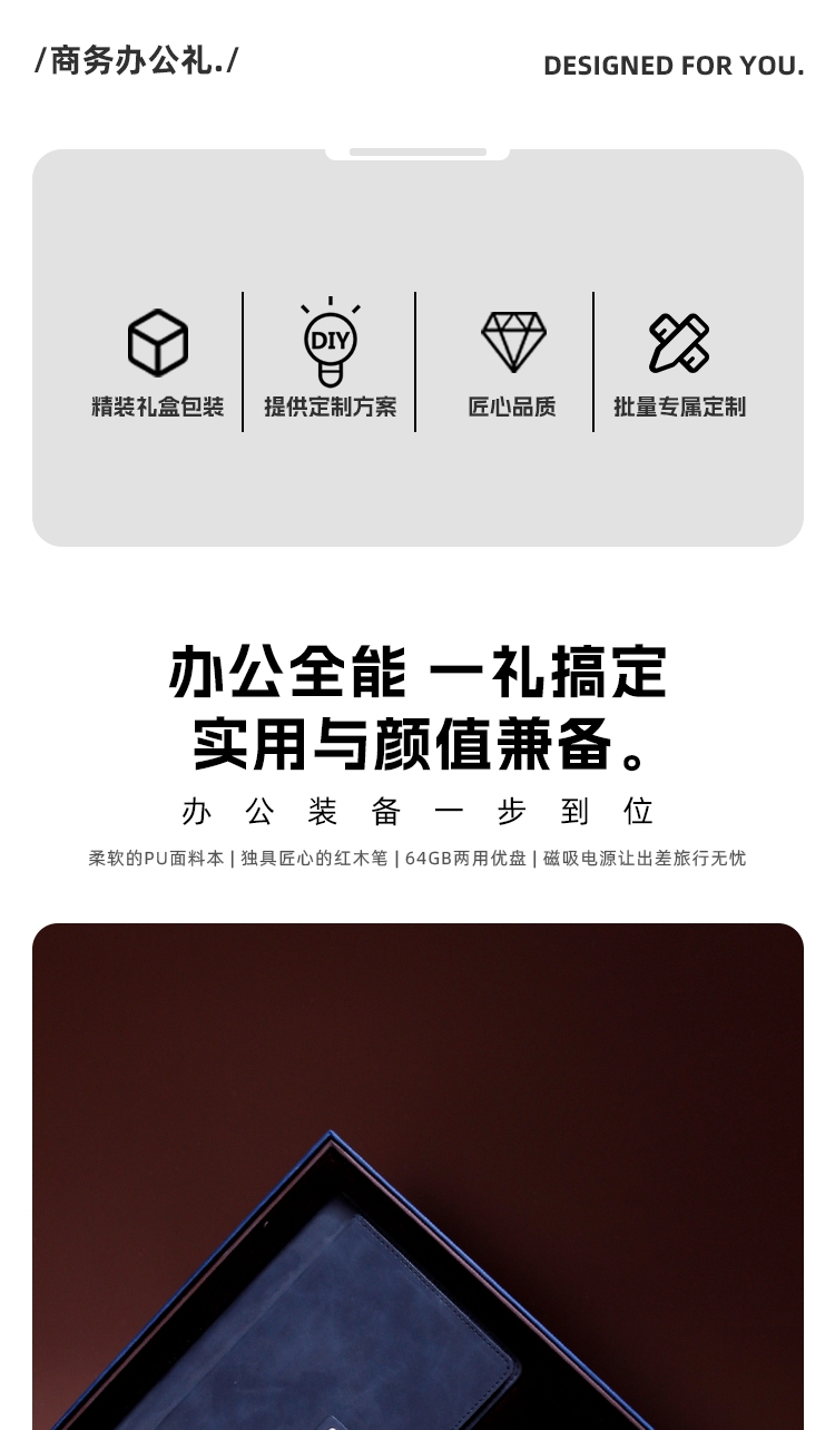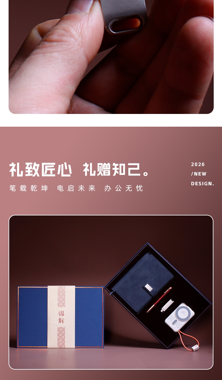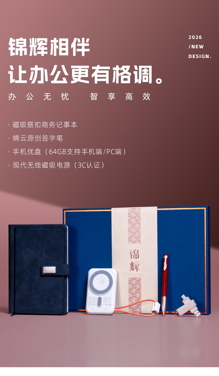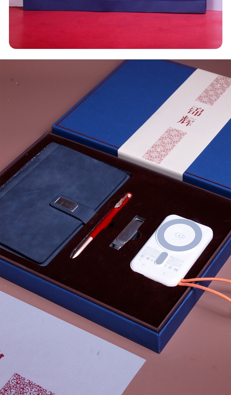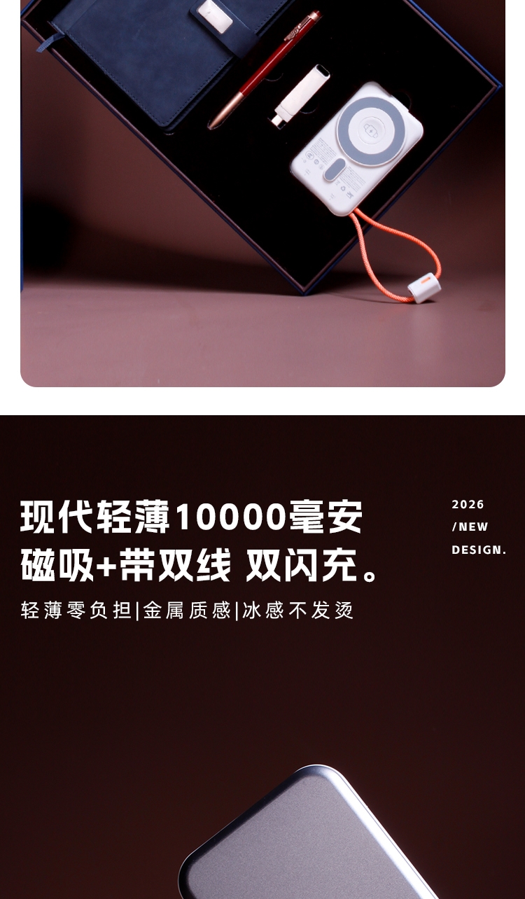 现代轻薄10000毫安磁吸+带双线 双闪充。;100g千越象牙白纸,磁吸搭扣 多功能卡袋设计;0.5mm笔芯 滚珠笔头纯铜笔头锌合金笔夹。;两用多功能优盘64GB支持手机端/pc端;360°旋转人性化方位卡点,掏出来就能方便办公。