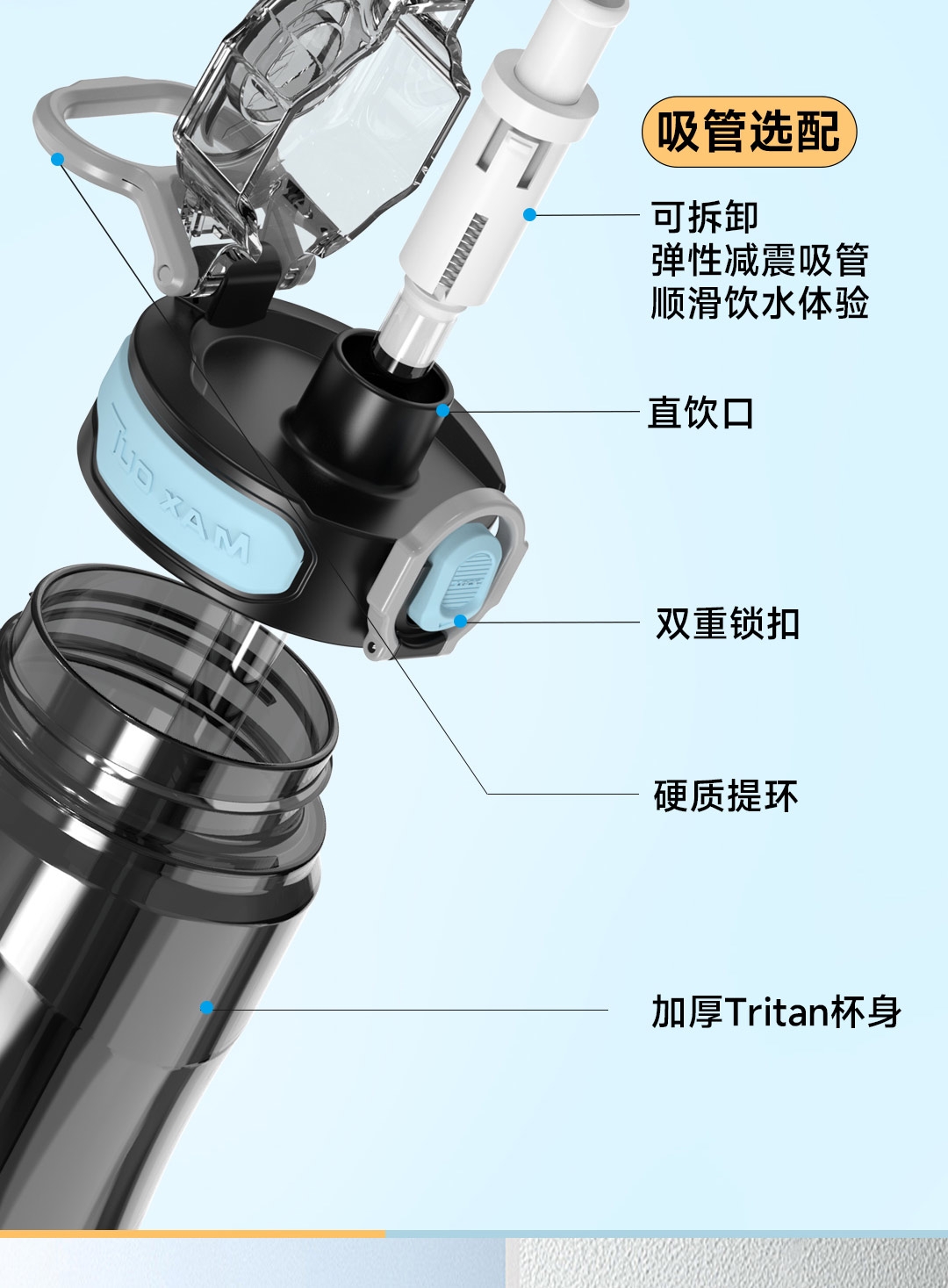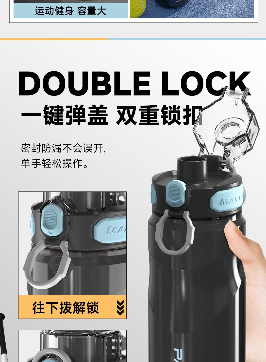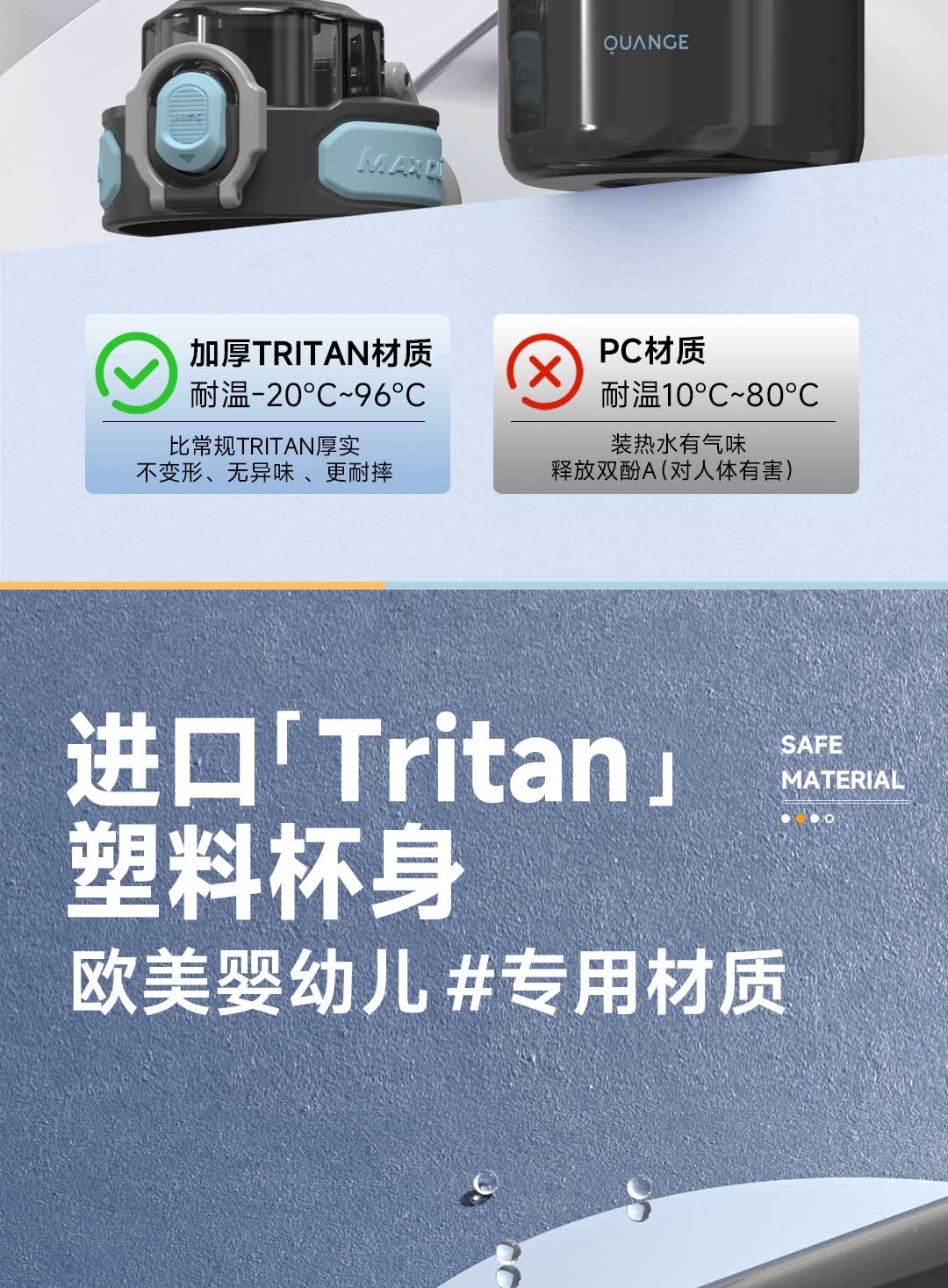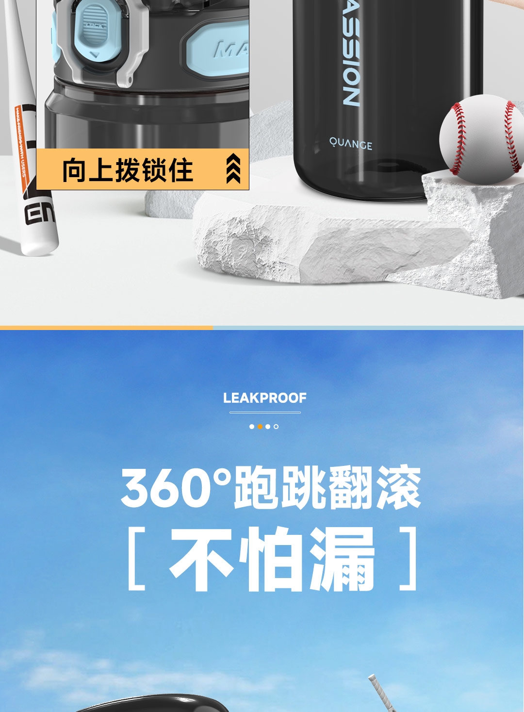Tritan母婴材质;一键弹盖,双重锁扣;便携提环