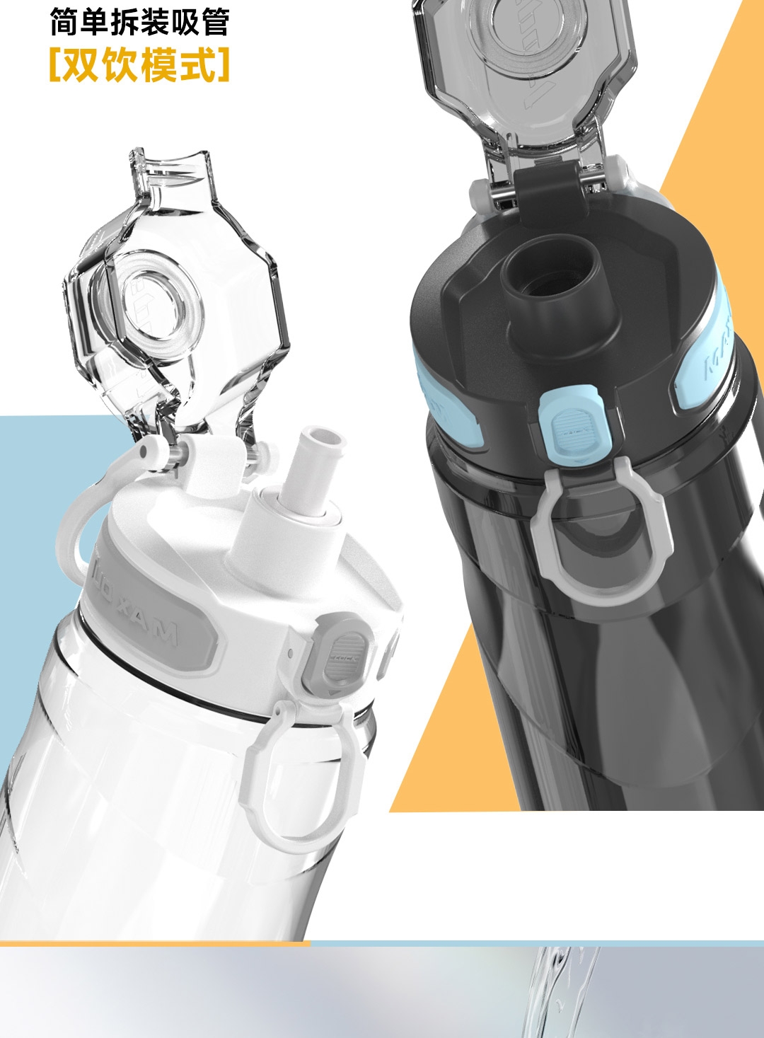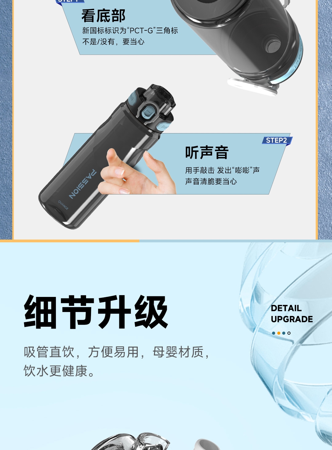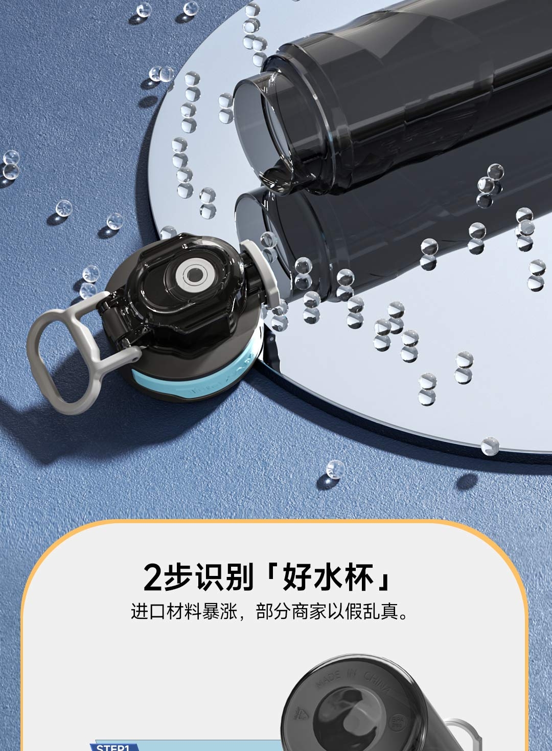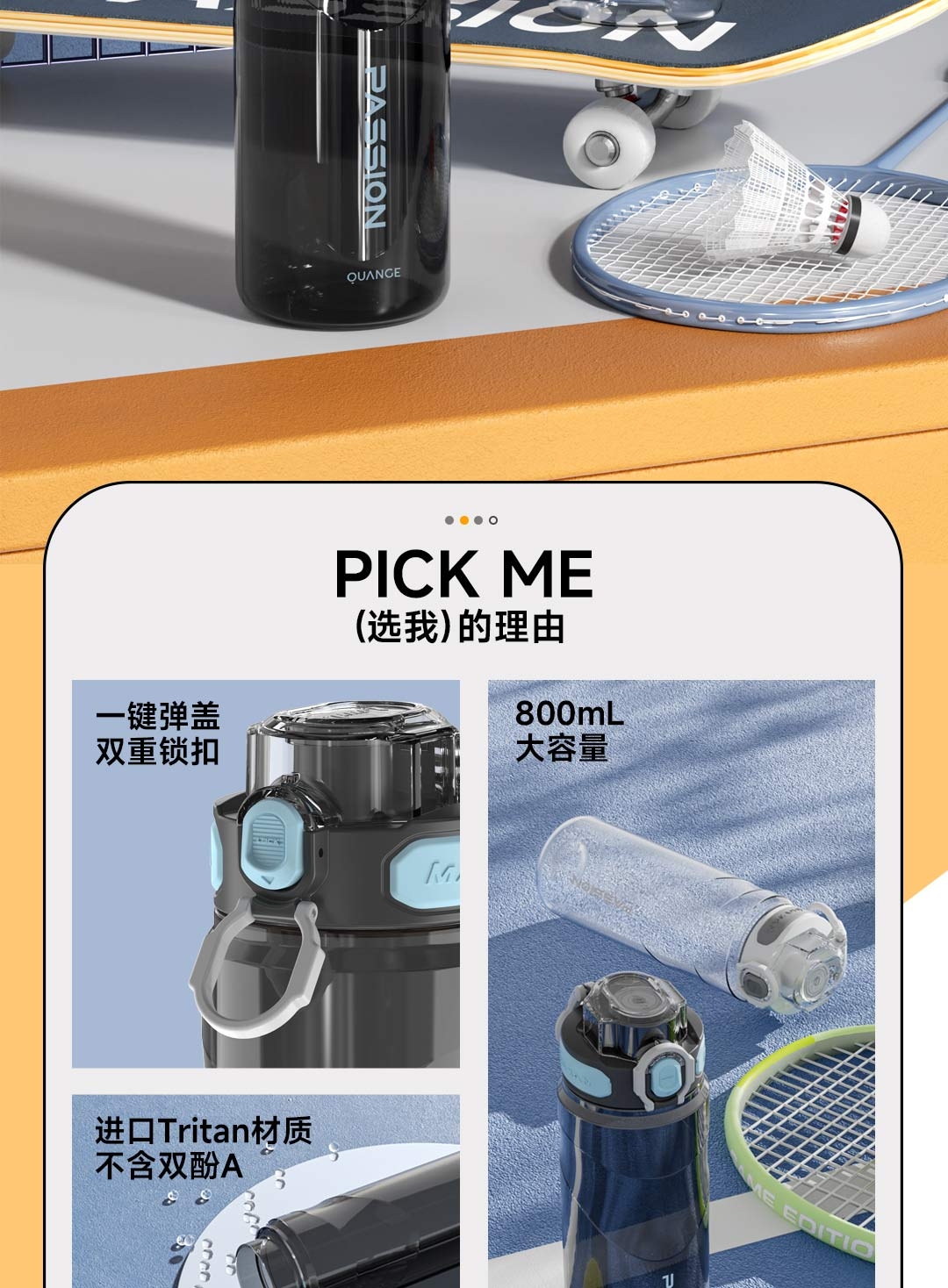 Tritan母婴材质;一键弹盖,双重锁扣;便携提环