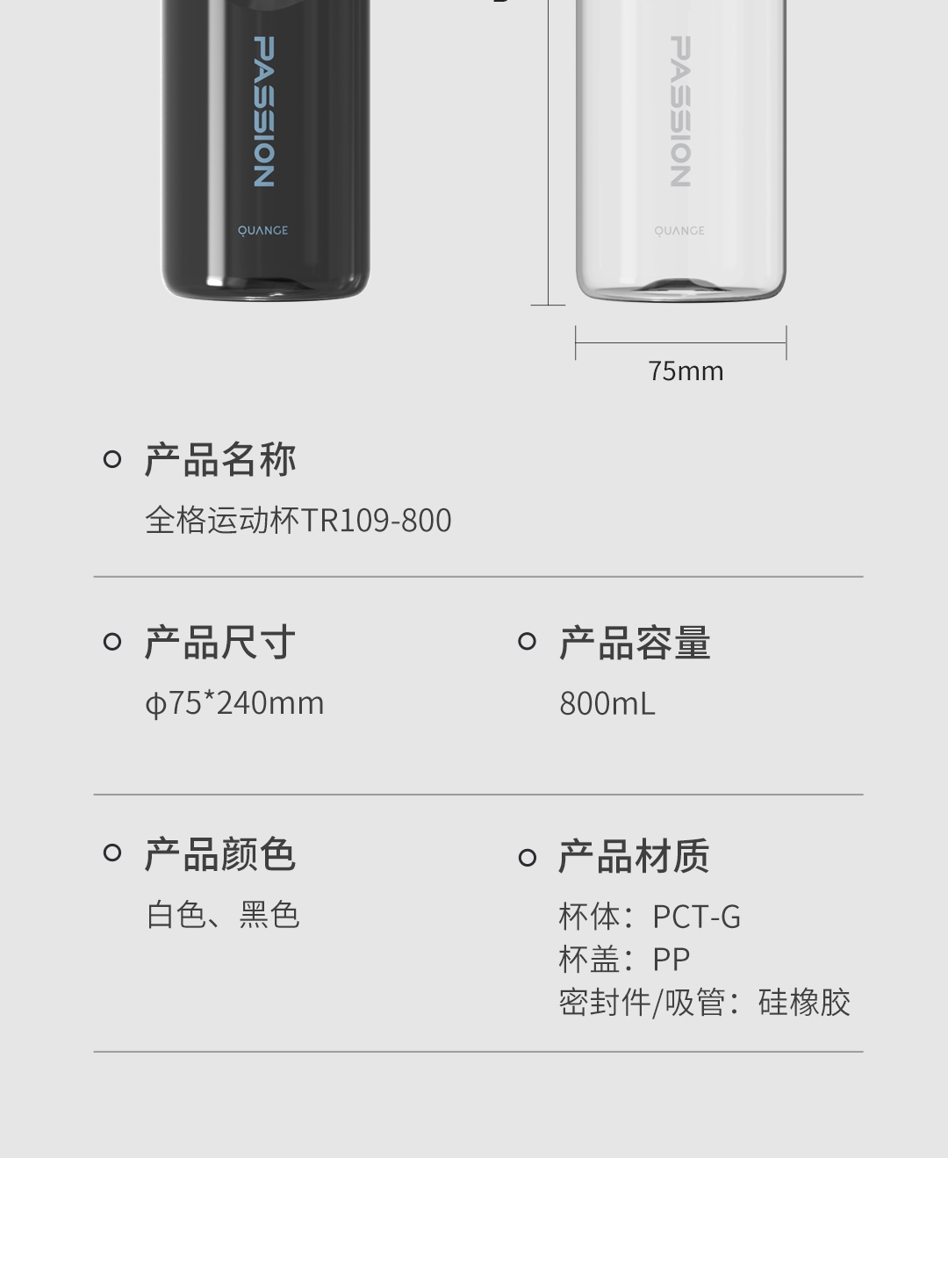 材质:杯身:共聚酯(Tritan),杯盖: PP、密封垫:硅橡胶