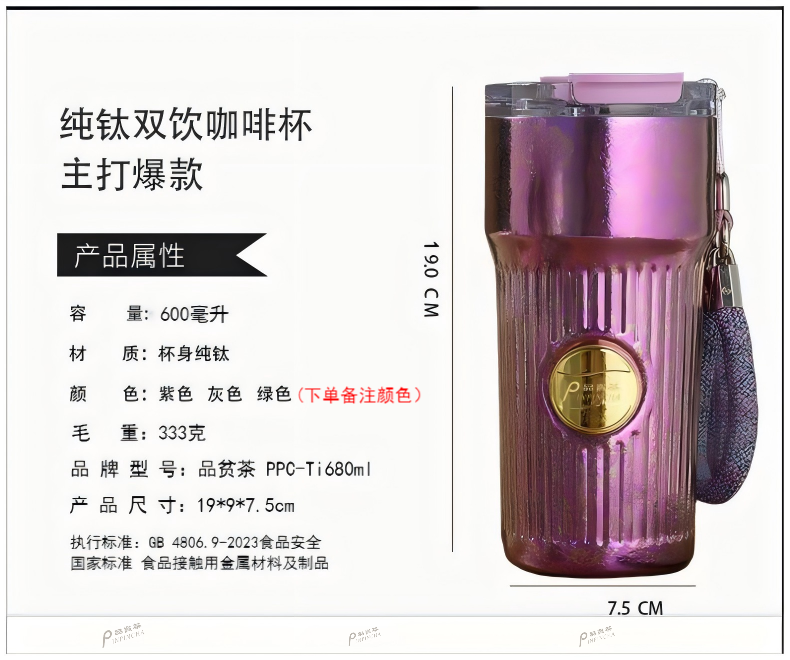 品贫茶 纯钛大容量双饮保温杯PPC-Ti-600ml
